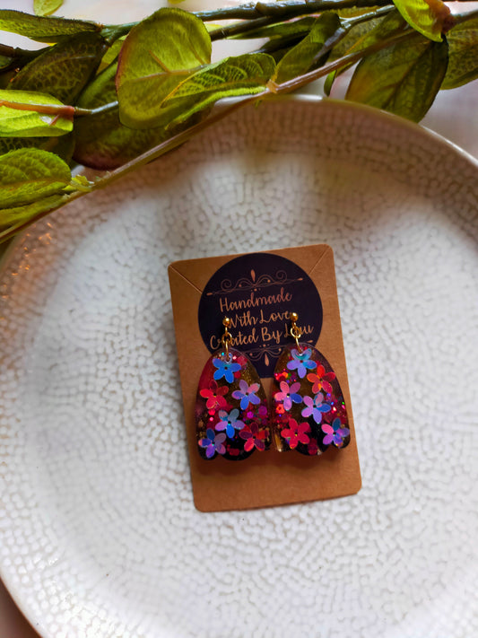 "Mae" Multi Black Gold Oval Flower Sparkle Resin Dangle Earrings