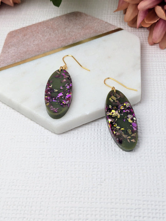 "Mae" Khaki Purple Sparkle Resin Dangle Earrings