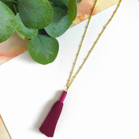 "Noa" Wine Tassel Necklace with Pink Metal wrap