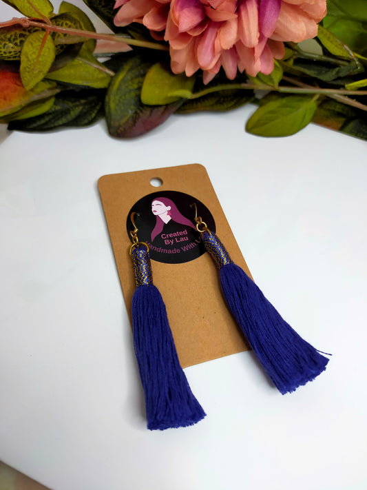 "Kaylee" Denim Blue Tassel Earrings with Metallic Wrap