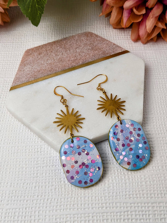 "Ada" Polymer Clay Earrings - Oval Dangles with Brass Sun Charm