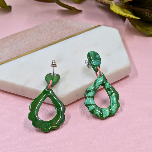 "Angeline" Green Leaf Pattern Flower Petal Polymer Clay Stud Dangle