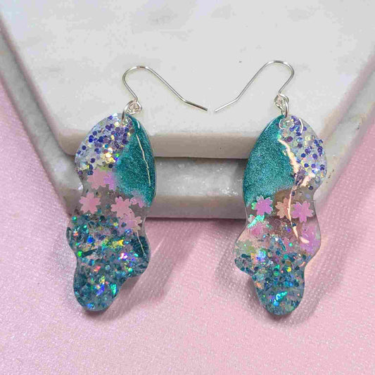 Odette Aqua Iridescent Flower Glitter Dangle Earrings - Handmade UK