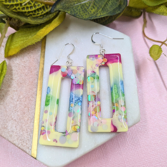 Nora Rainbow Dottie Glitter Rectangle Cut Out Resin Dangle Earrings | Pastel Sparkle by Created By Lau