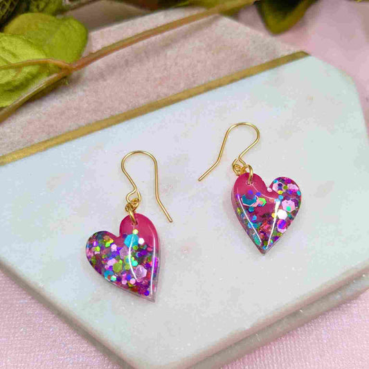 Ria Multi Glitter & Pink Heart Dangle Earrings - Handmade Yorkshire Jewellery