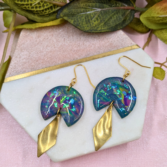 Sacha Blue Iridescent Dangle Earrings | Wavy Diamond Brass Charm by Created By Lau