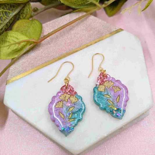Tamia Aqua Glitter & Pink Moroccan Floral Dangle Earrings - Handmade Yorkshire Jewellery