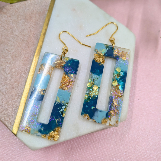 Nora Teal & Gold Glitter Rectangle Cutout Resin Dangle Earrings - Gold Plated - Handmade Yorkshire