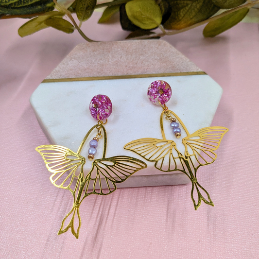 "Arlene" No Waste Pink Mystical Foil Resin Stud Dangles with Luna Moth Charm and Recycled Beads
