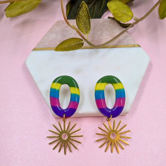 "Felecia" Rainbow Oval Polymer Clay Stud Dangle with Sun Brass Charm