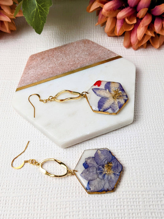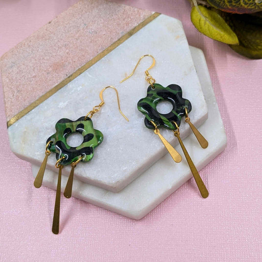 Lora Abstract Polymer Clay Earrings - Real Flower Brass Charm UK