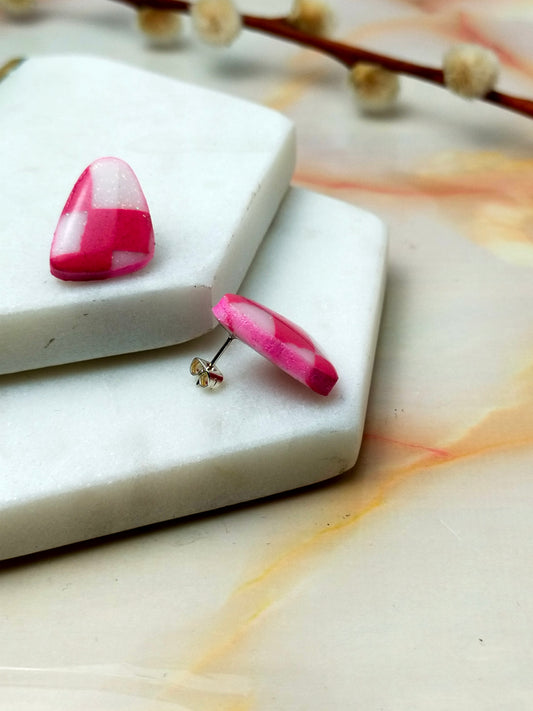 "Helena" Pink & White Checkerboard Abstract Stud Earrings
