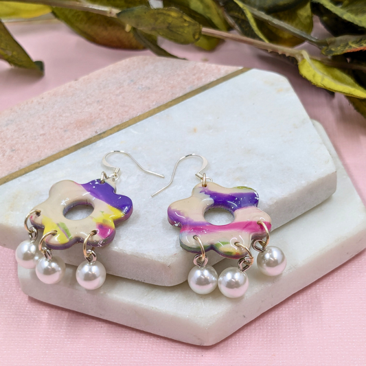 "Janelle" Abstract Flower Polymer Clay Dangle with Pearl Charm