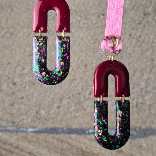 "Radley" Mulberry Wine Glitter Arch Resin Dangle Earrings With Real Flowers