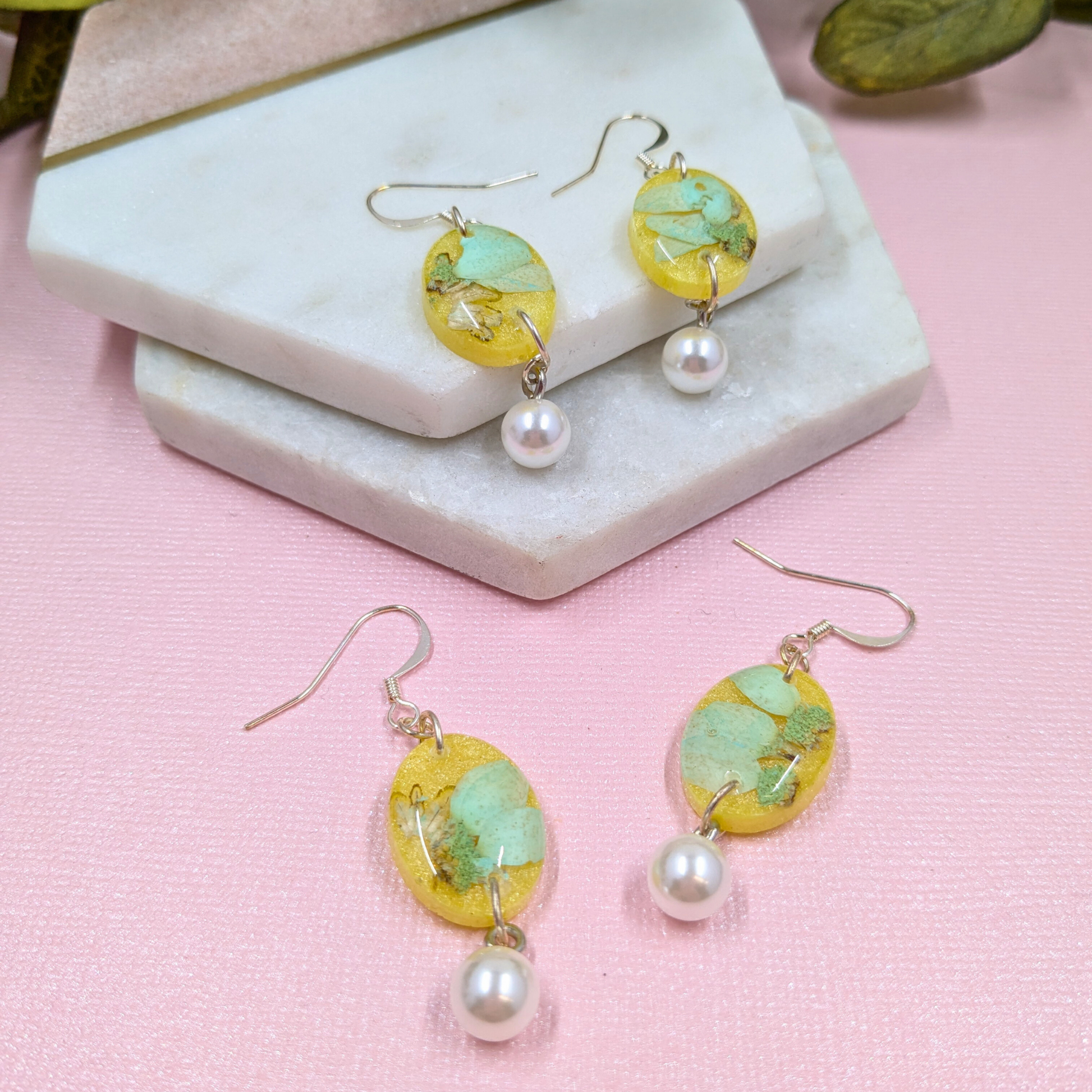 Elevate your style with our handmade "Alana" No Waste Aqua Real Flowers Lemon Resin Oval Dangle with Pearl Charm. Embrace sustainability with this unique piece from our no-waste collection, featuring broken flowers captured in beautifully translucent resin. Make a statement with the lemon-coloured background and silver plated hook, complete with a dangling pearl charm.