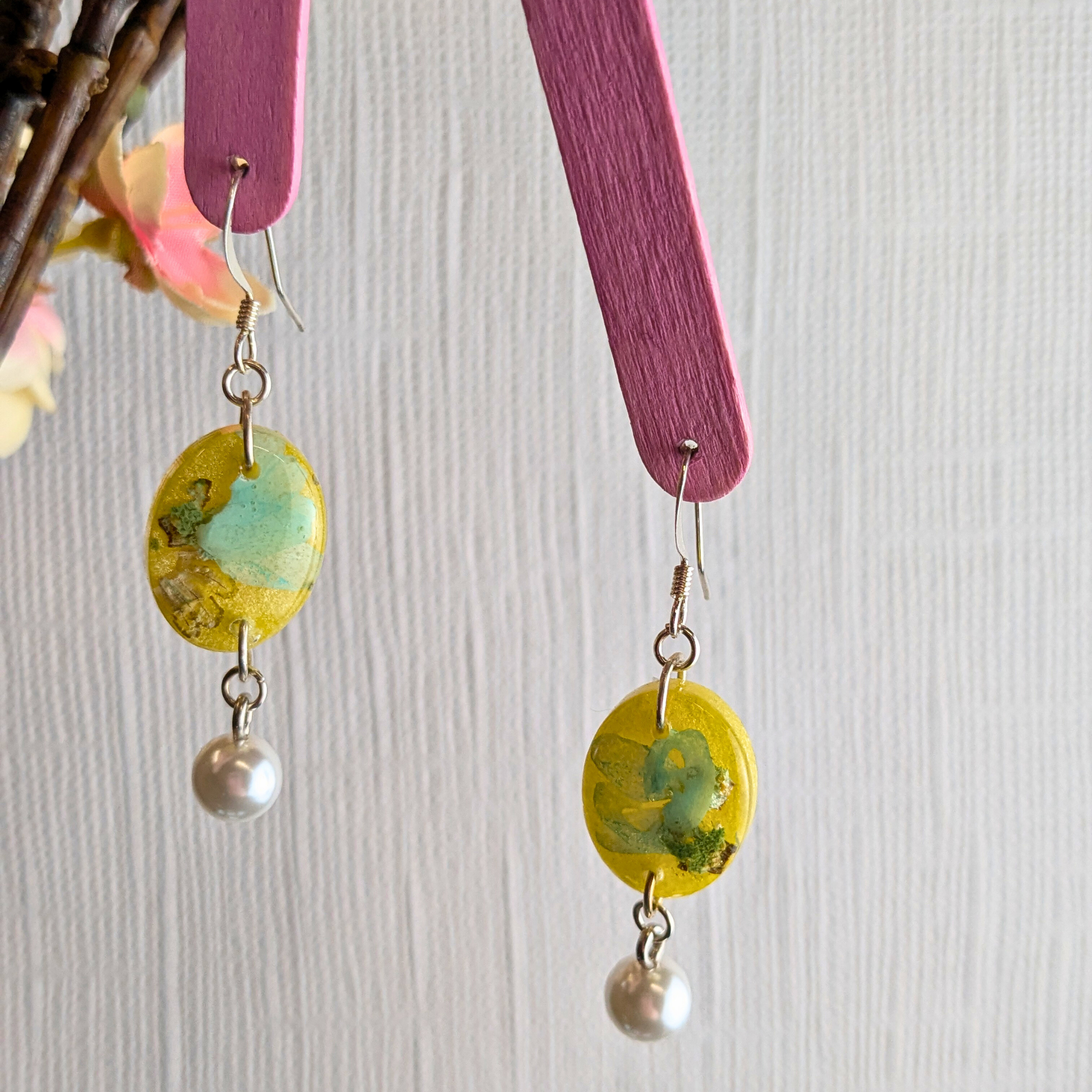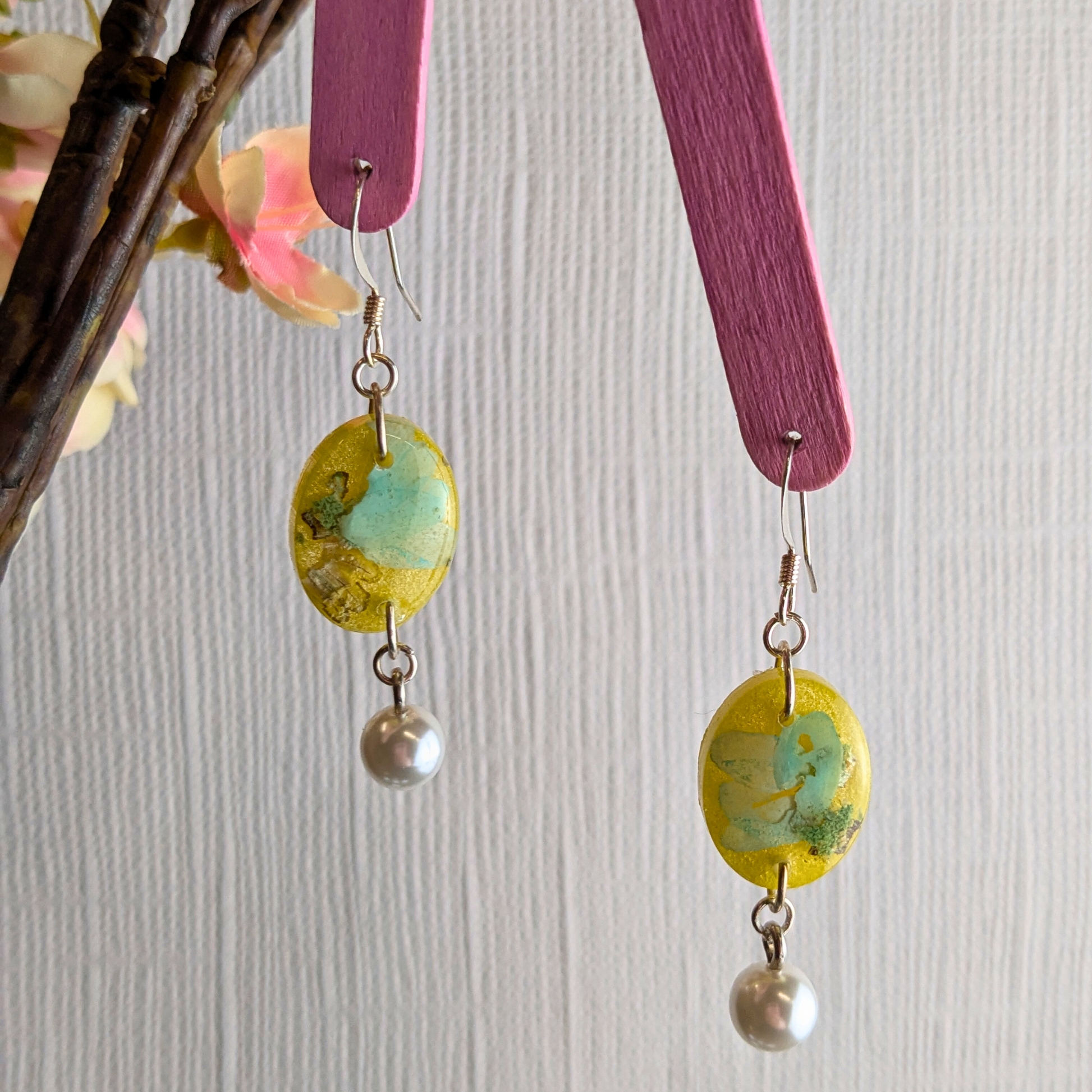 "Alana" No Waste Aqua Real Flowers Lemon Resin Oval Dangle with Pearl Charm