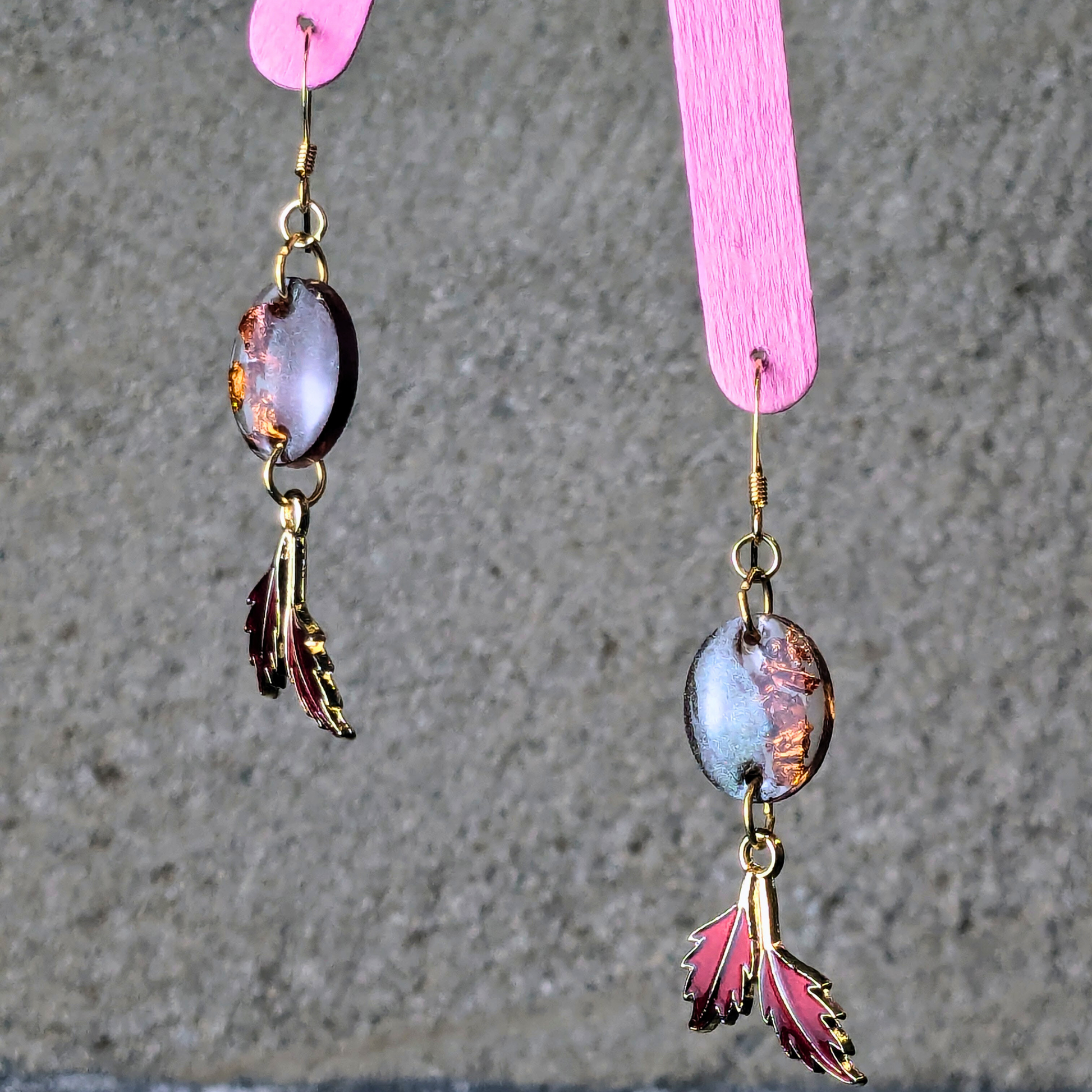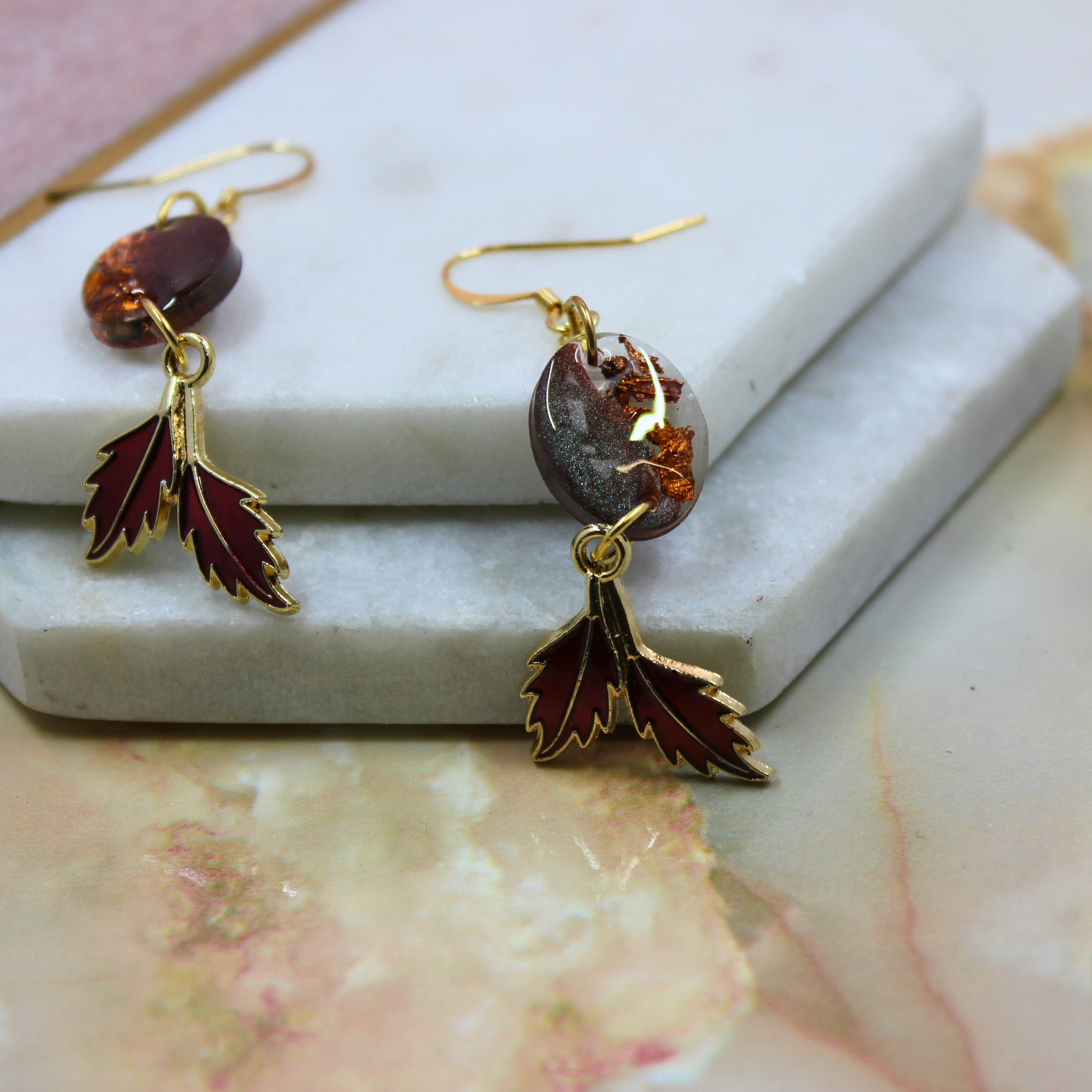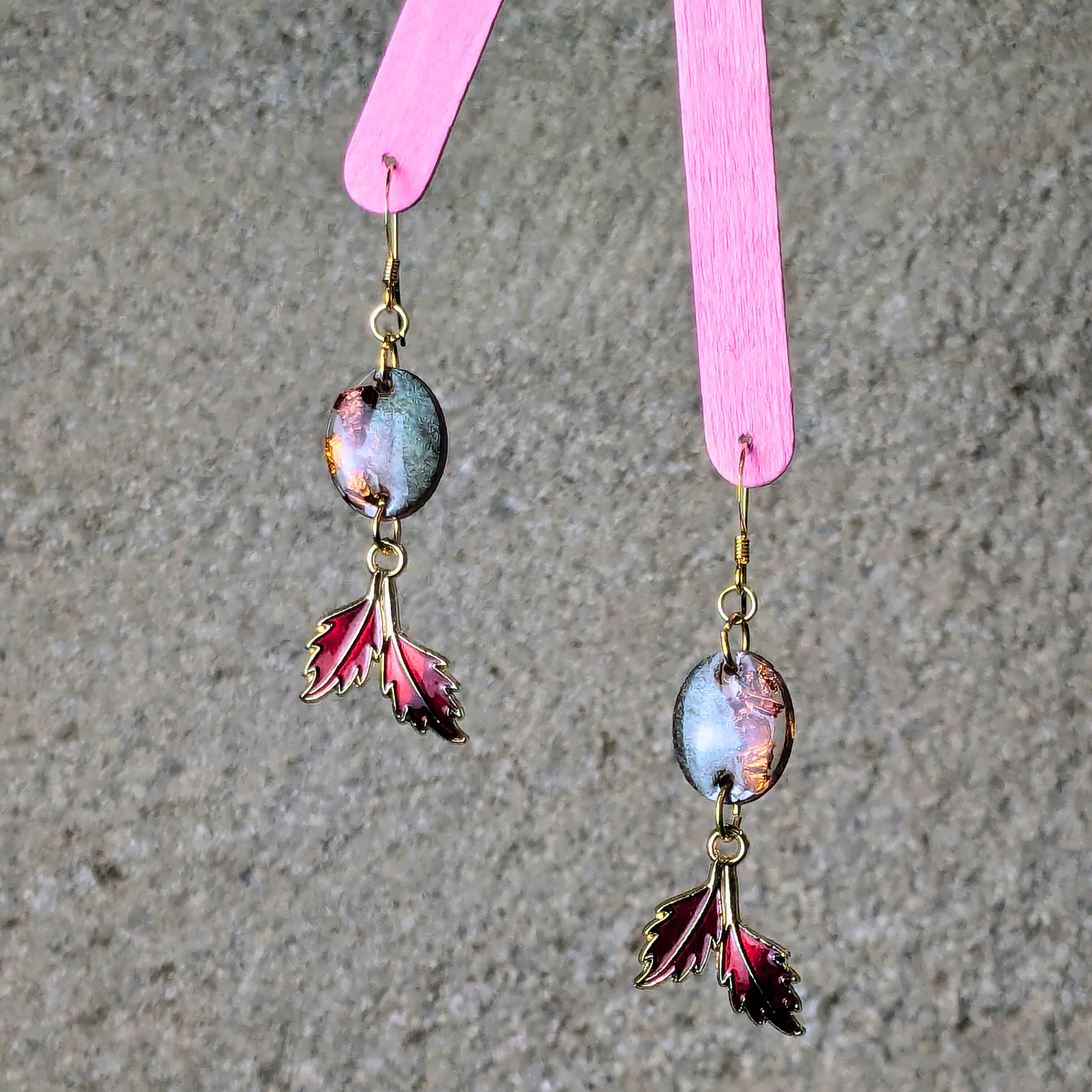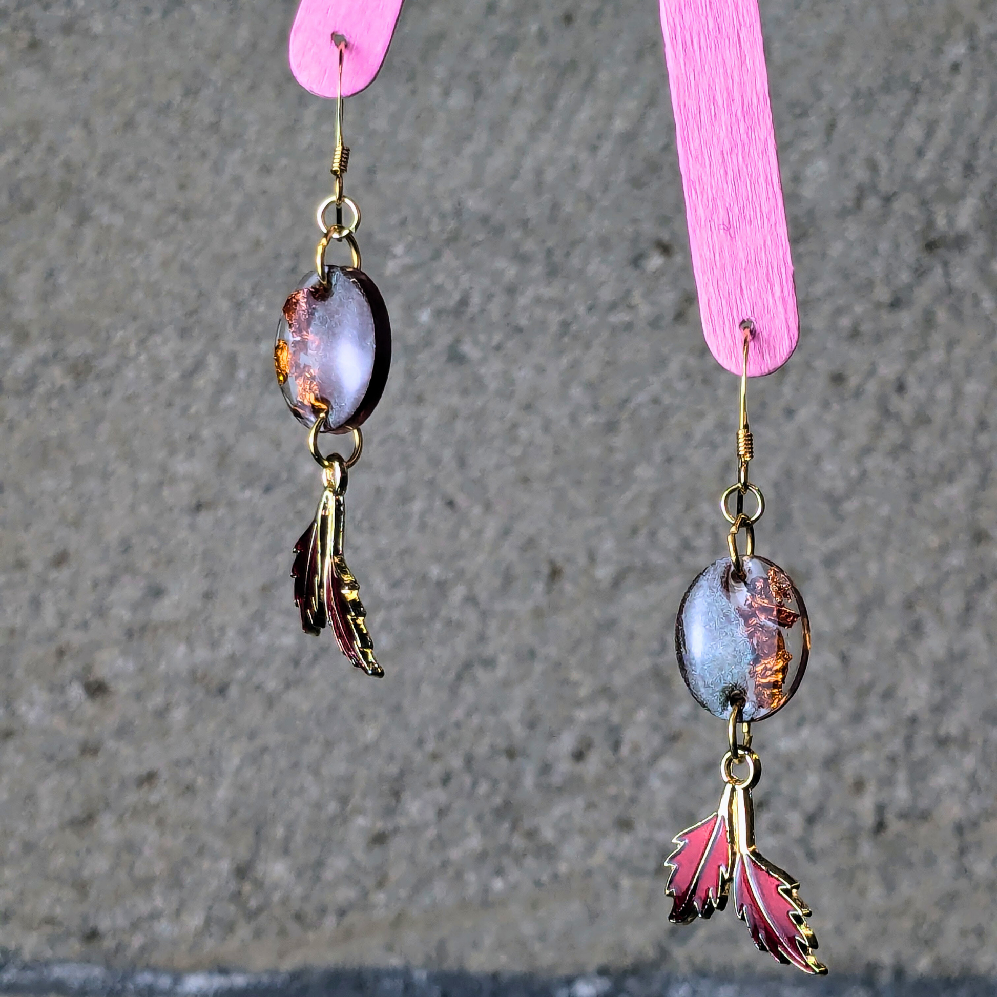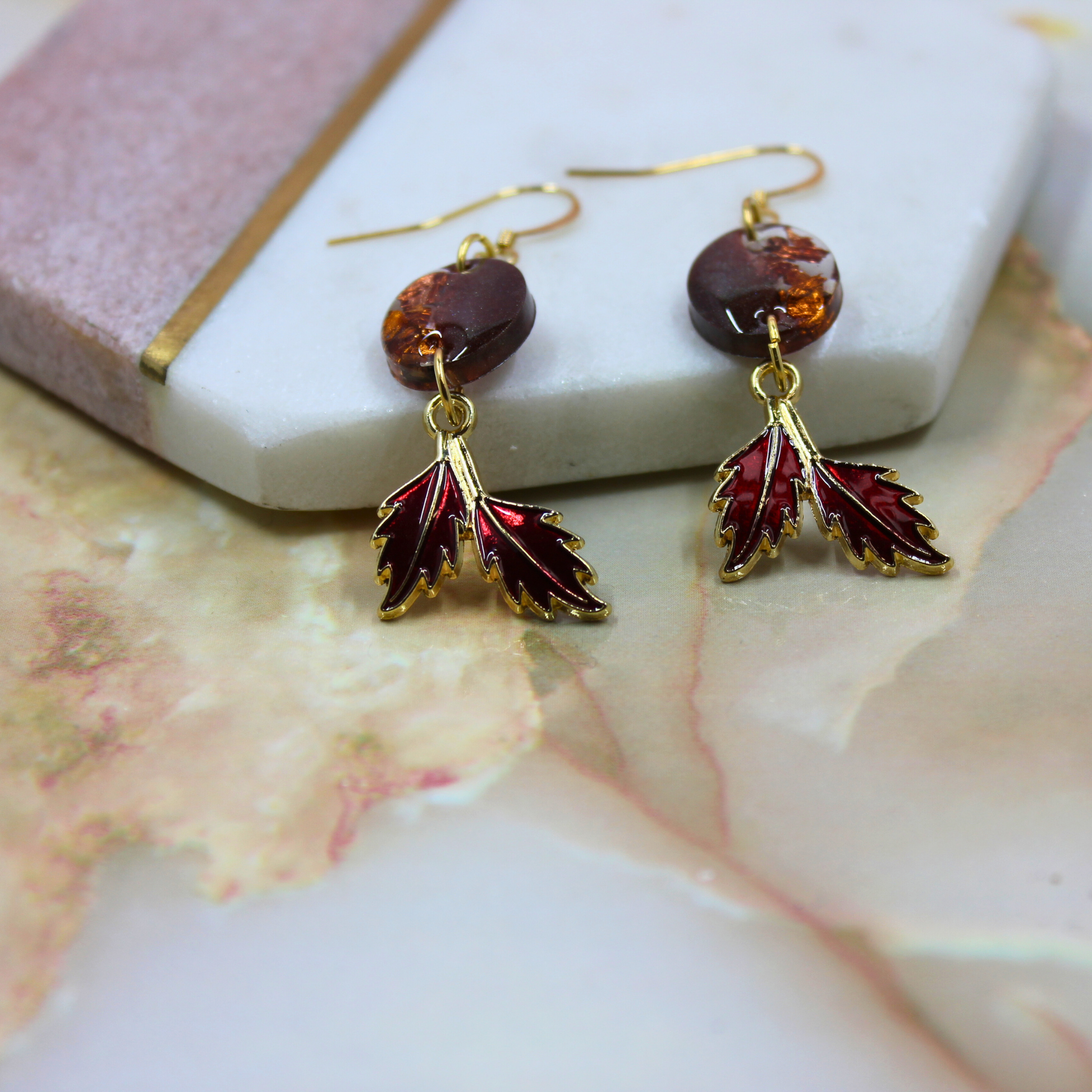 "Amber" Brown Amber Oval Shaped Resin Dangle Earrings with Red Leaf Charm