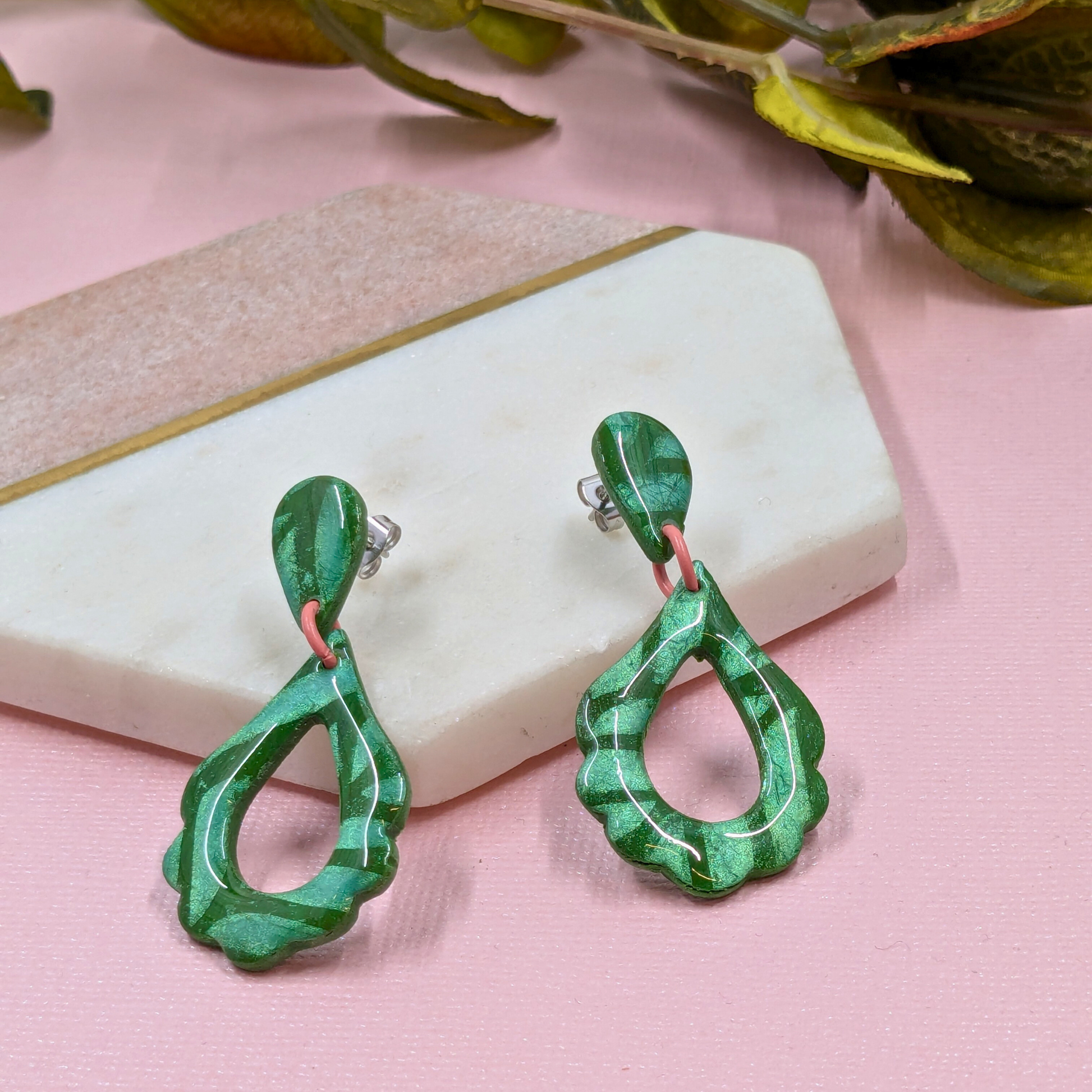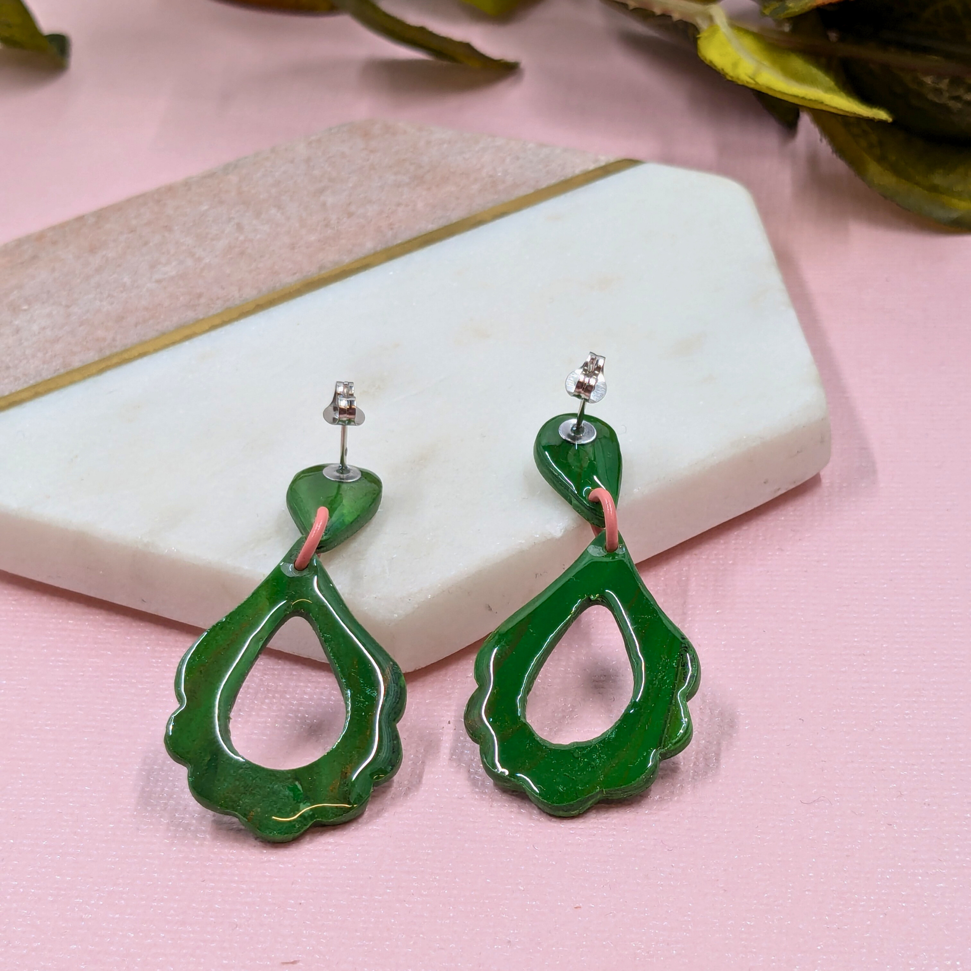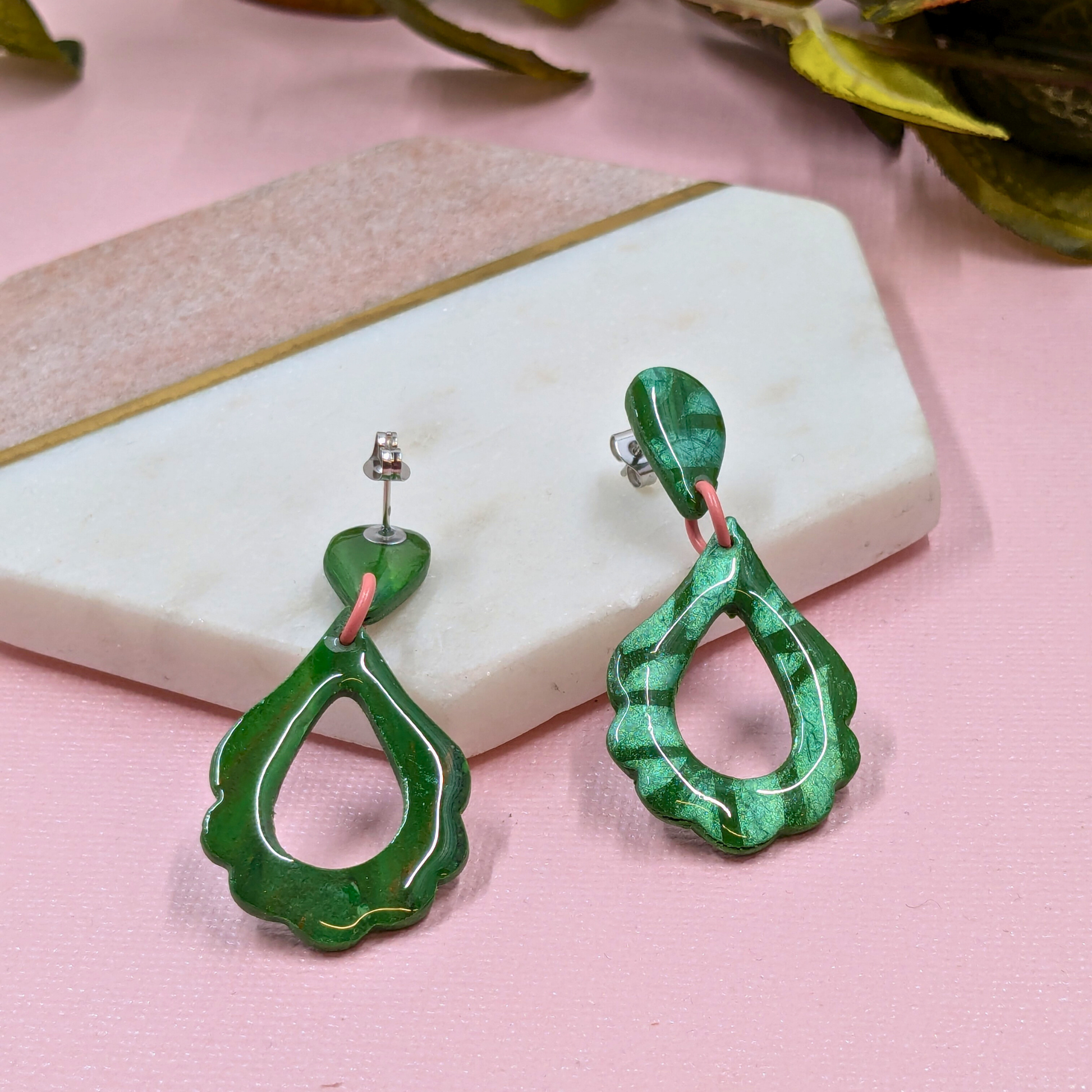 Indulge in the beauty and charm of our "Angeline" Green Leaf Pattern Flower Petal Polymer Clay Stud Dangle. Each resin-coated piece is handmade in our West Yorkshire studio, featuring a stunning green metallic leaf pattern on a delicate flower petal shape. The pink jump rings and stainless steel stud post and scroll add the perfect touch of elegance. Enchant and inspire with this unique accessory.