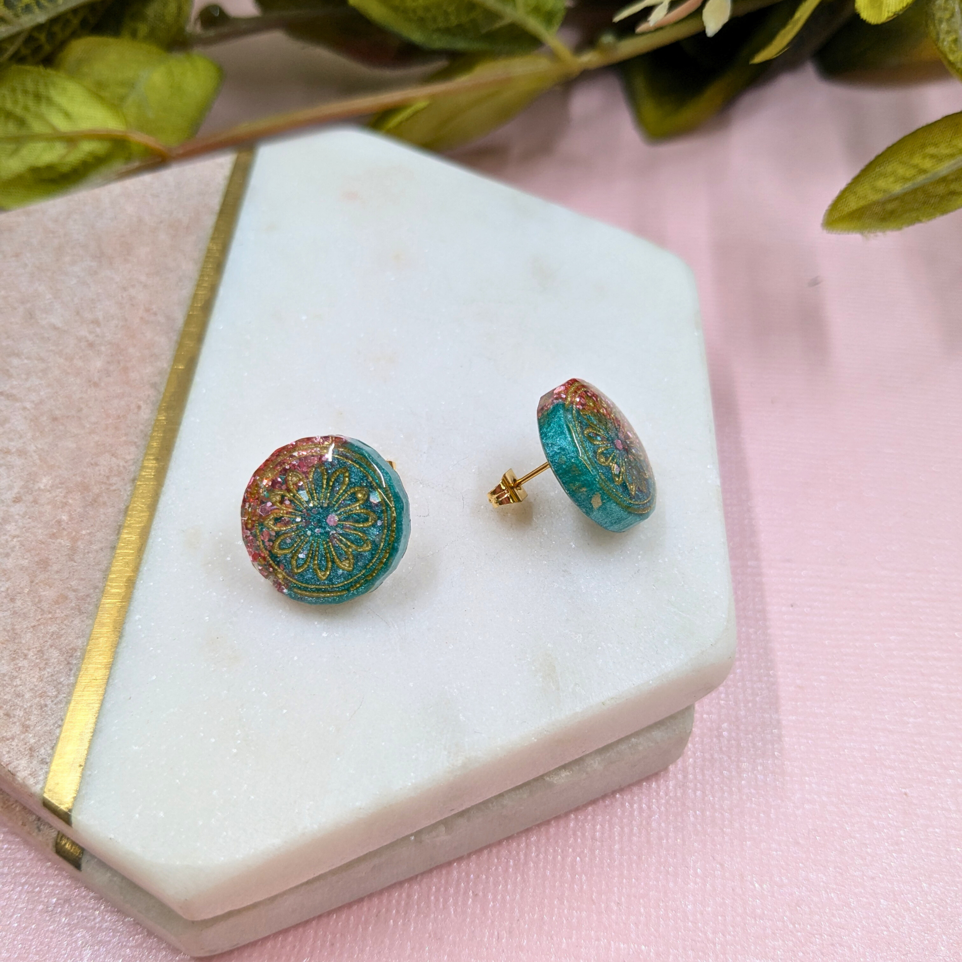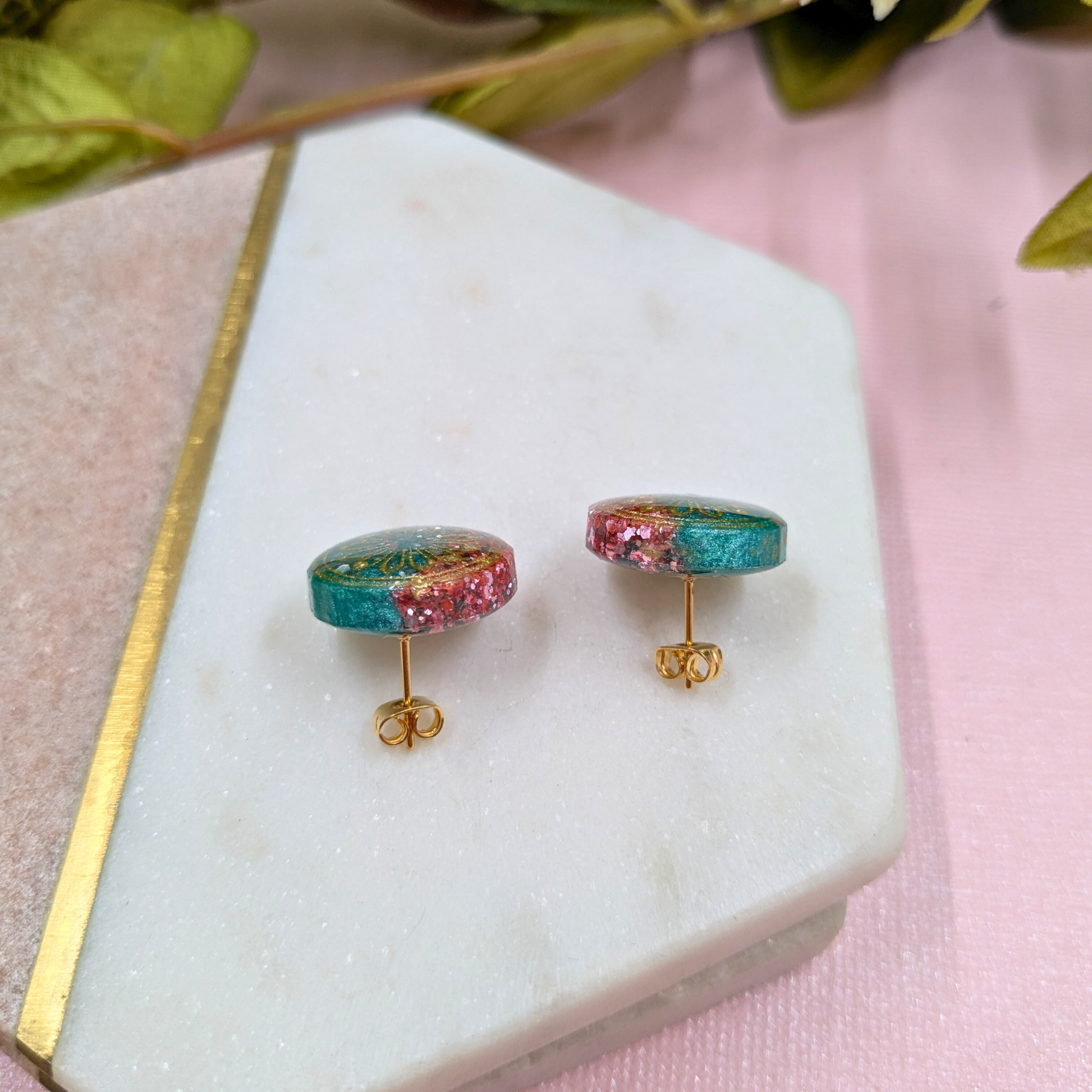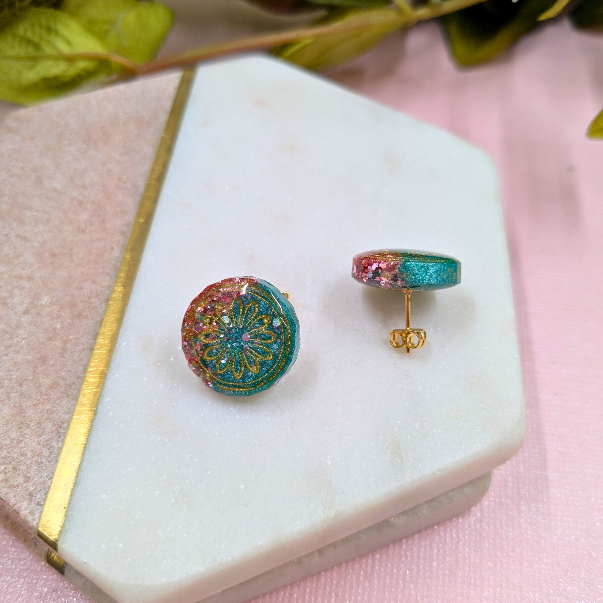 Each stunning 2.5 cm stud is meticulously made from premium resin, featuring a captivating blend of shimmering aqua glitter and soft pink mica. The true magic lies in the delicate fine floral line detailing in gold, reminiscent of beautiful Moroccan patterns, adding an exquisite touch of elegance and intrigue to your collection.