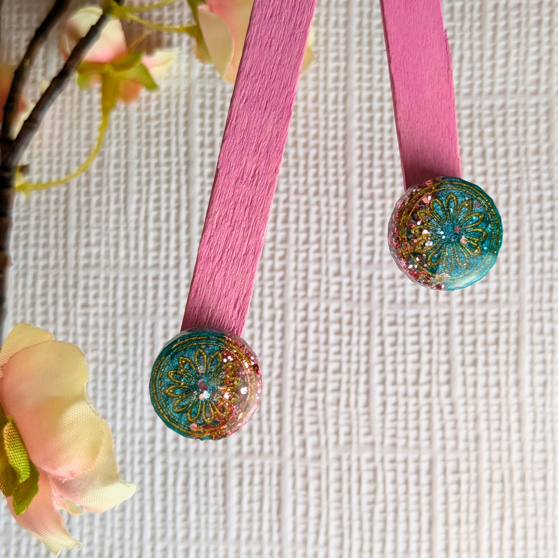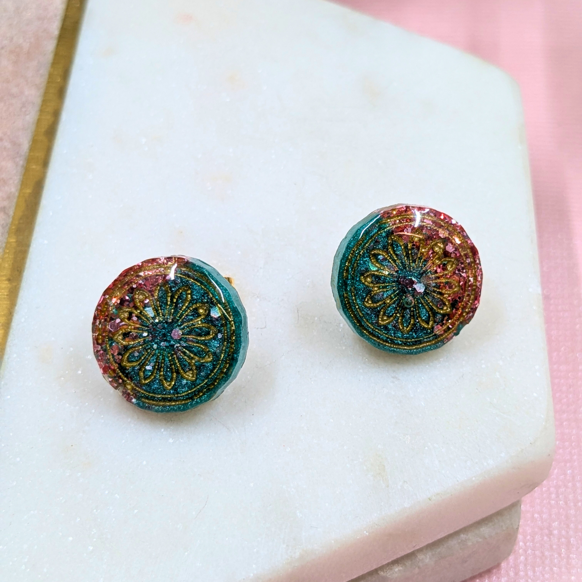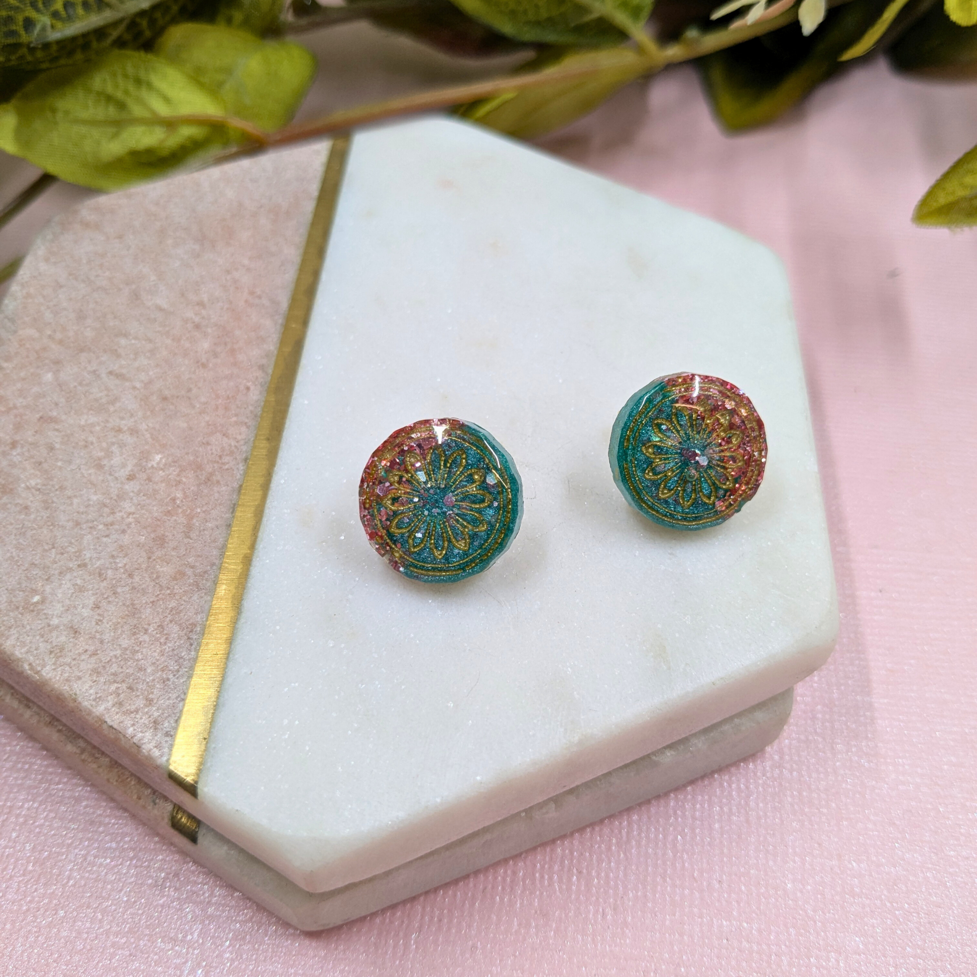 Each stunning 2.5 cm stud is meticulously made from premium resin, featuring a captivating blend of shimmering aqua glitter and soft pink mica. The true magic lies in the delicate fine floral line detailing in gold, reminiscent of beautiful Moroccan patterns, adding an exquisite touch of elegance and intrigue to your collection.