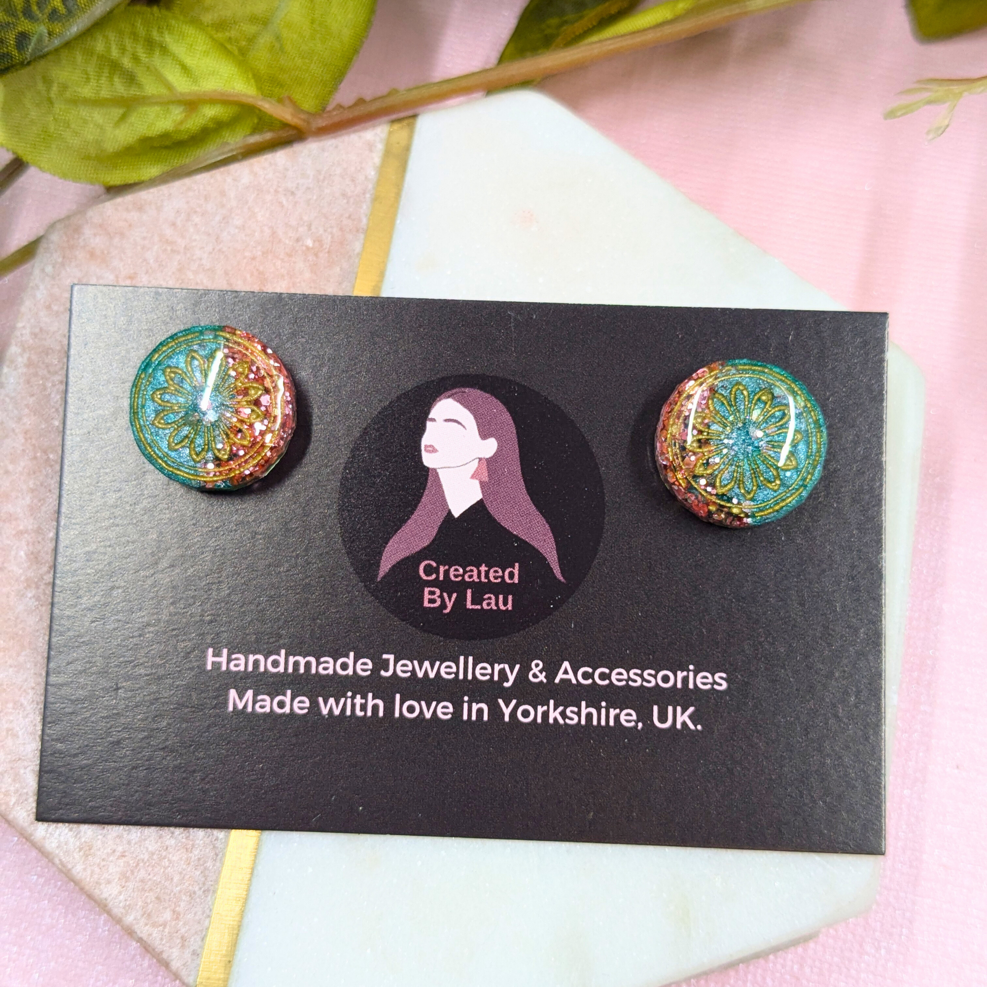 Adorn your ears with a piece of wearable art from our Floral Moroccan Range with these "Anya" Aqua Glitter & Pink Moroccan Floral Stud Earrings! Handcrafted with precision in our Shipley studio, these delightful studs are perfect for the boho babes and stylish women who adore bold patterns and unique, handmade jewellery.