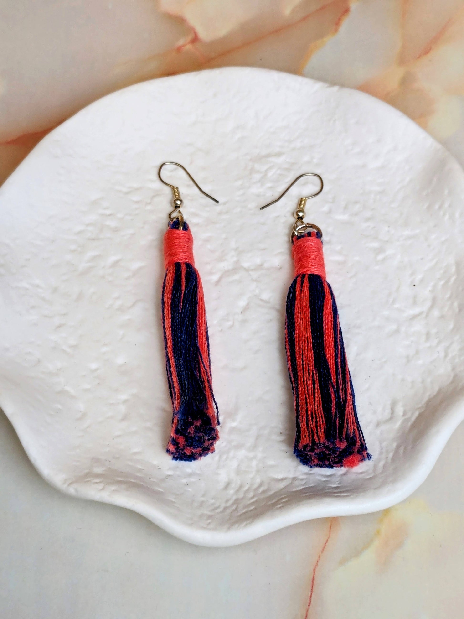 "Aurora" Earrings: Add a pop of colour to your outfit with the vibrant Coral and Indigo hues, beautifully accented by a Coral Contrast Wrap and Tassel design. Made with silver plated findings for a touch of elegance.