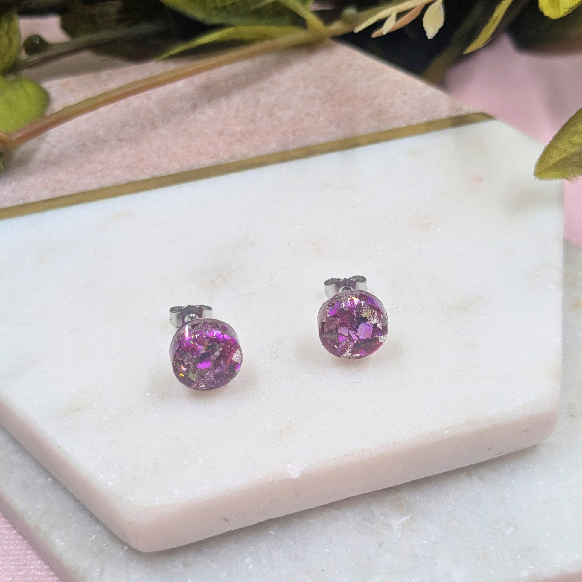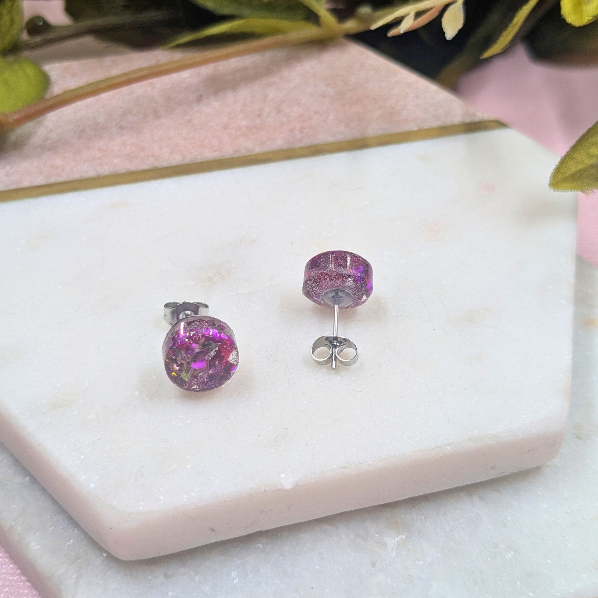 Each gorgeous 1cm stud is meticulously made from premium resin, infused with dazzling cerise glitter shards that catch the light with an intense, captivating twinkle. The vibrant cerise colour, combined with the glitter, creates a stunning focal point, making them a versatile accessory for adding a statement to any outfit.