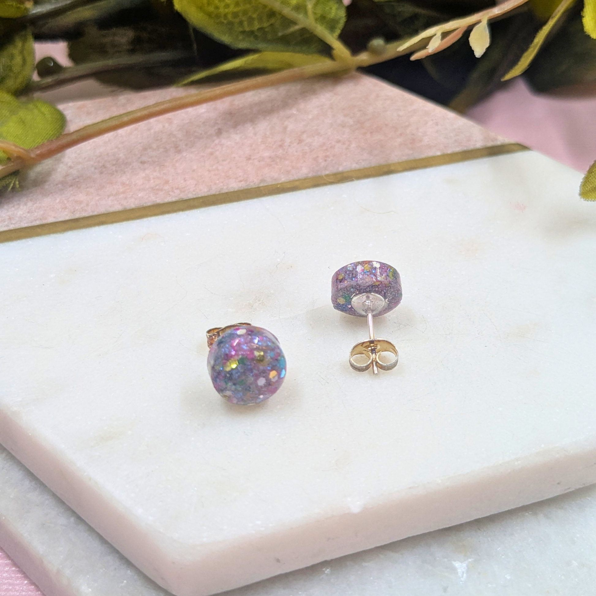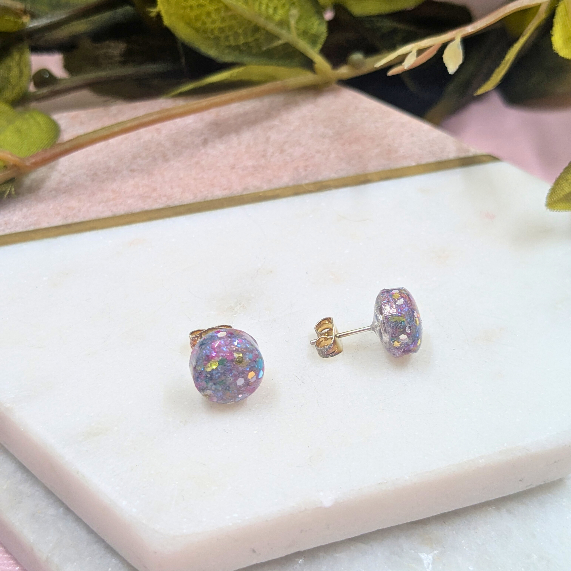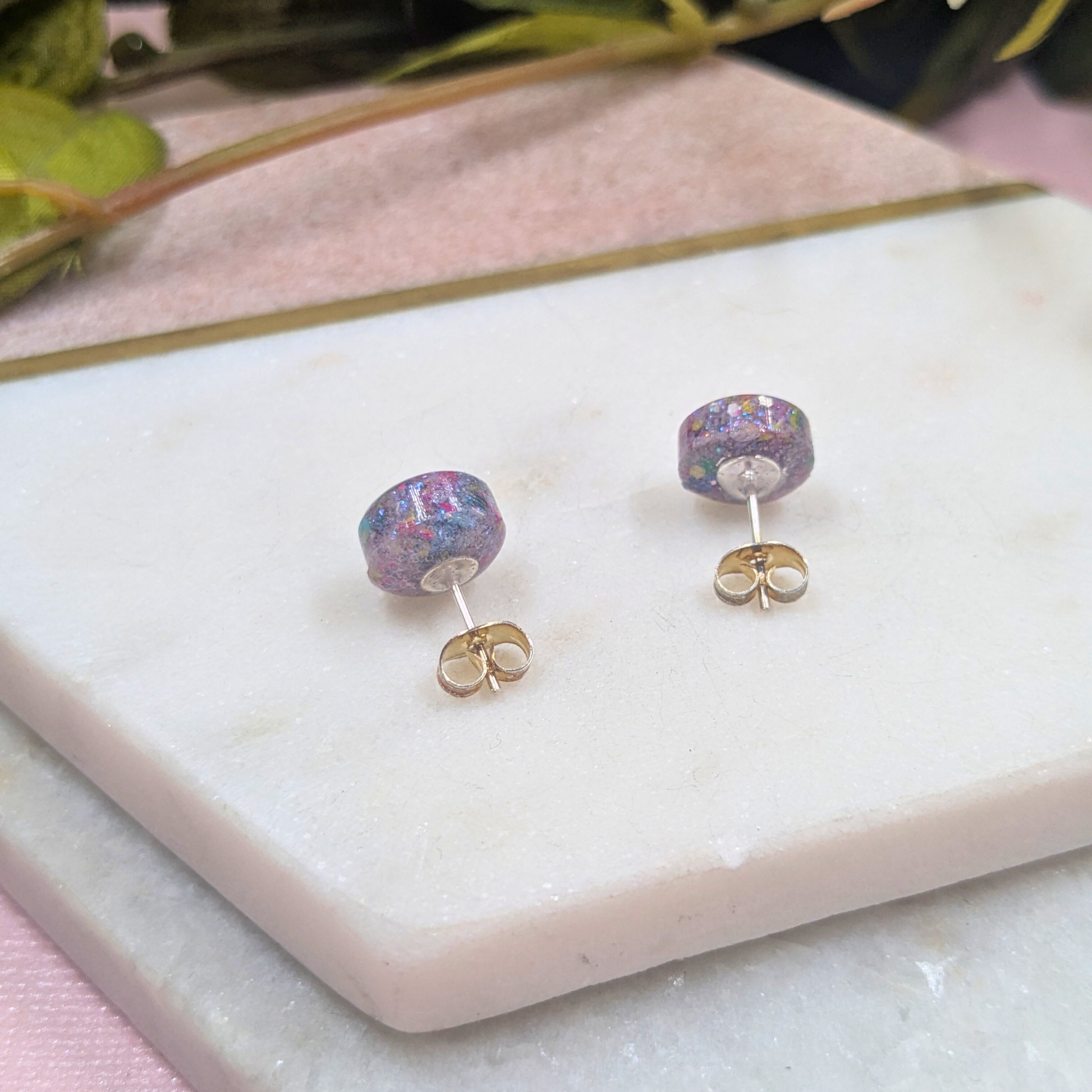 Every 1cm stud is a one-of-a-kind mosaic of colours and textures, made from premium resin that would otherwise go to waste. This gives each pair a wonderfully "washed" or marbled effect, ensuring your earrings are as unique as you are. They're perfect for the stylish souls who appreciate bold details and sustainable, handmade jewellery.