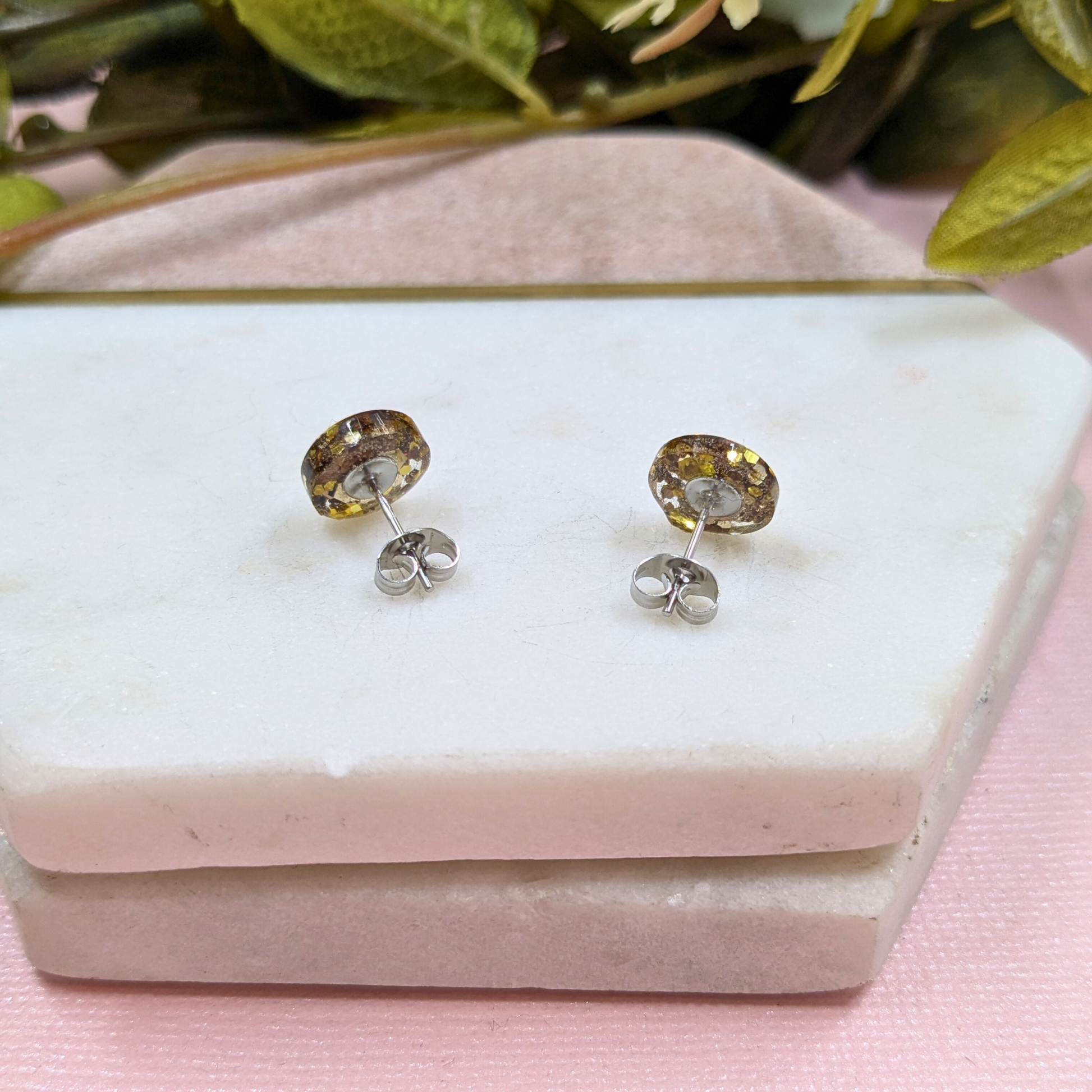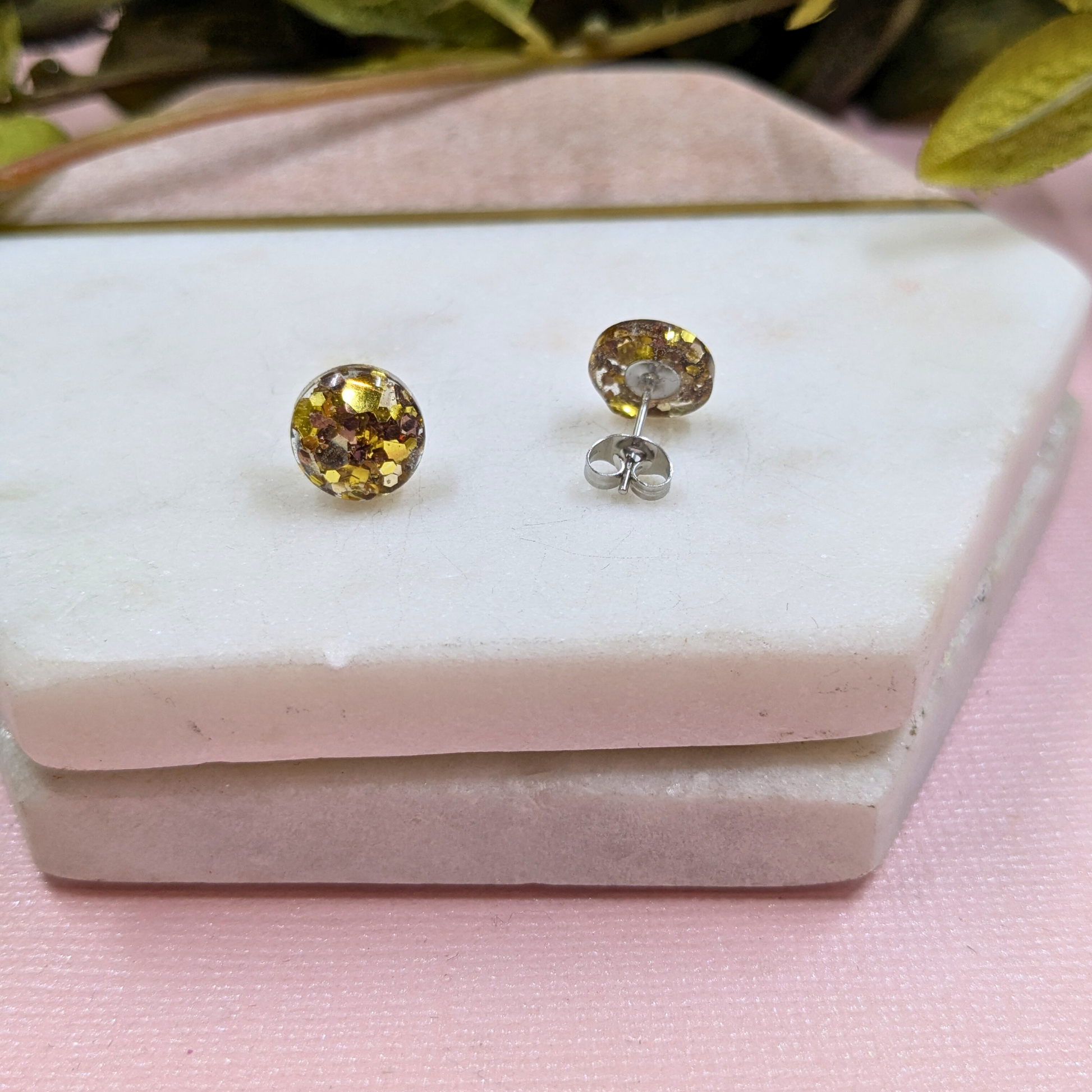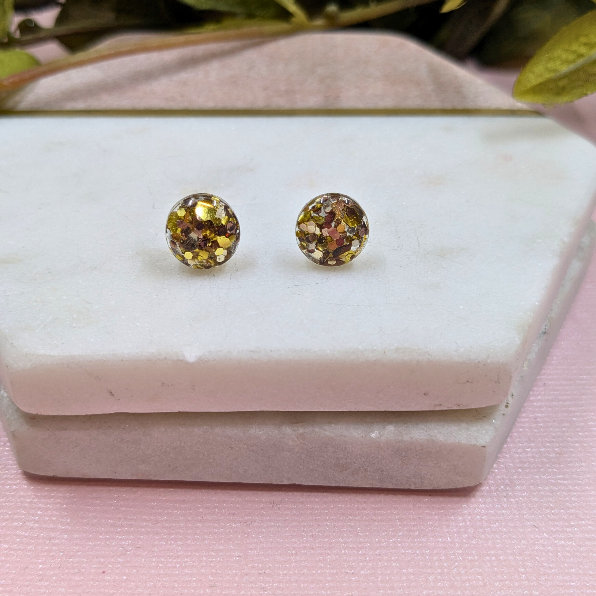 Add a touch of timeless elegance with our "Bridget" Old Gold glitter resin stud earrings. These sophisticated studs feature a rich old gold resin with a subtle yet captivating glitter finish. Crafted with comfortable and durable stainless steel pads and secure scrolls, these 1cm earrings are perfect for adding a hint of understated glamour to any occasion. Lovingly handmade by Lau, these earrings bring a unique touch of Yorkshire craftsmanship to your style.