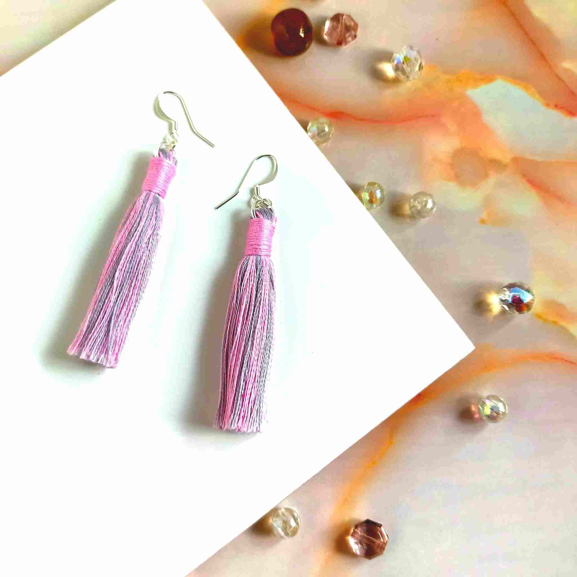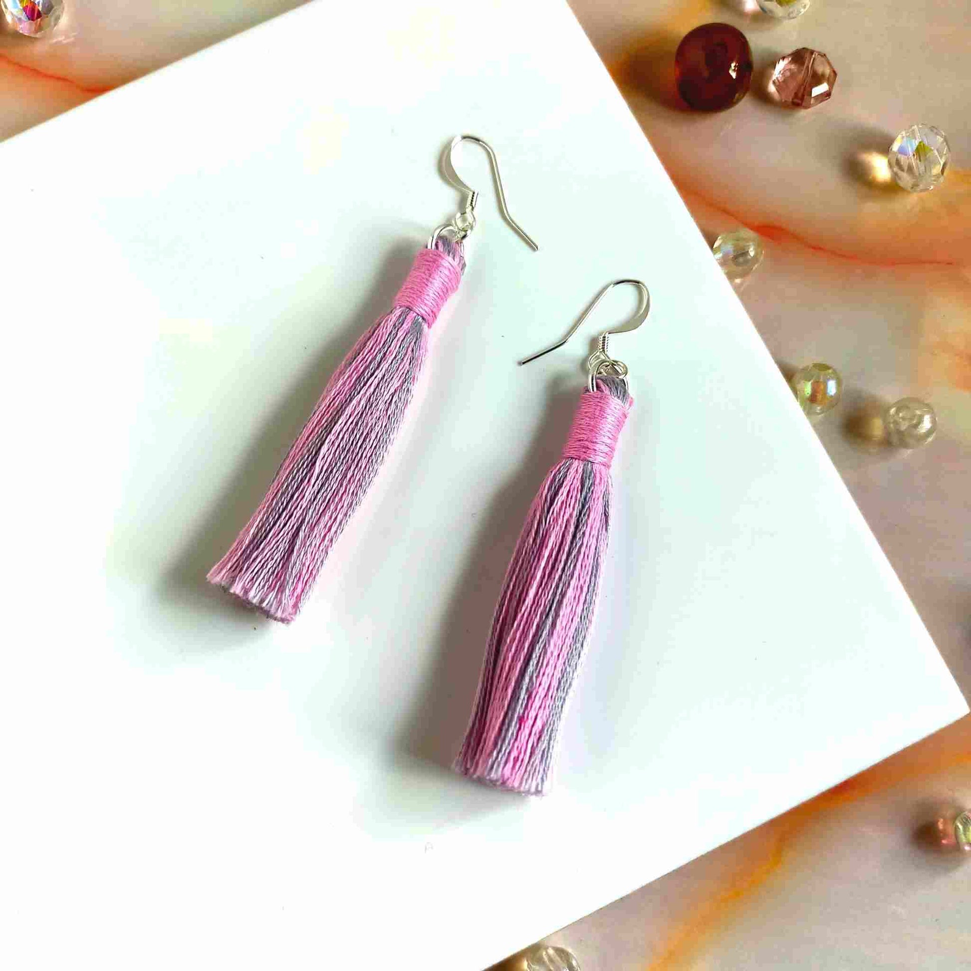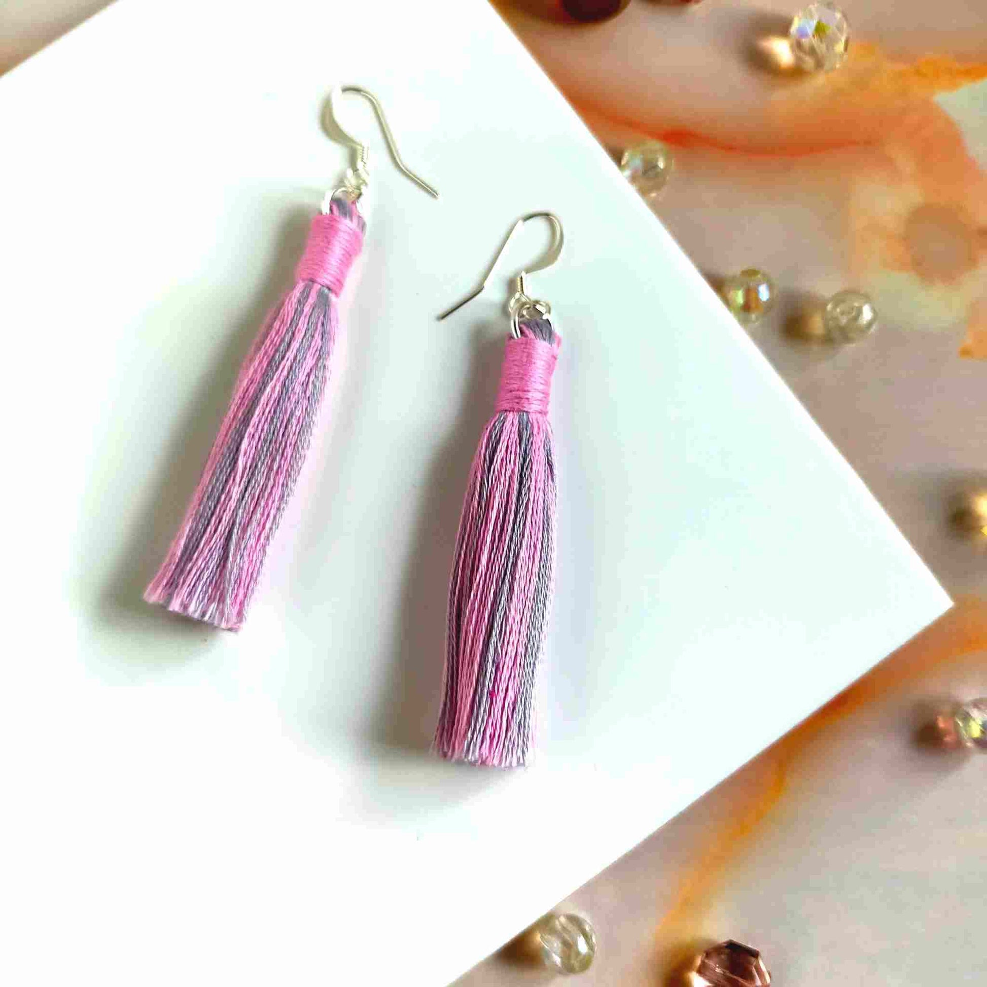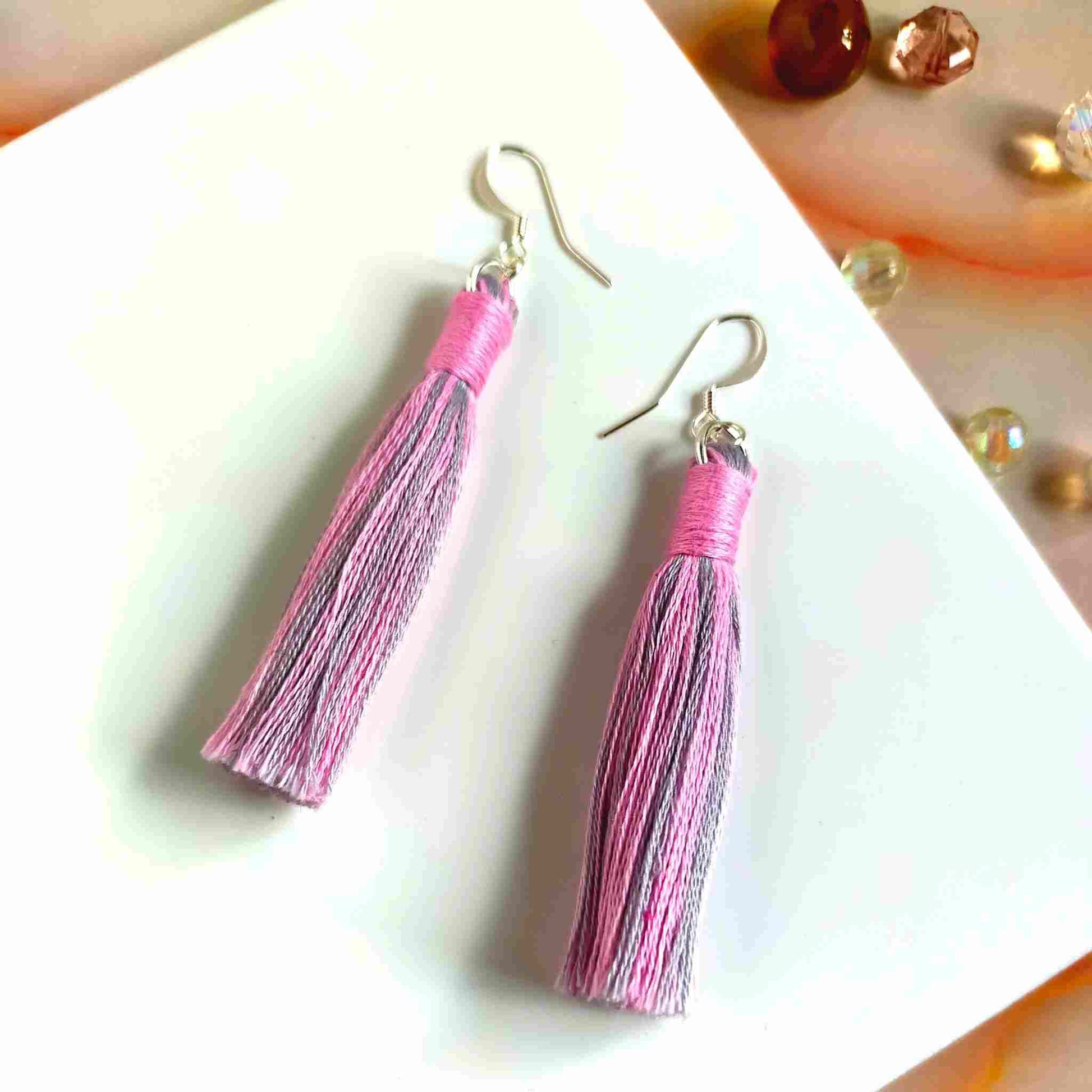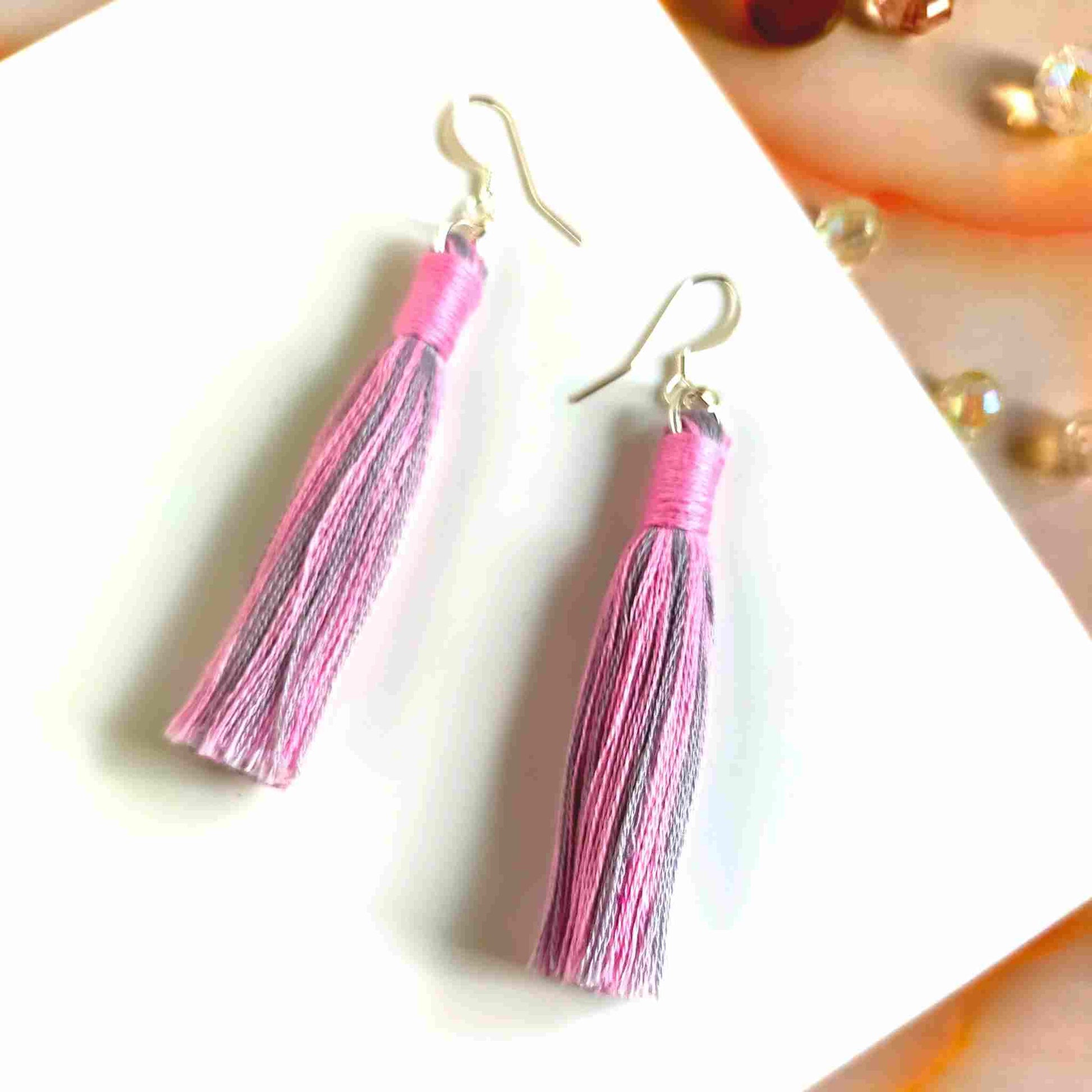 These unique, one-of-a-kind "Aurora" cotton tassel earrings feature a mix of pink and grey tassels with a pink contrast wrap design. Handcrafted with 100% cotton thread, the lightweight design includes a silver-plated earring hook, transforming even the simplest outfit into a fashionable statement. Ideal for gifting or personal use, each pair is delicately crafted and may have a slight variation from the pictured product.