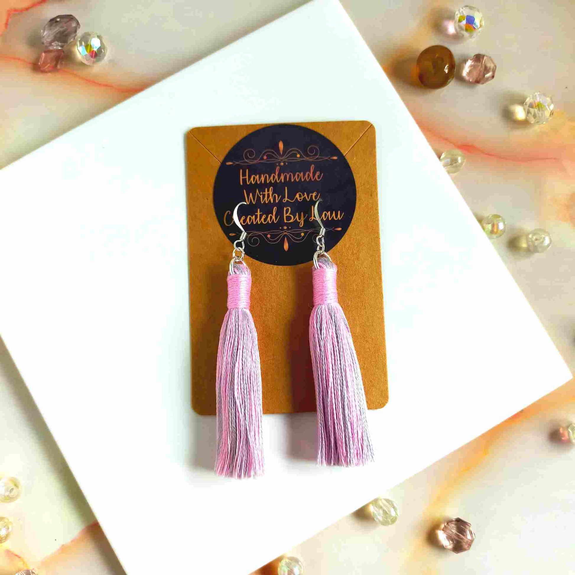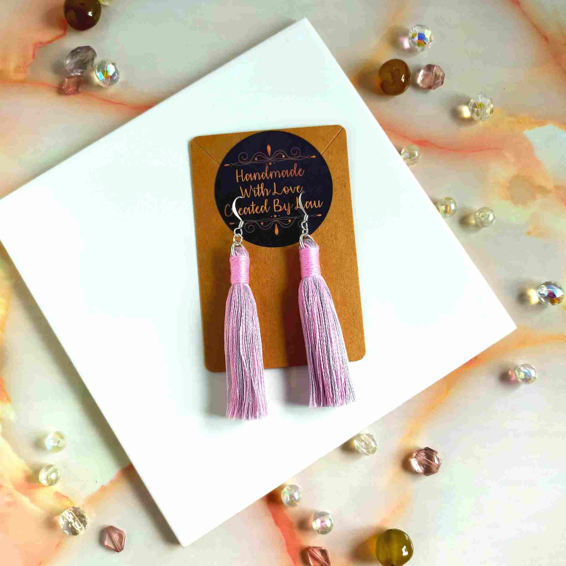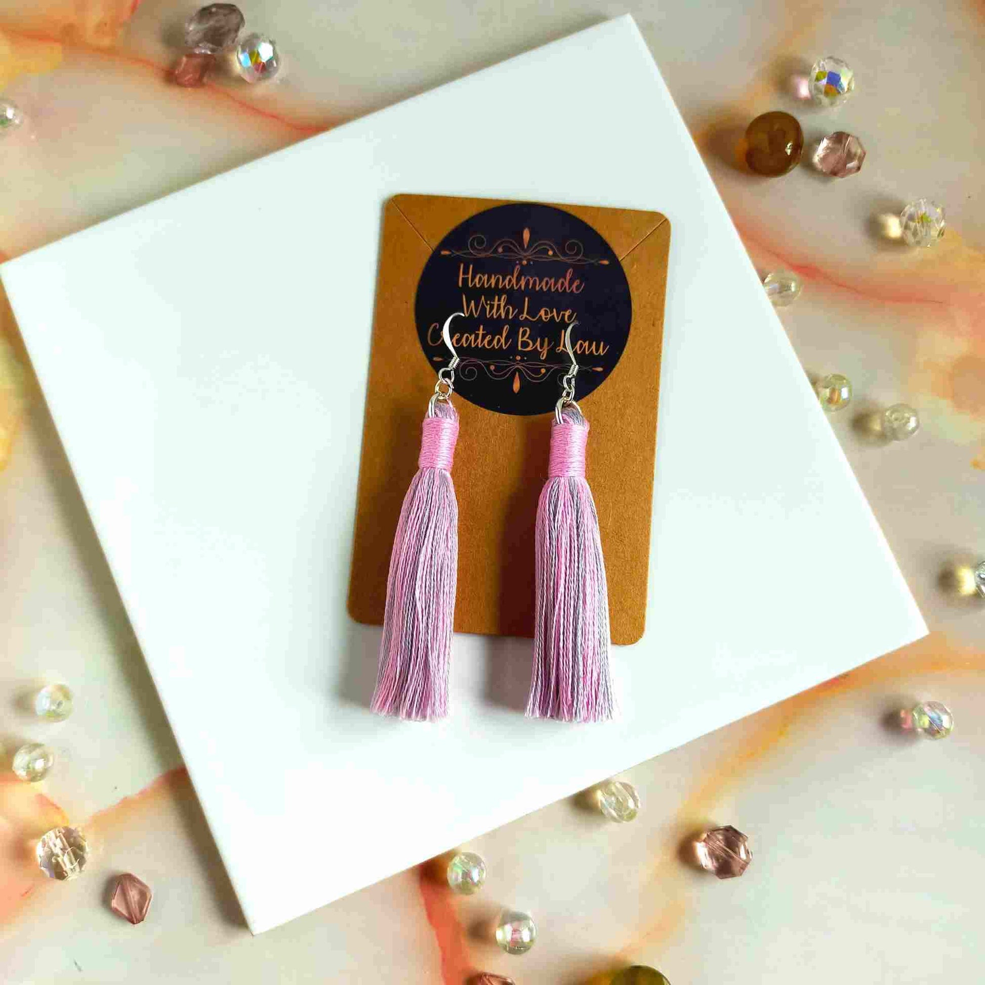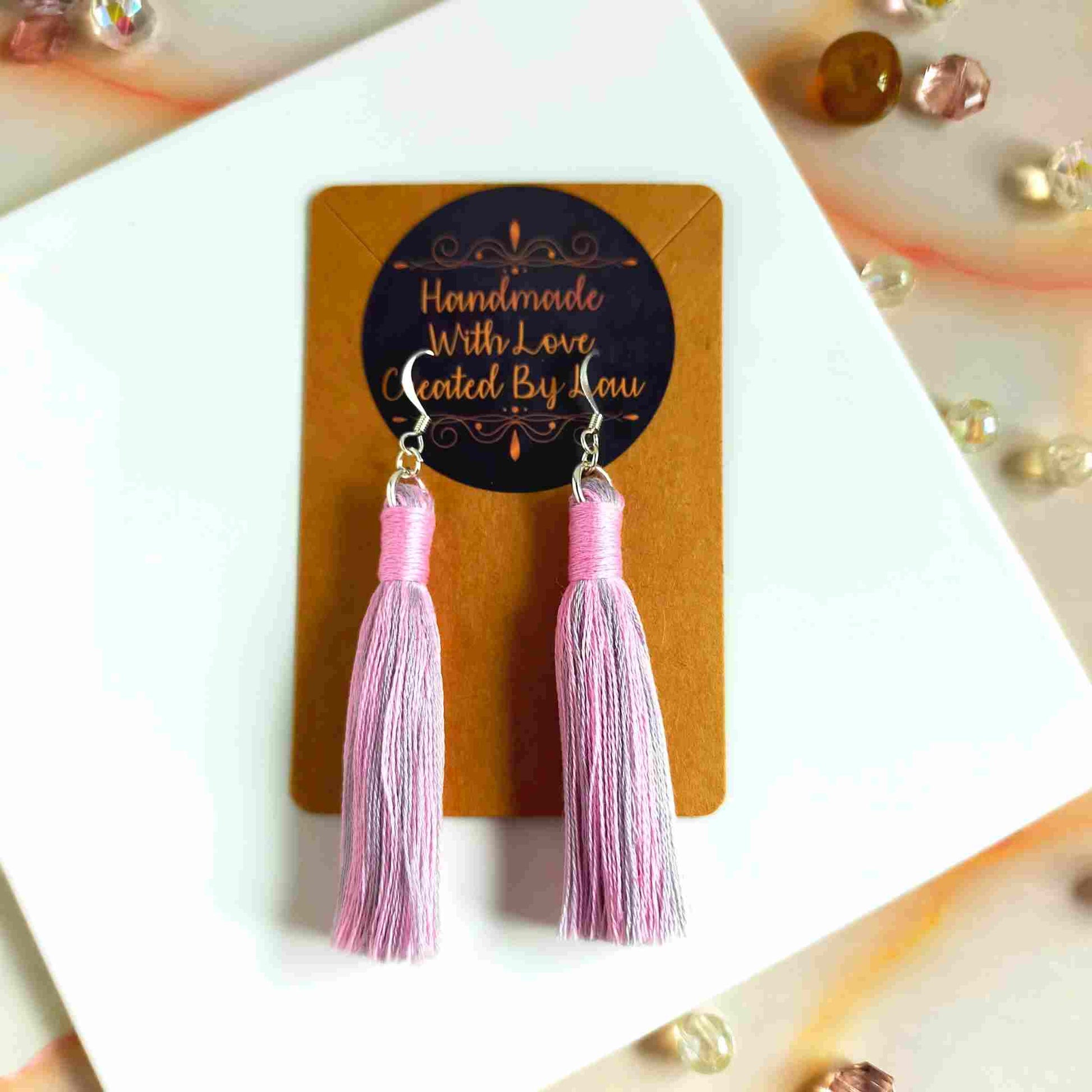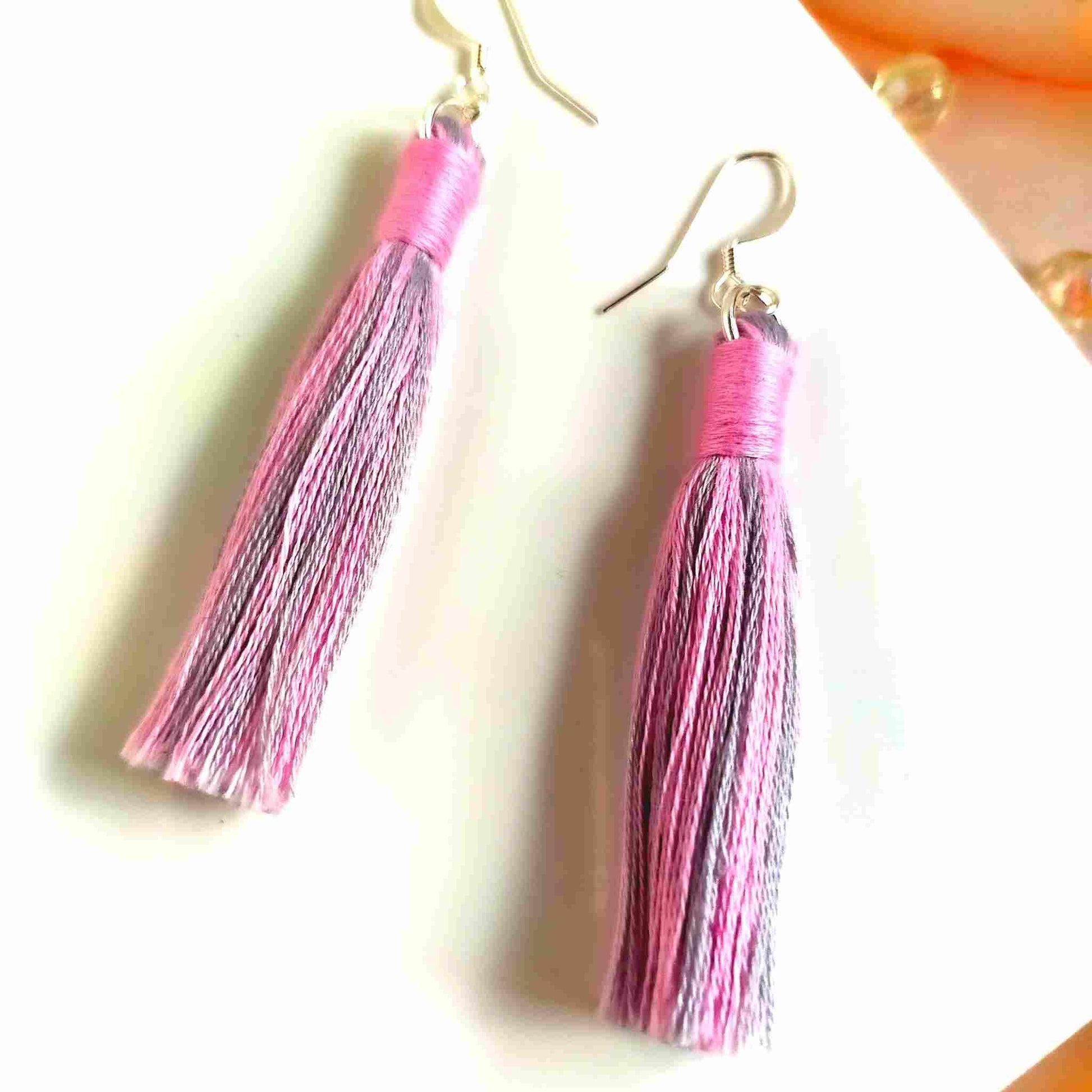 These unique, one-of-a-kind "Aurora" cotton tassel earrings feature a mix of pink and grey tassels with a pink contrast wrap design. Handcrafted with 100% cotton thread, the lightweight design includes a silver-plated earring hook, transforming even the simplest outfit into a fashionable statement. Ideal for gifting or personal use, each pair is delicately crafted and may have a slight variation from the pictured product.