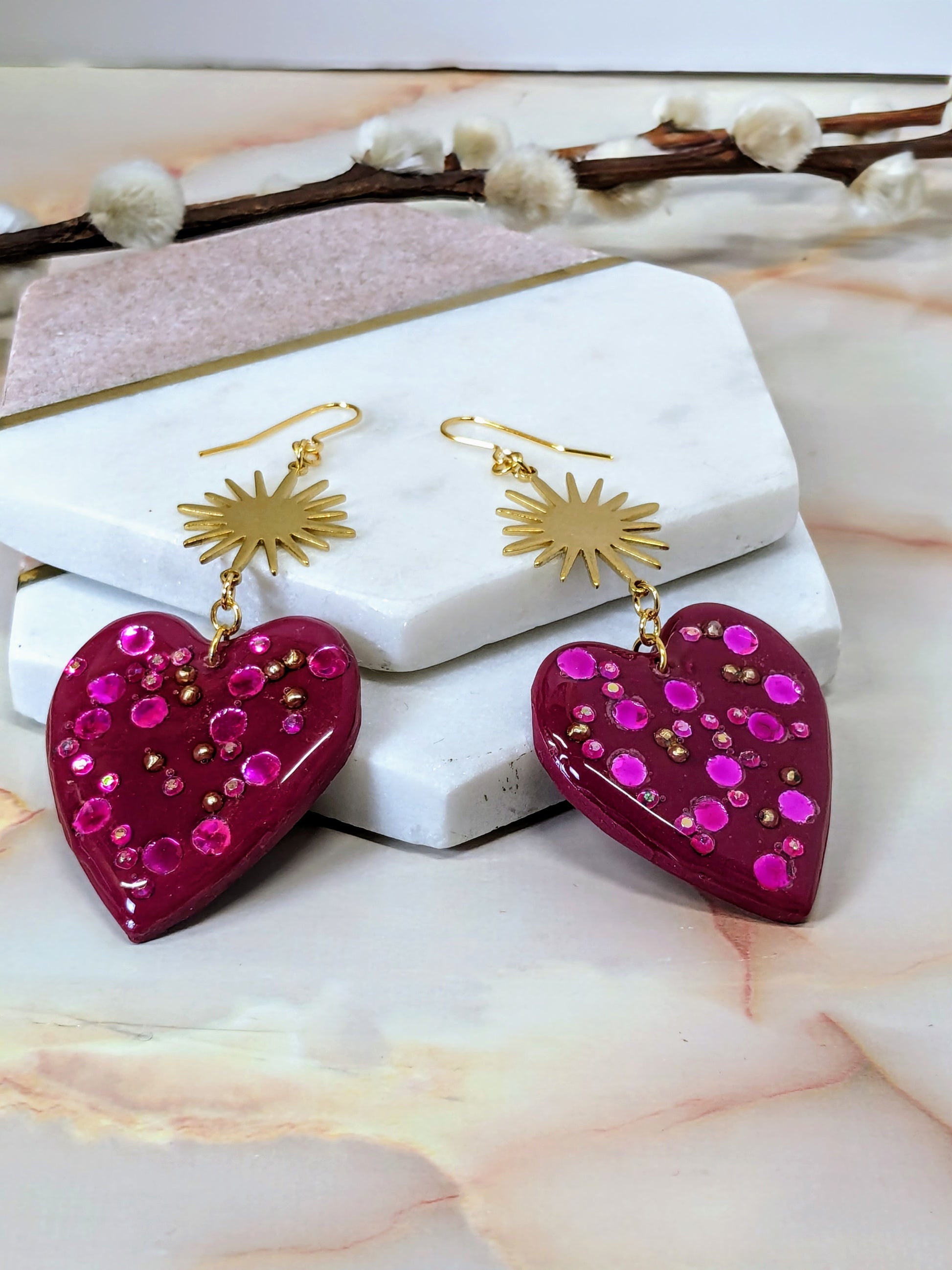 Add some love and sparkle to your outfit with "Cordelia"! Handcrafted with jewelled polymer clay in the shape of a heart, it features a charming brass sun charm. The gold-plated findings add a touch of elegance. The perfect gift for your special someone.
