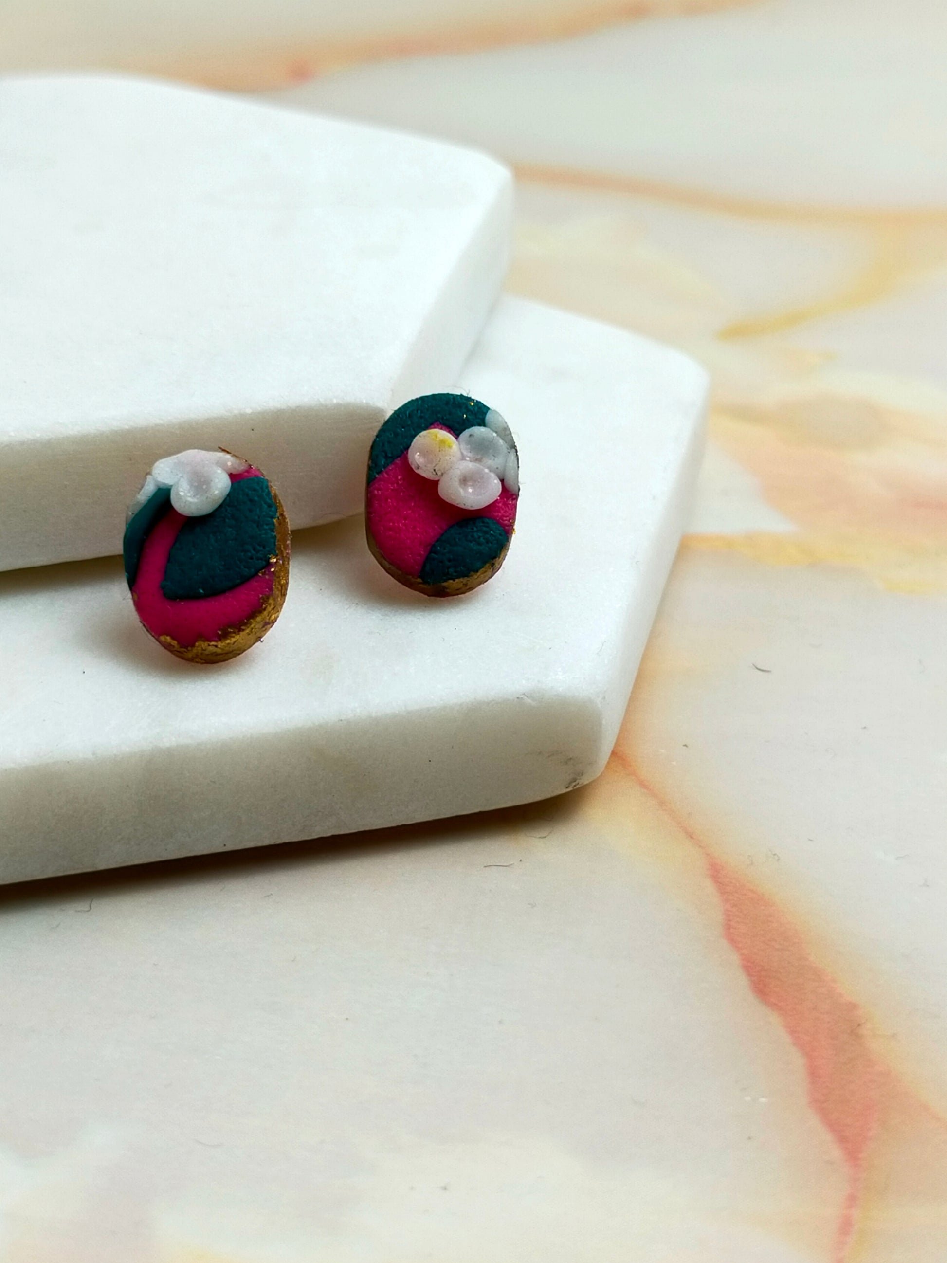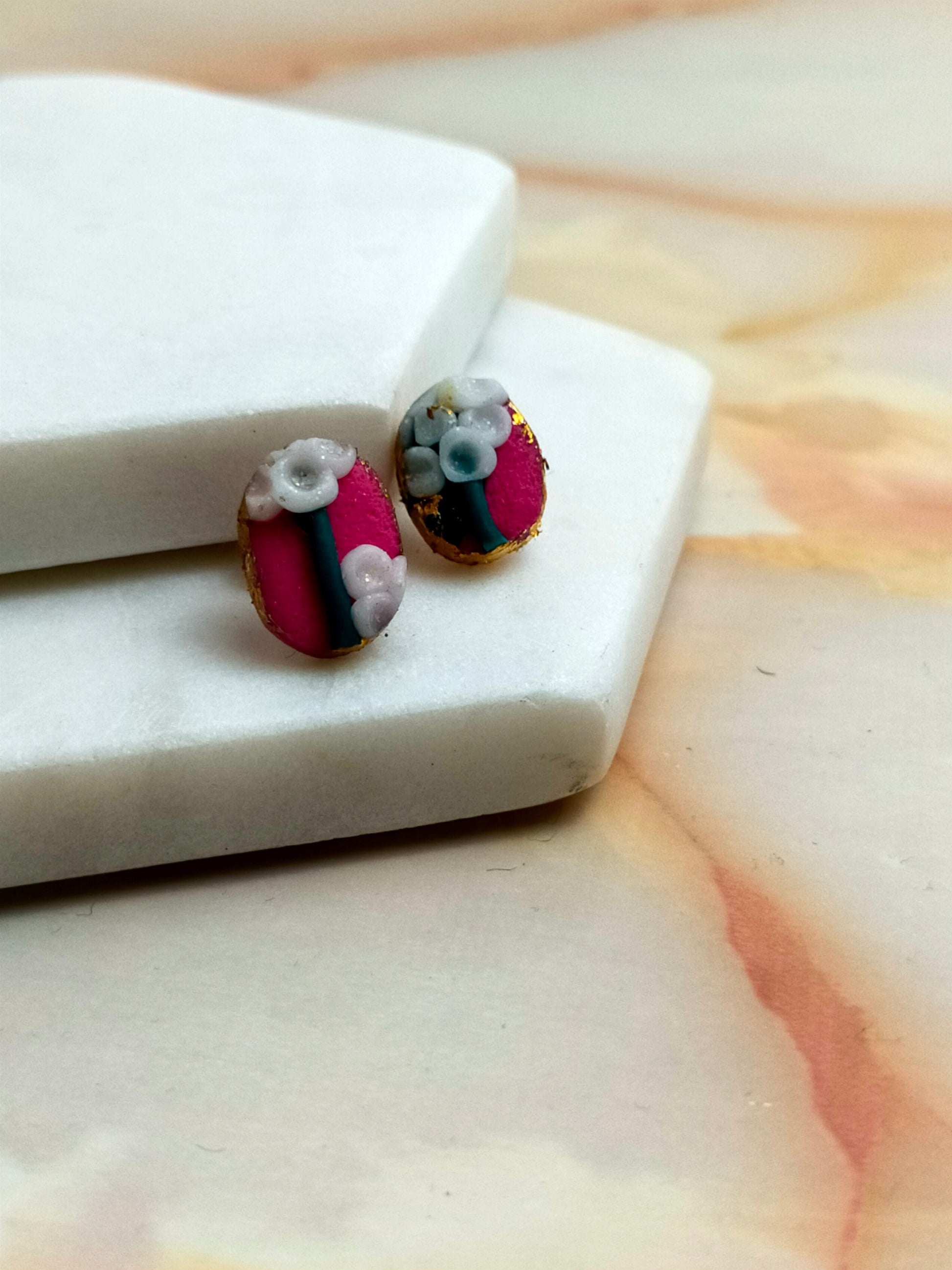 "Della" Pink Flower Slab Polymer Clay Oval Studs