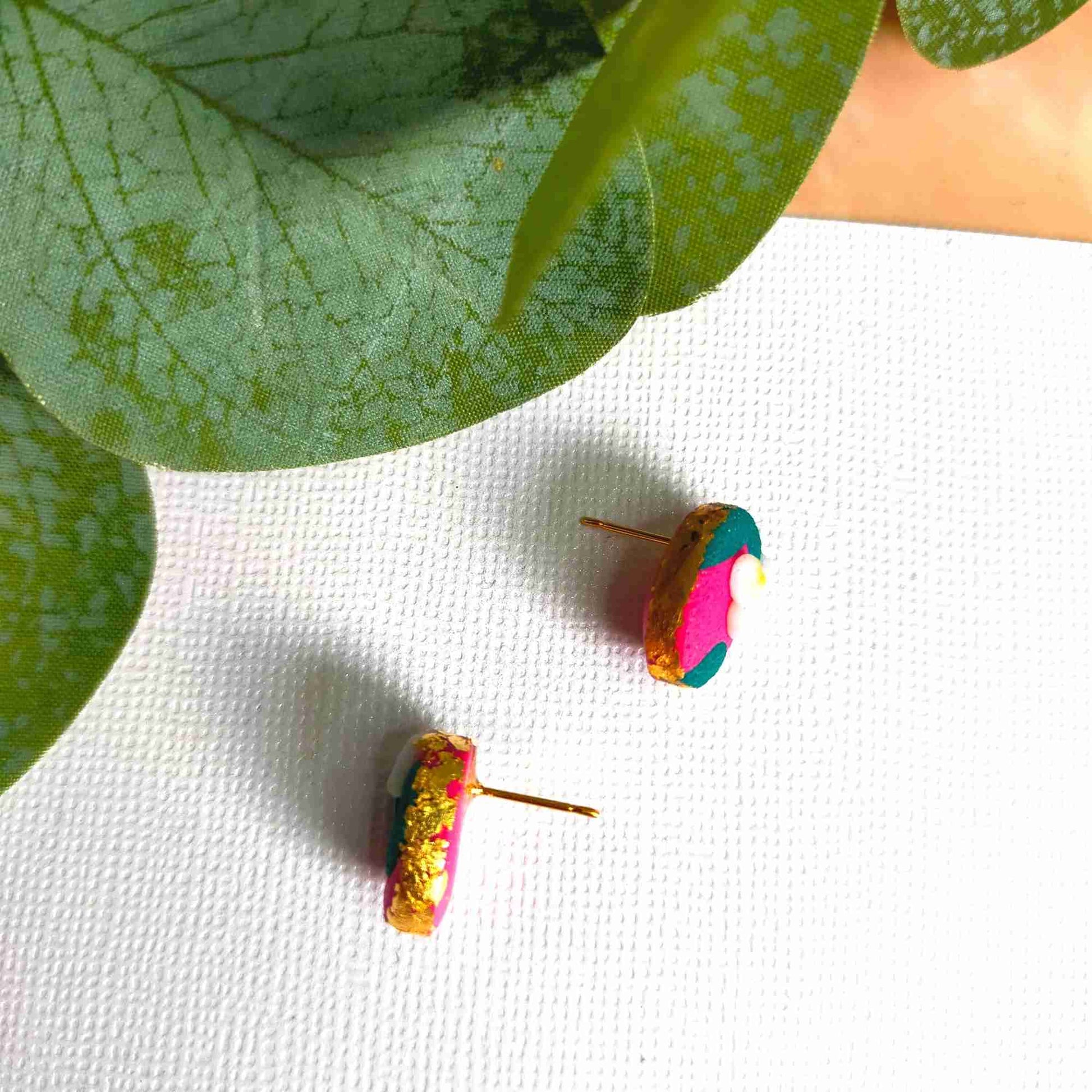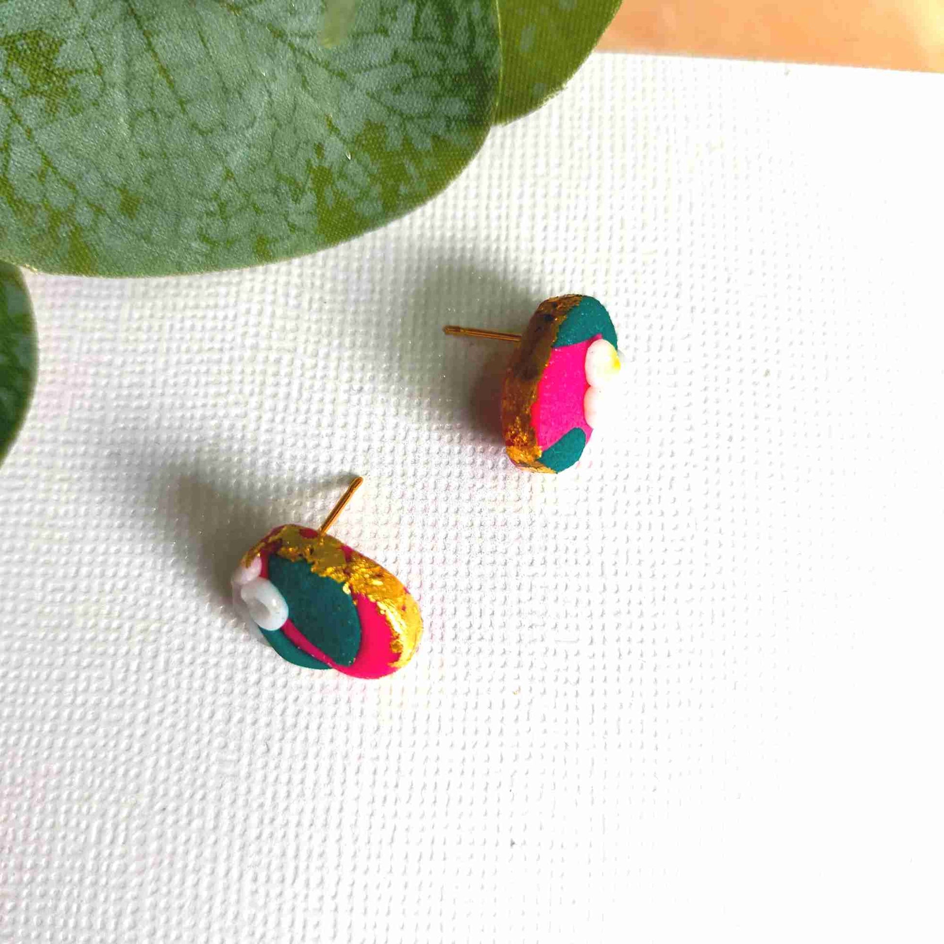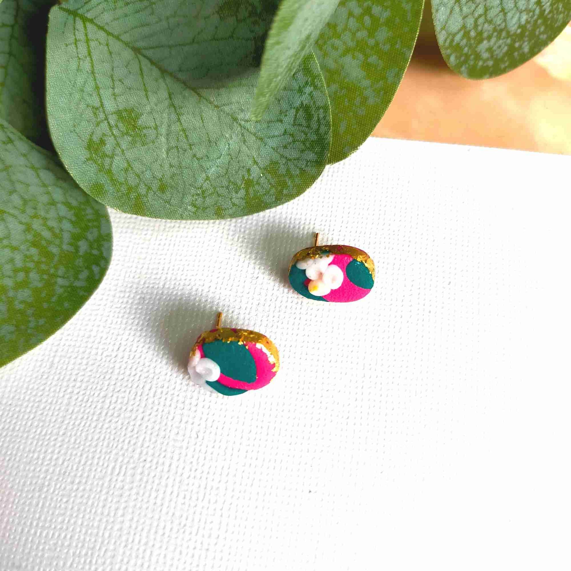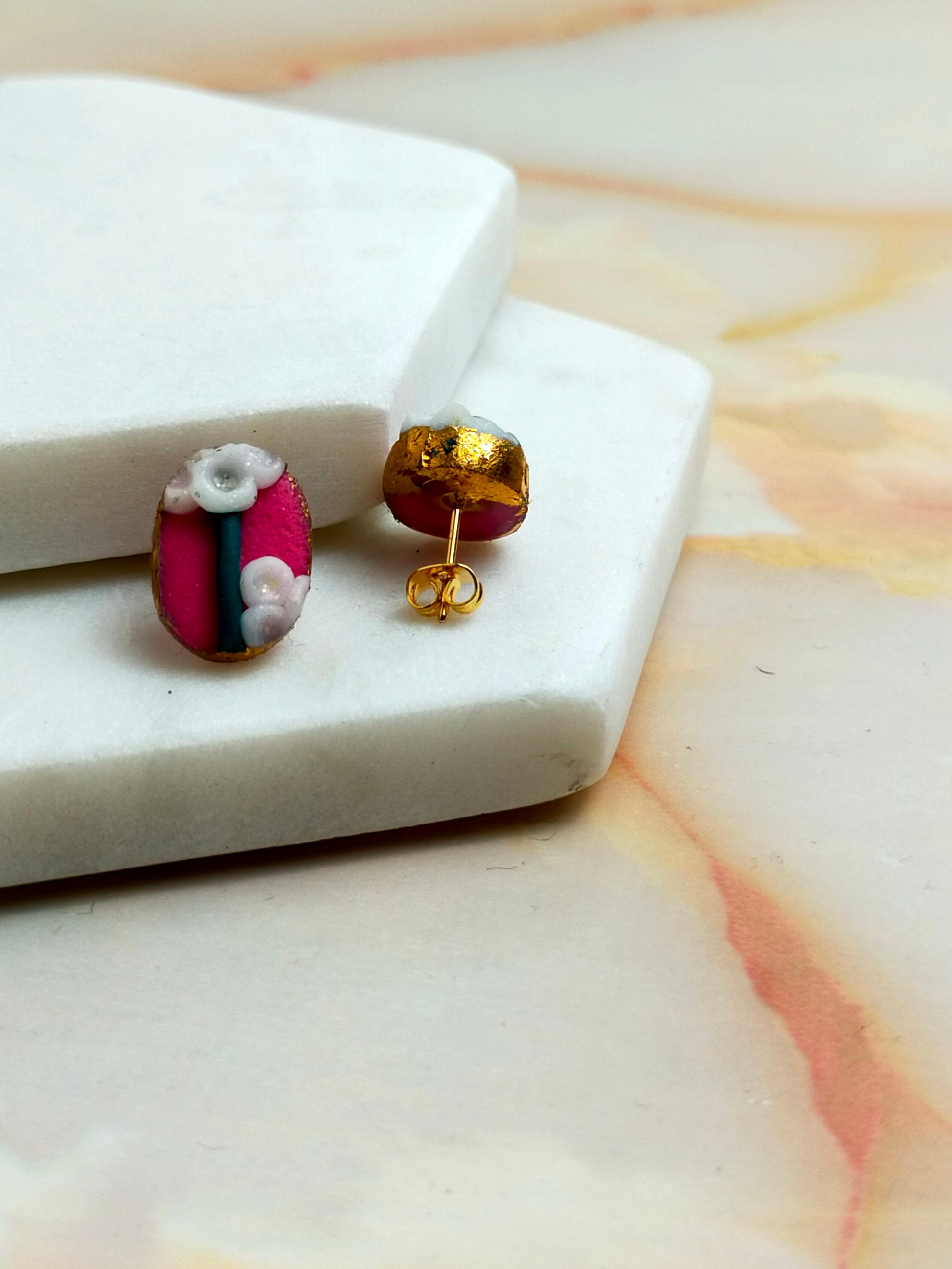 These unique, stylish and handmade earrings have been created from a pink flower slab and each white flower has been made from white polymer clay with tiny pieces of dried flowers. They have been finished to the highest standard with resin, gold leaf edging and gold plated stud to create a stylish piece of jewellery which is sure to make an impression.