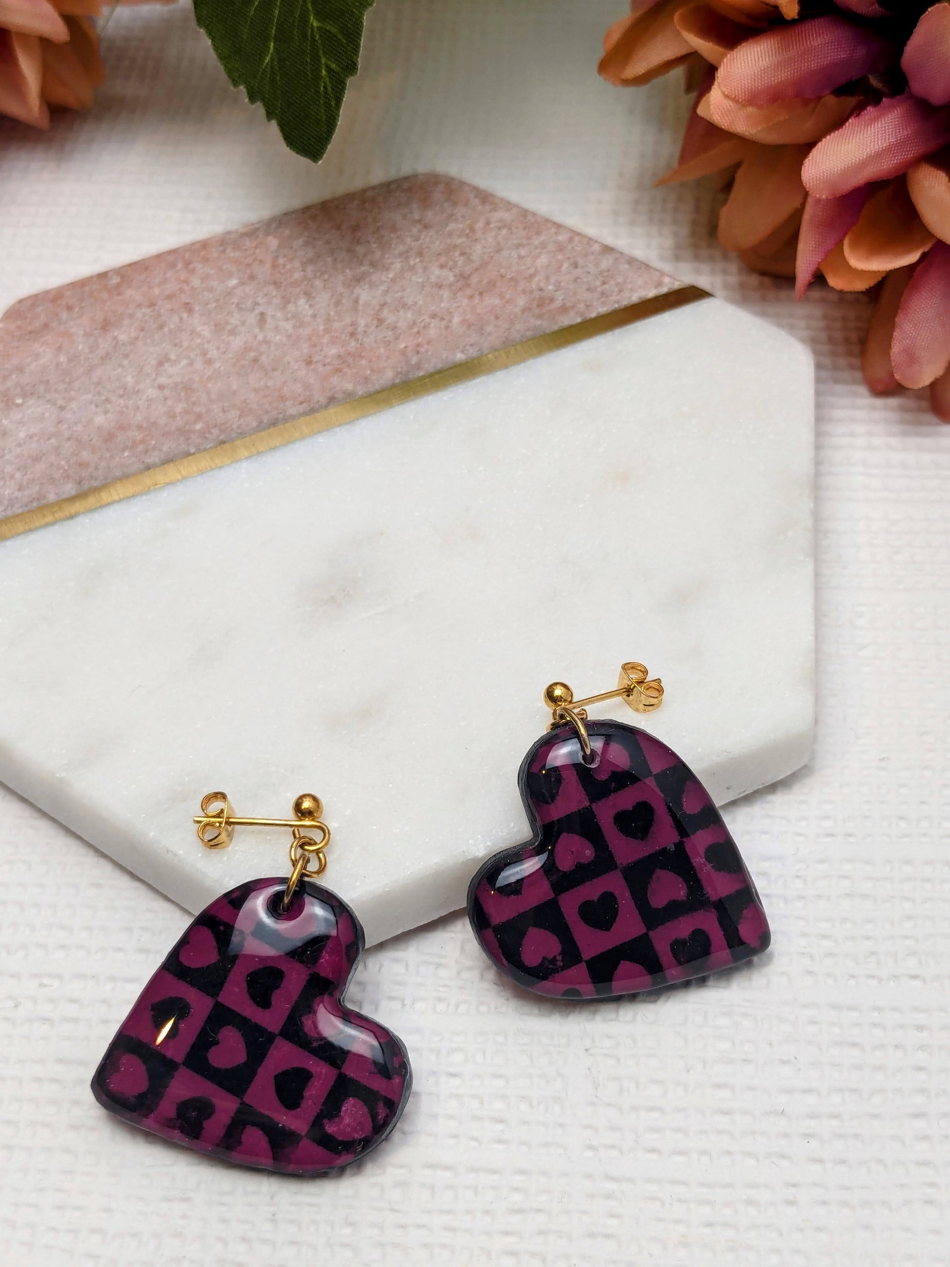 Put more charm and flair into your attire with our "Eliza" Checkmate Heart Dangle Earrings. Made with gold-plated ball studs and rich burgundy polymer clay, these earrings boast a captivating checkerboard pattern of black hearts that are bound to catch attention.