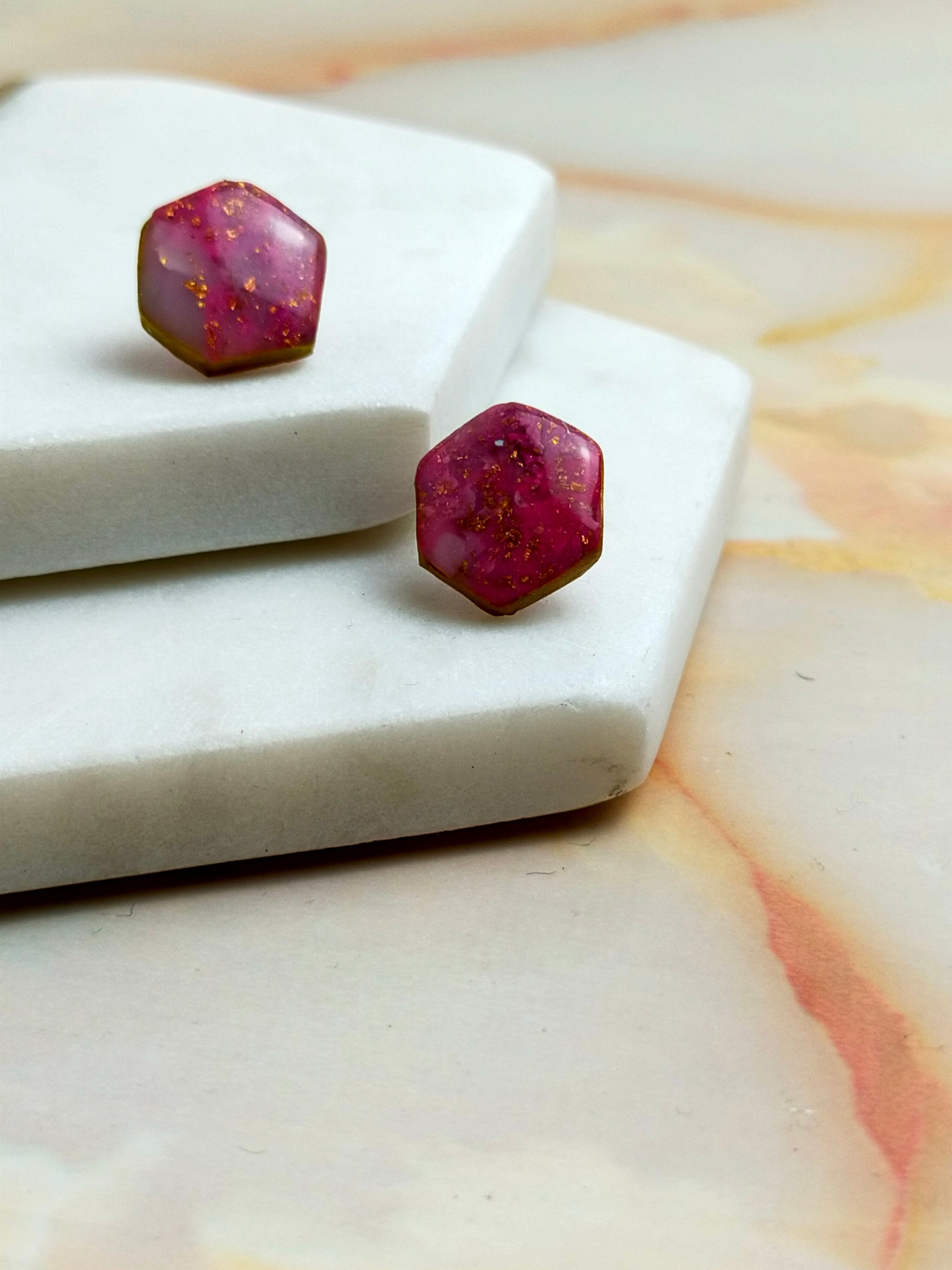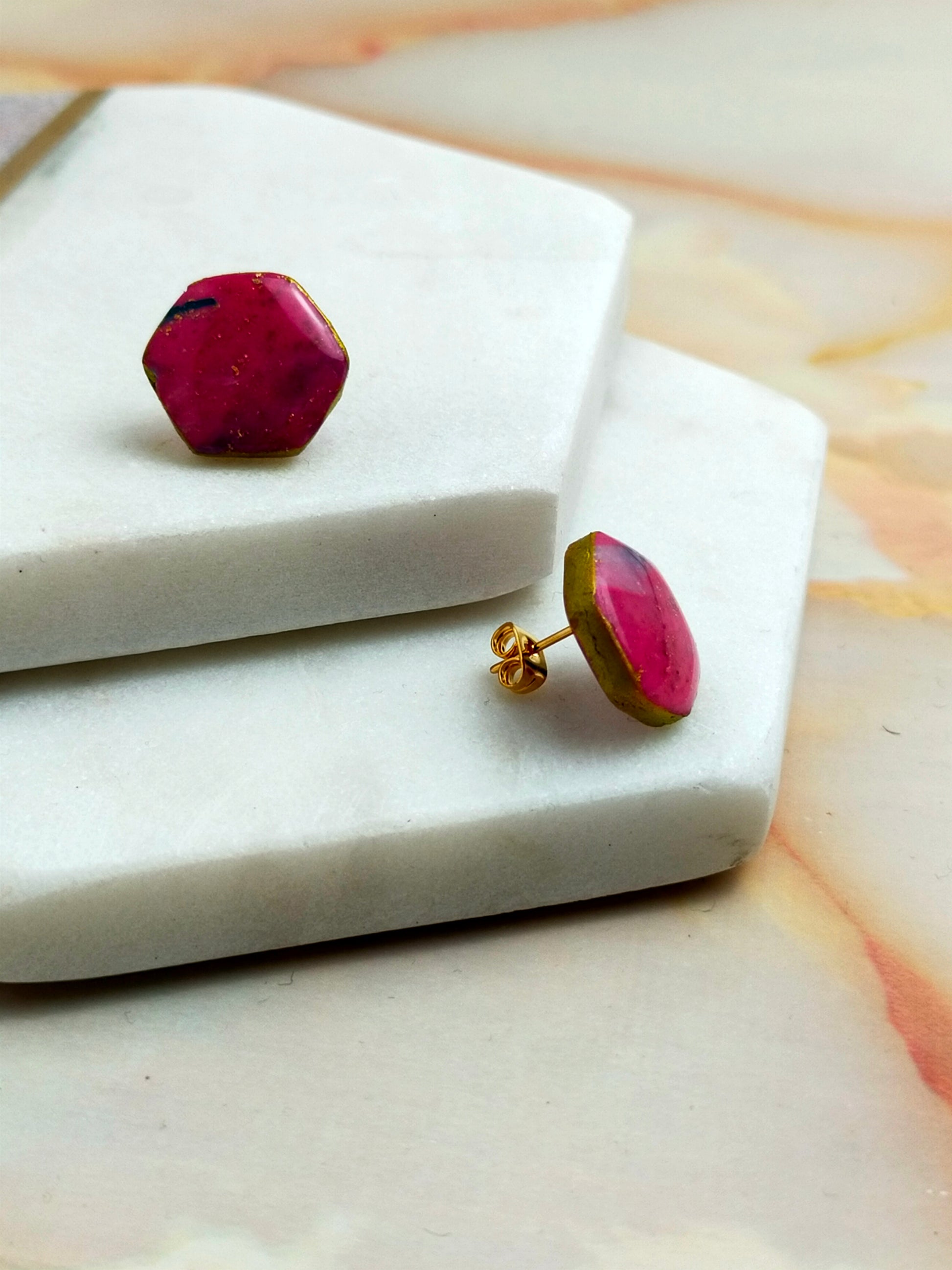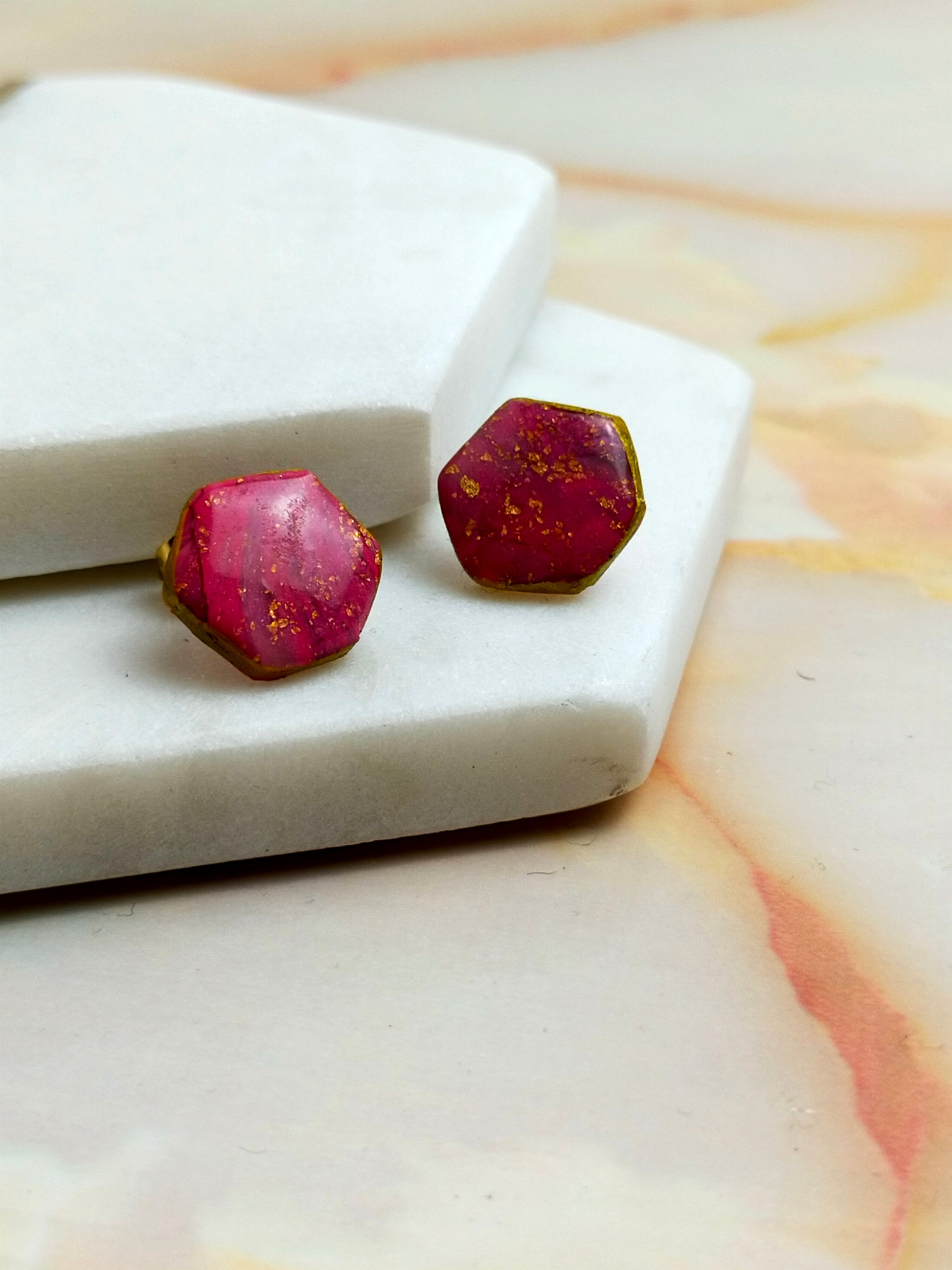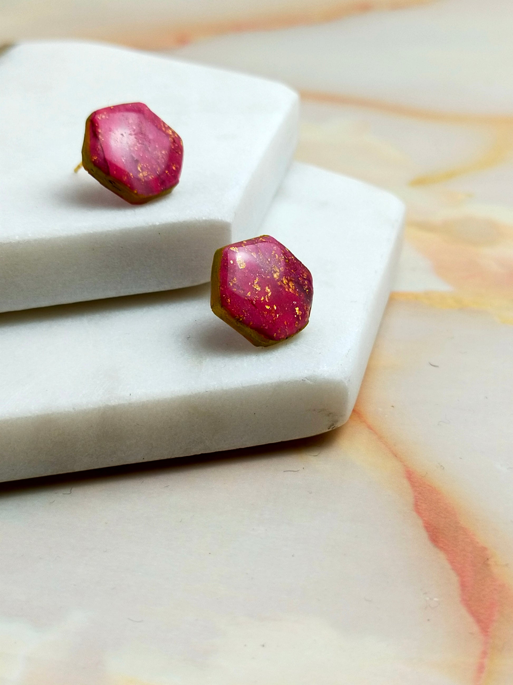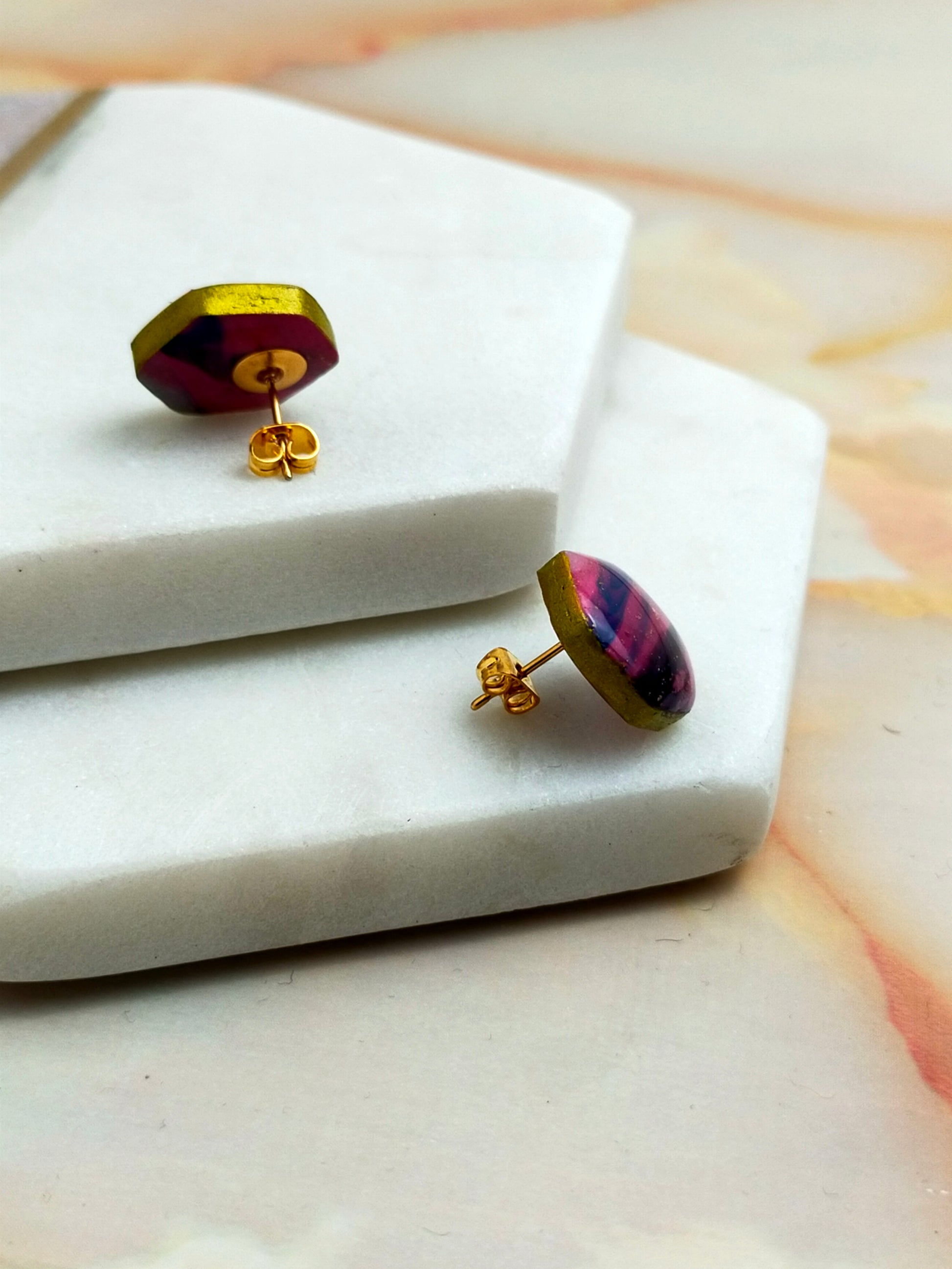 These earrings boast unique pink marbling and luxurious gold foil accents. Crafted with polymer clay and finished with resin, they are lightweight and perfect for daily wear. Each piece is carefully handmade, and the posts are available in either hypoallergenic stainless steel or gold plated.