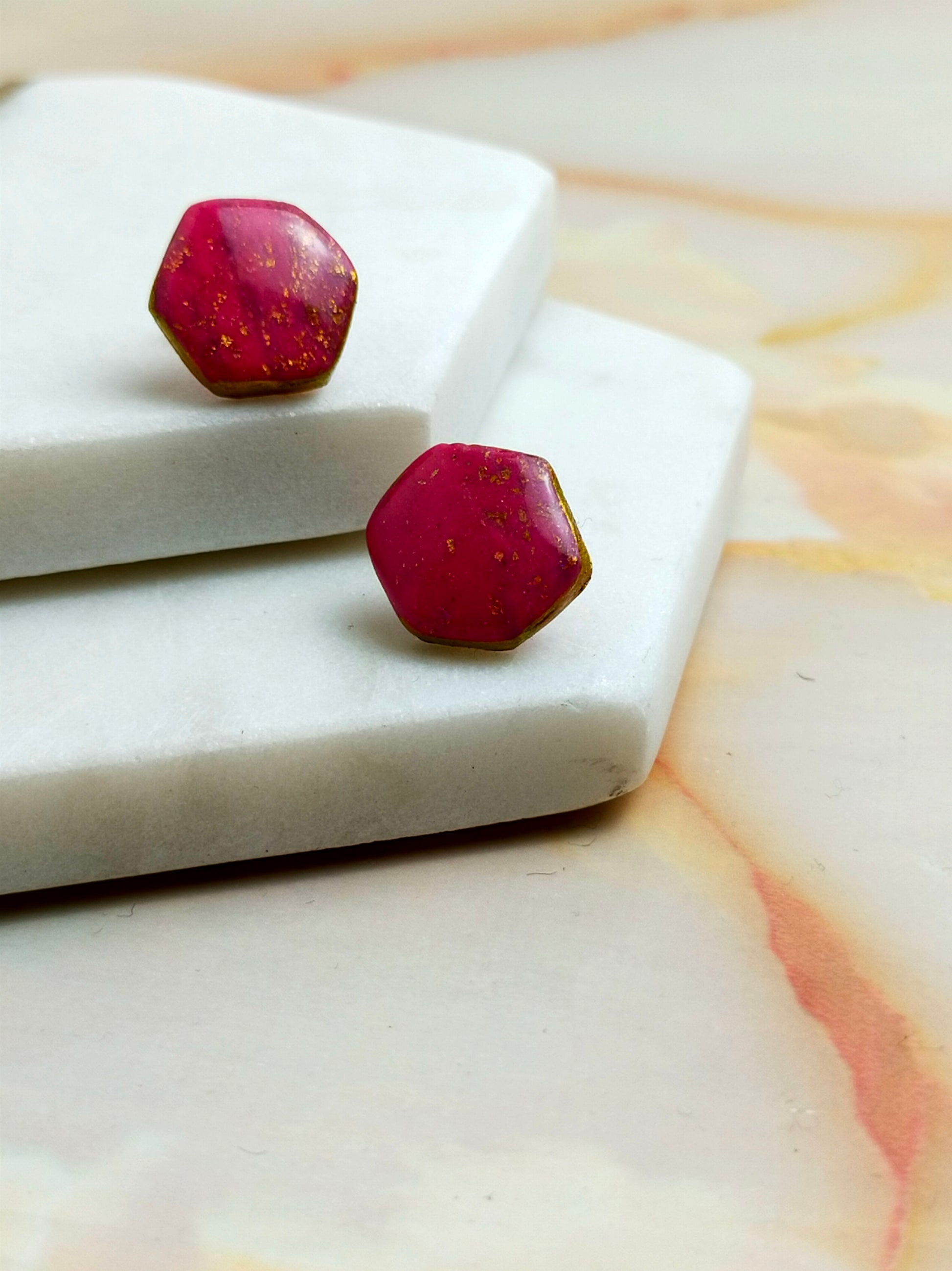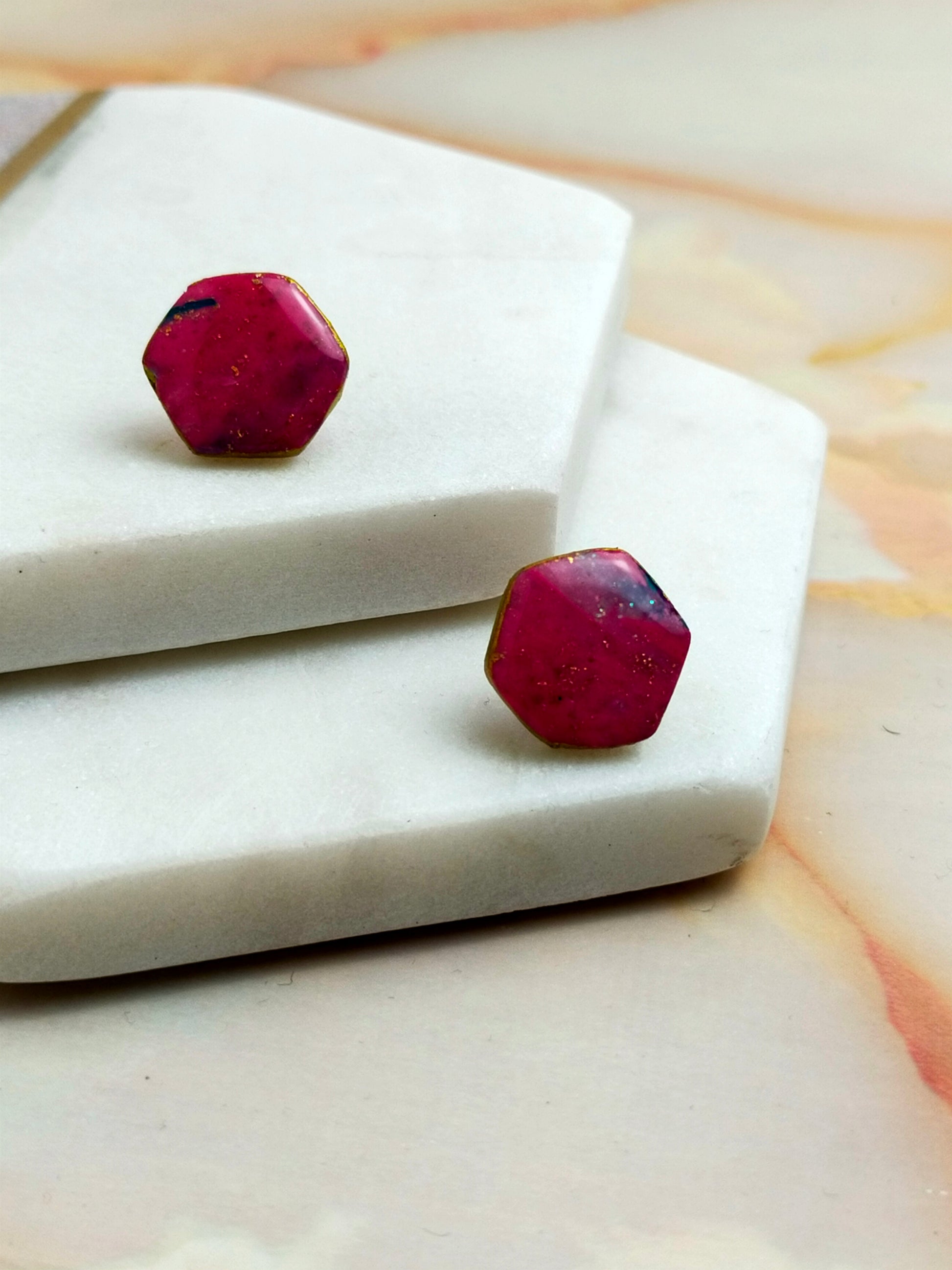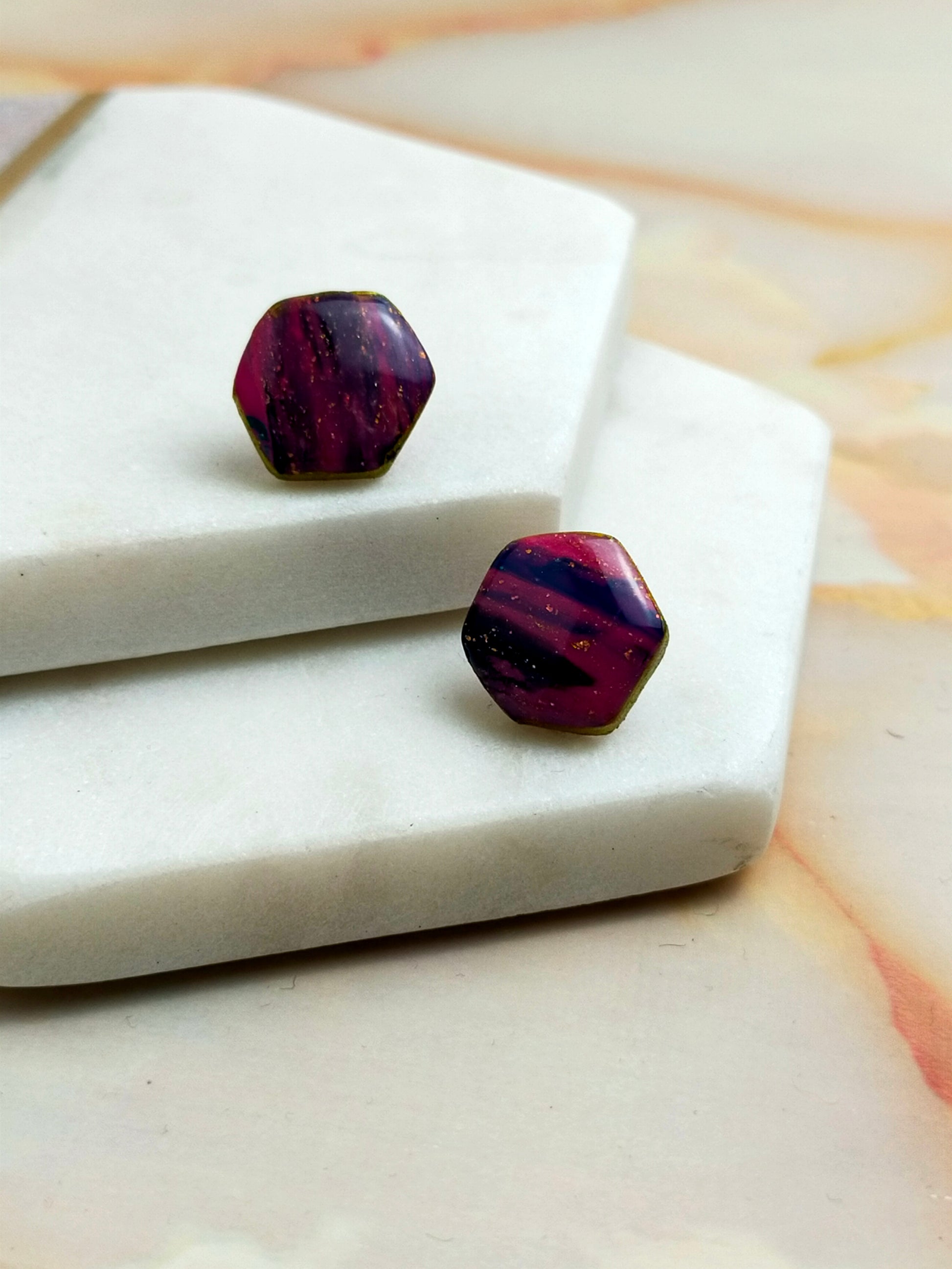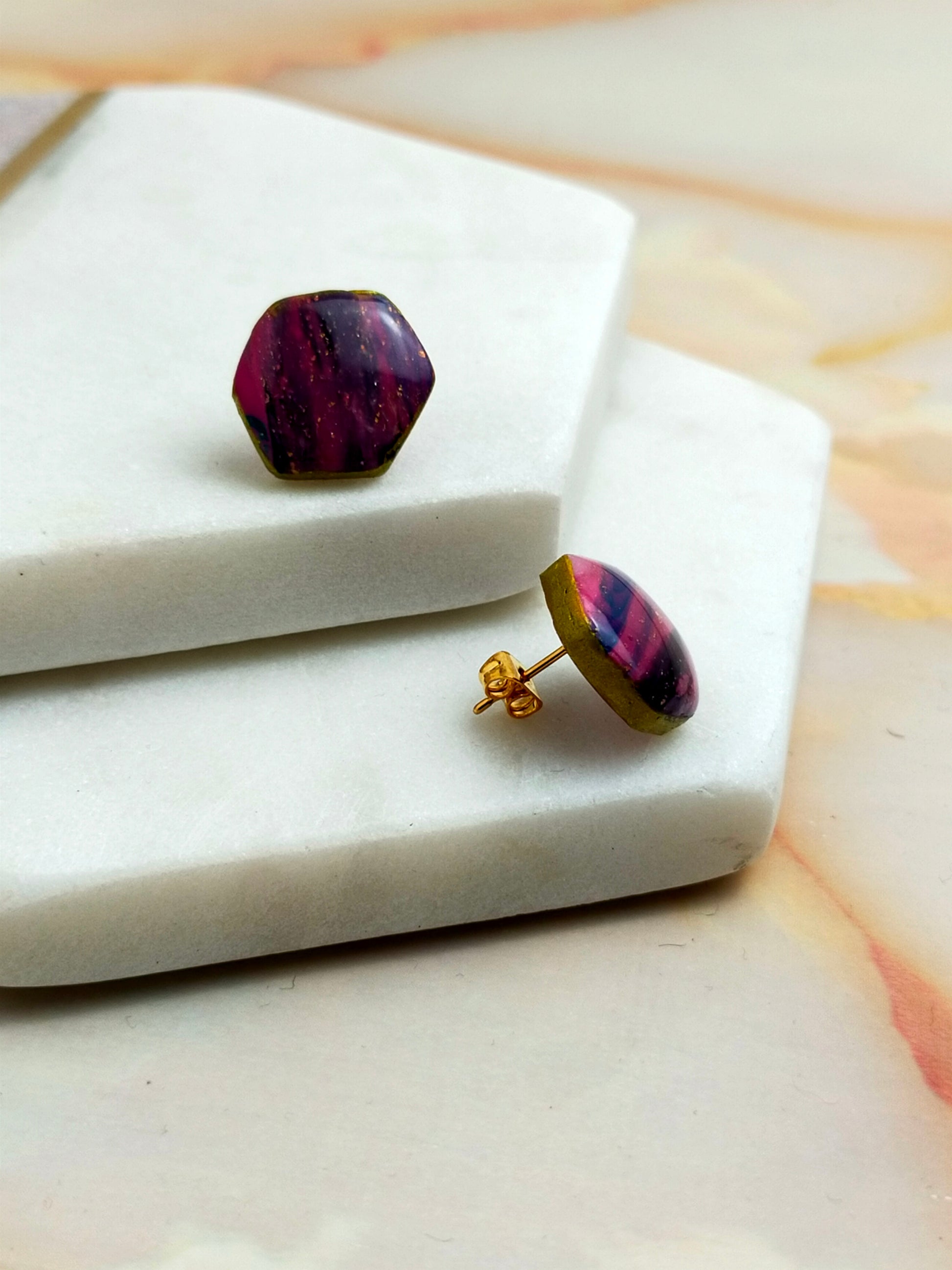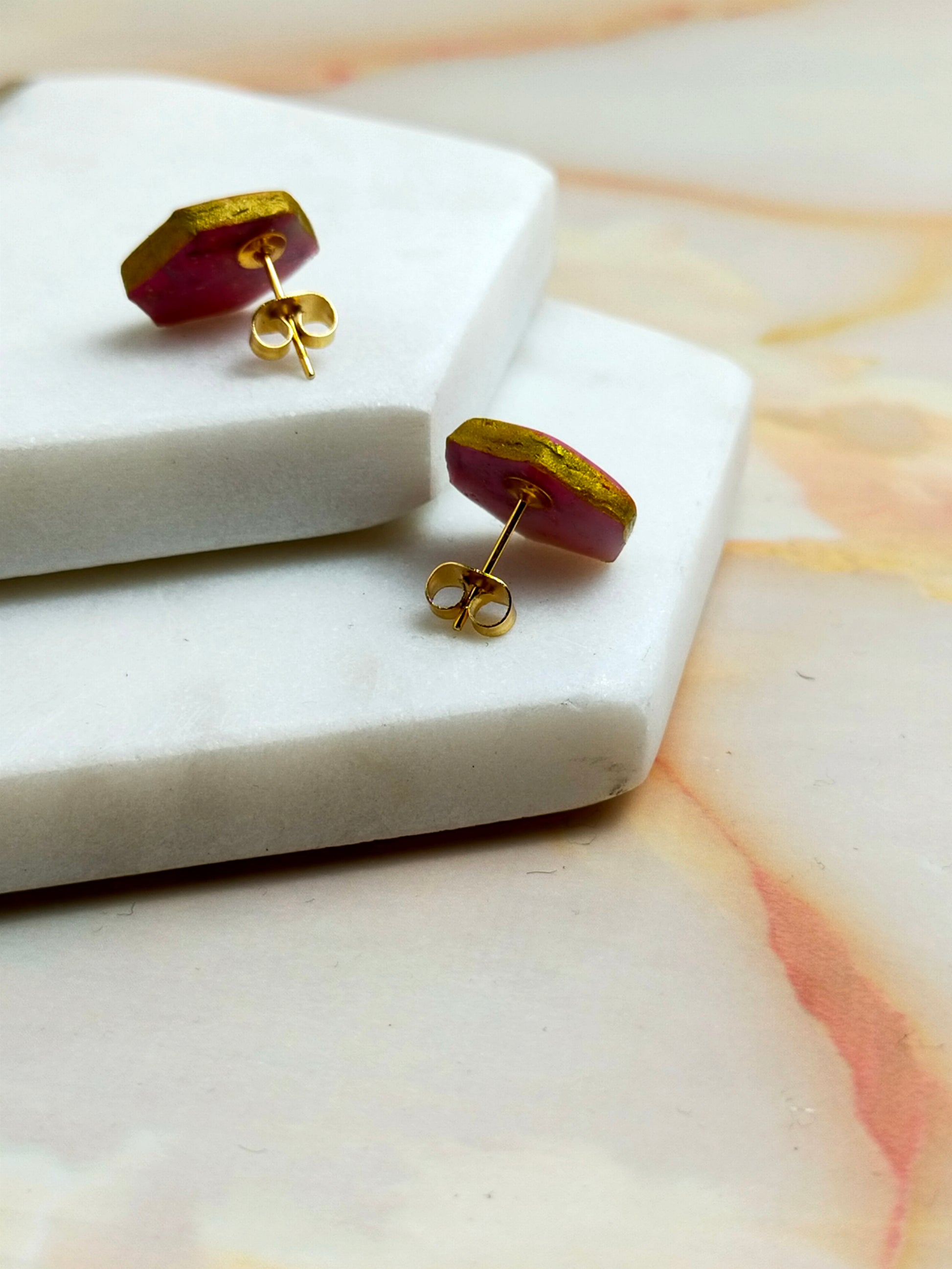 These earrings boast unique pink marbling and luxurious gold foil accents. Crafted with polymer clay and finished with resin, they are lightweight and perfect for daily wear. Each piece is carefully handmade, and the posts are available in either hypoallergenic stainless steel or gold plated.