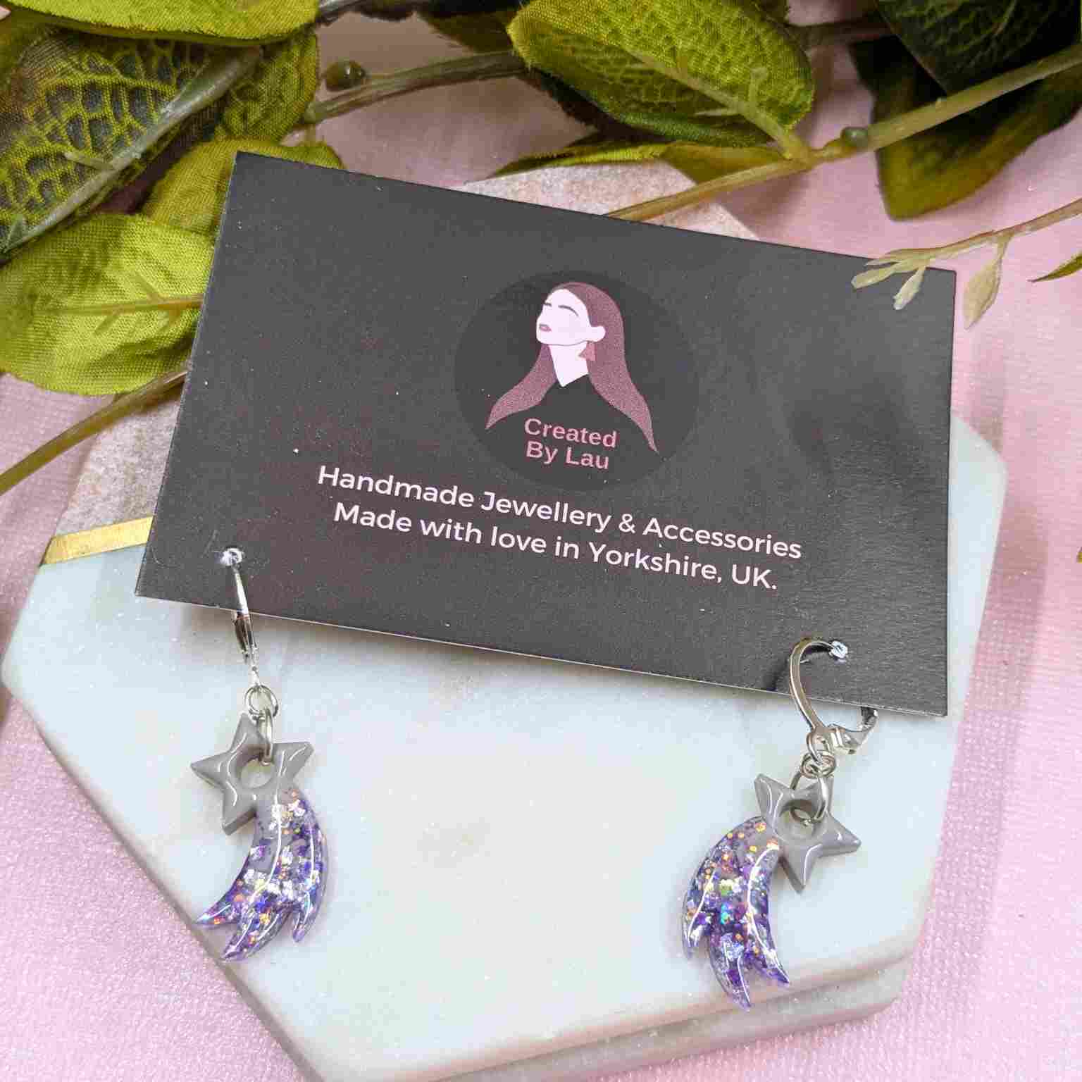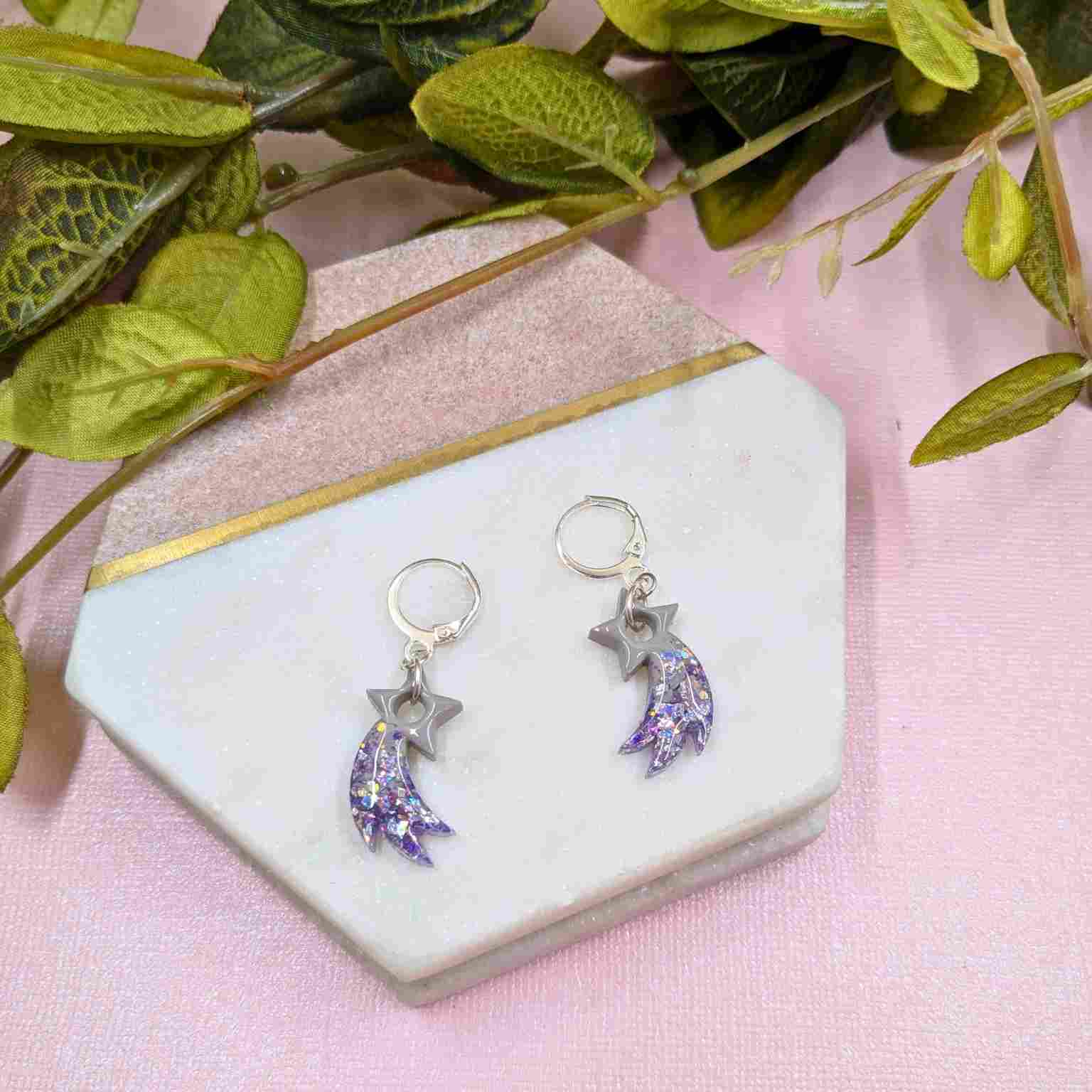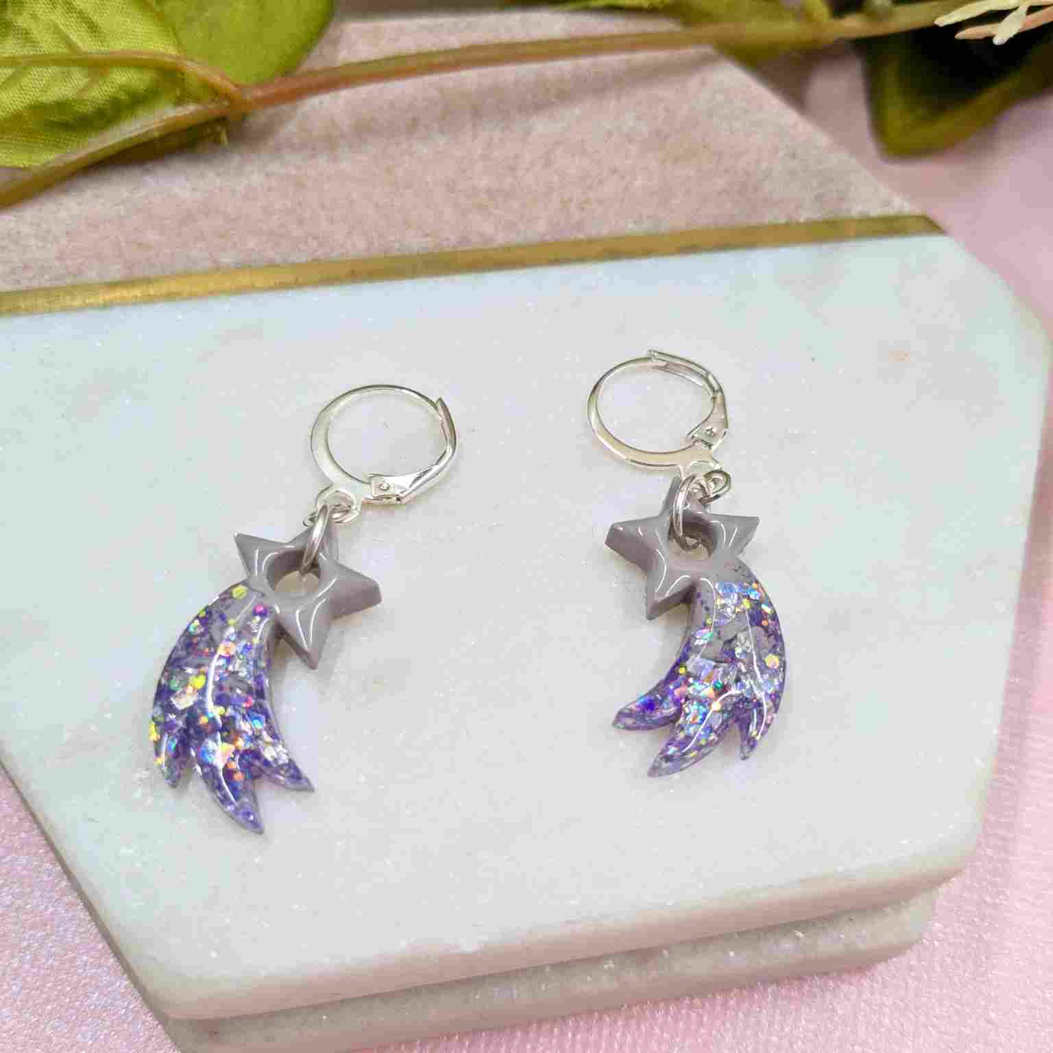 Each 1 cm charm features a mesmerizing blend of deep grey pigmented resin infused with a beautiful purple-blue glitter mix, creating a celestial sparkle that catches the light. These eye-catching shooting star charms are delicately attached to comfortable and secure silver-plated sleeper hoops, perfect for continuous wear.
