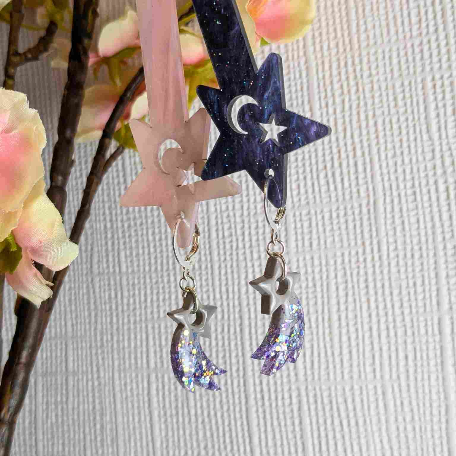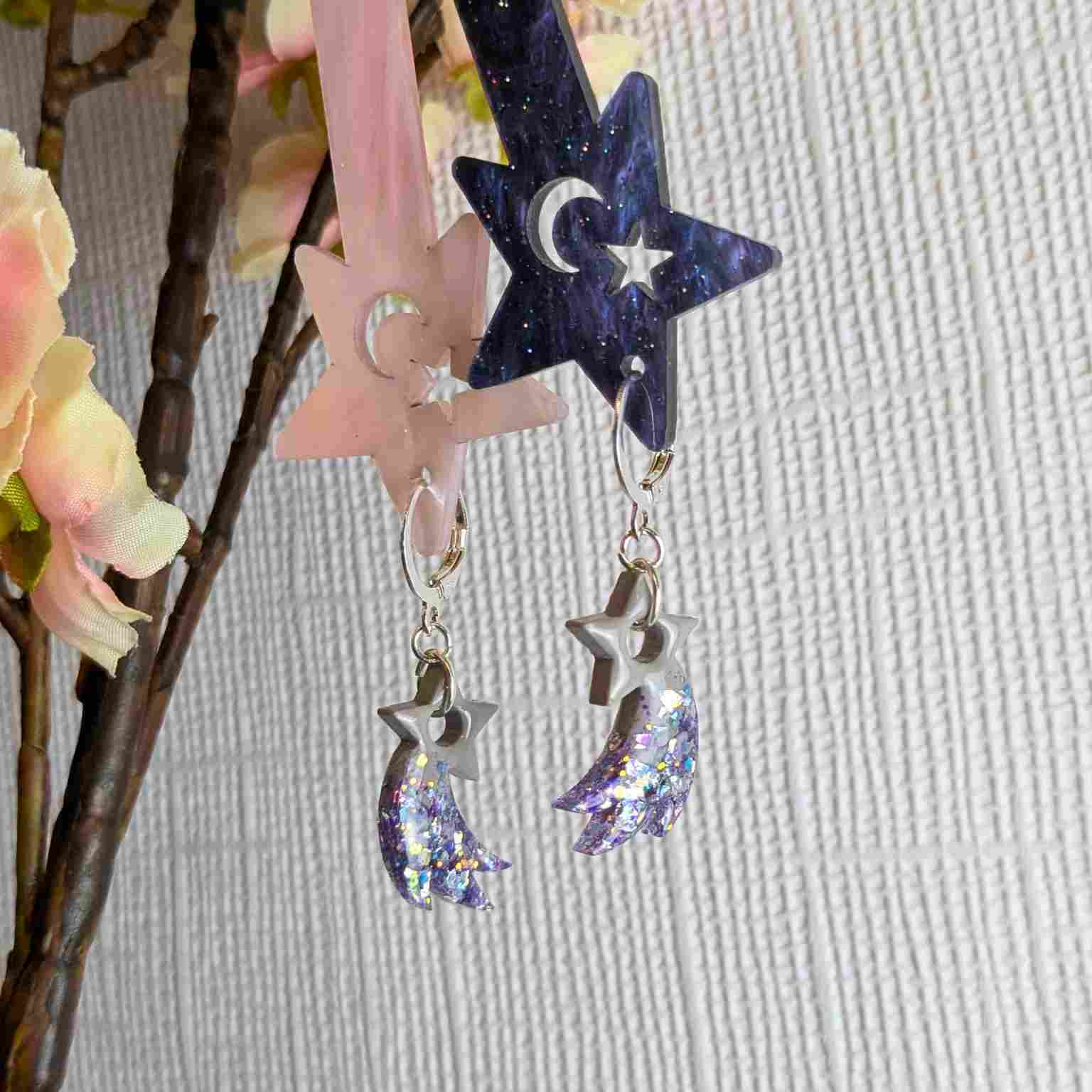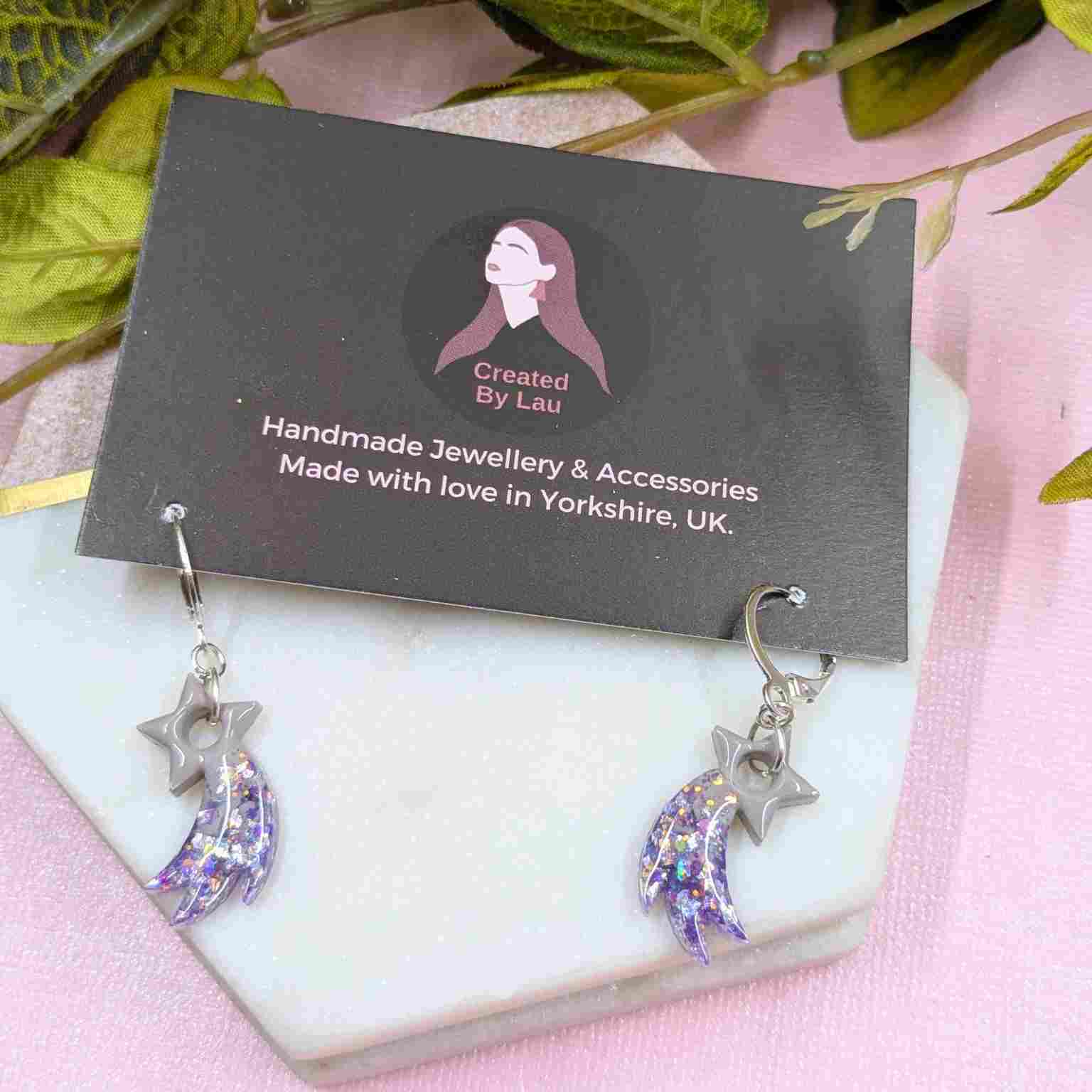 Each 1 cm charm features a mesmerizing blend of deep grey pigmented resin infused with a beautiful purple-blue glitter mix, creating a celestial sparkle that catches the light. These eye-catching shooting star charms are delicately attached to comfortable and secure silver-plated sleeper hoops, perfect for continuous wear.