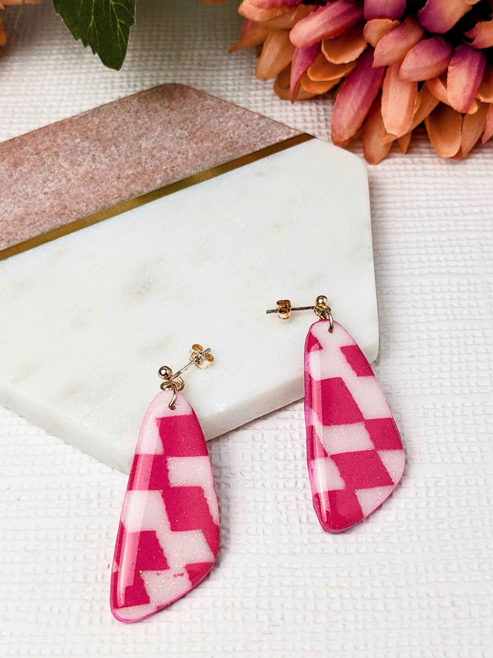 "Isabella" Pink & White Checkerboard Dangle Earrings