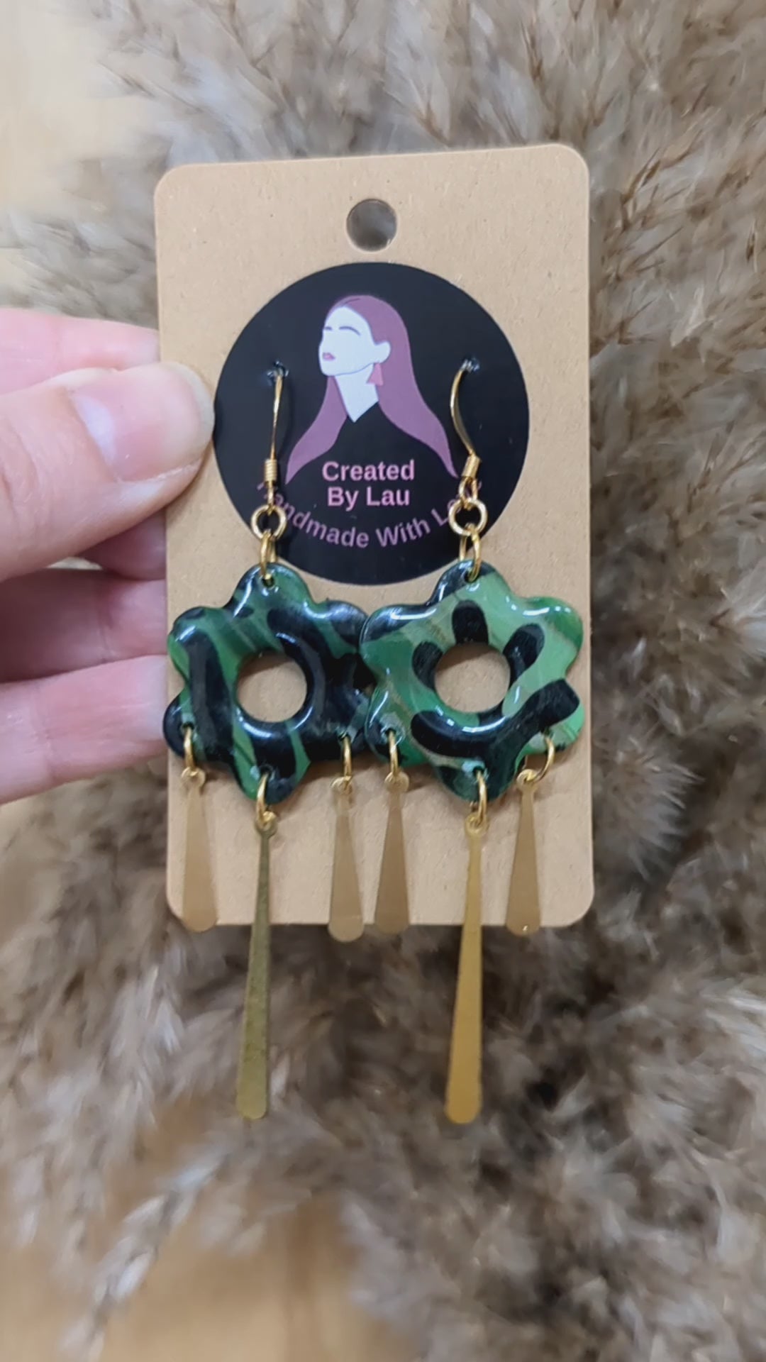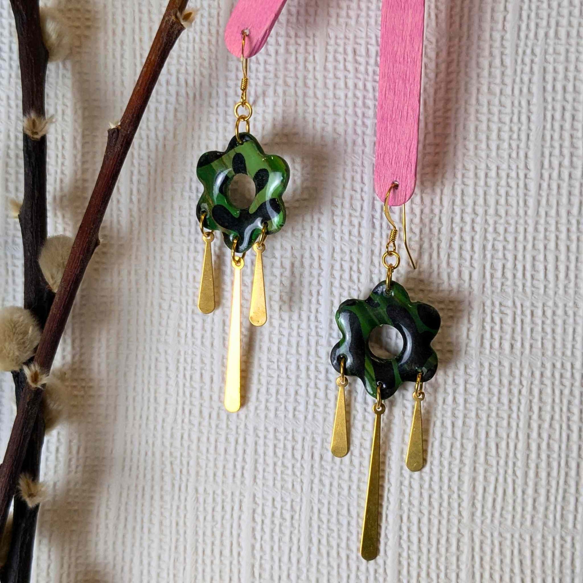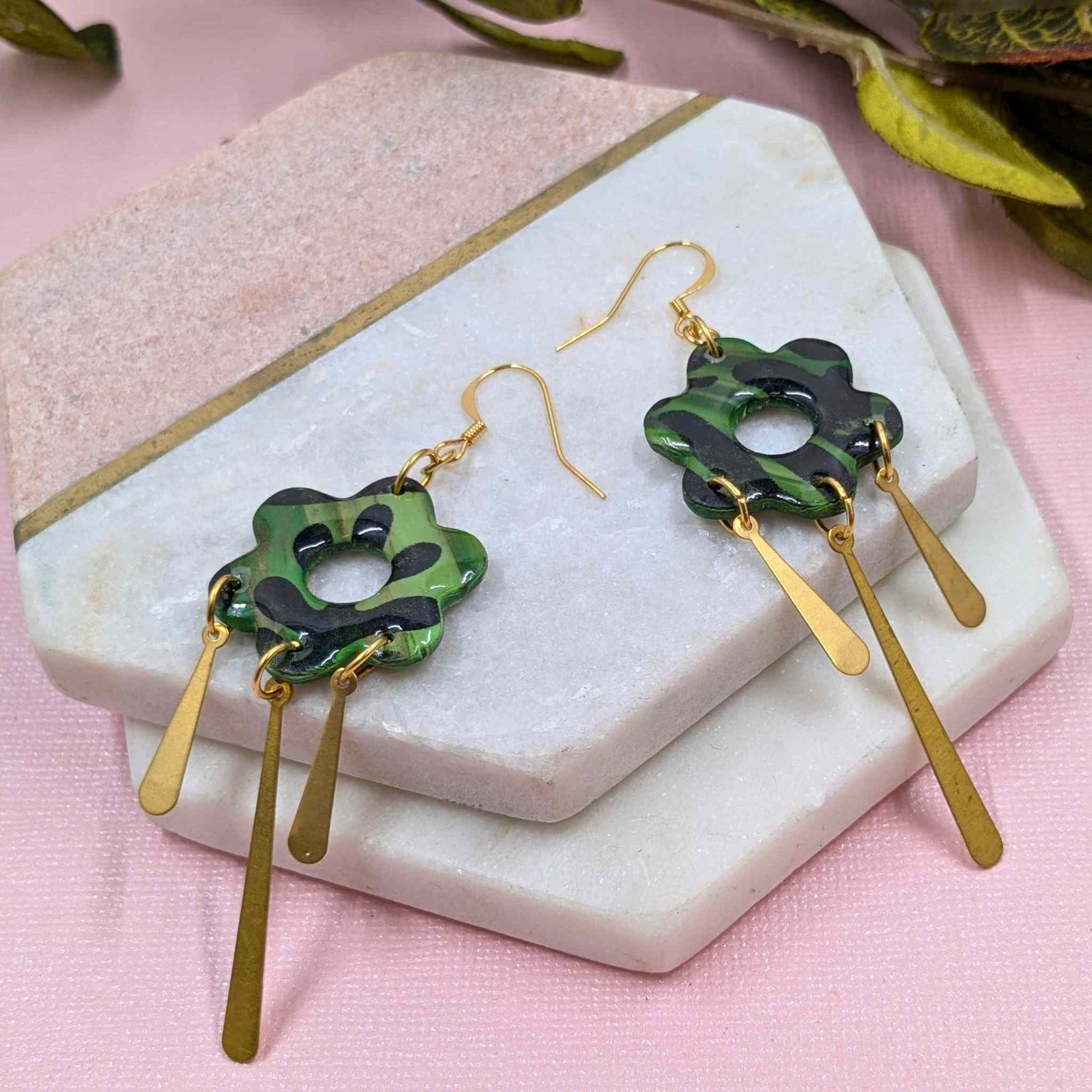 Elevate your style with the "Janelle" Black Leaf Pattern Flower Dangle Earrings. Each piece is meticulously handcrafted in our studio using green polymer clay and finished in resin, then adorned with a brass rounded teardrop charm. The intricate black leaf pattern adds a touch of elegance to these gold-plated earrings. Handmade in West Yorkshire.