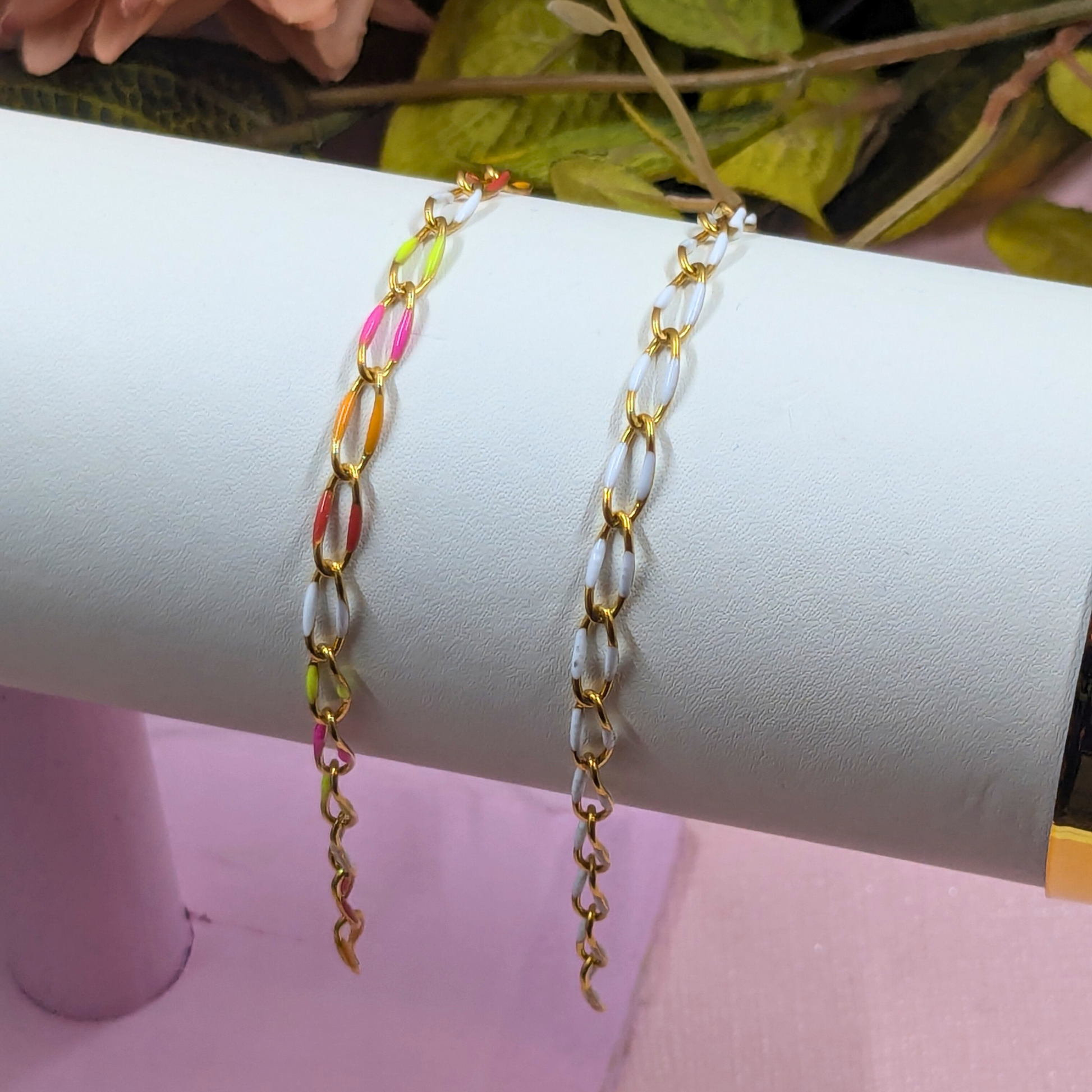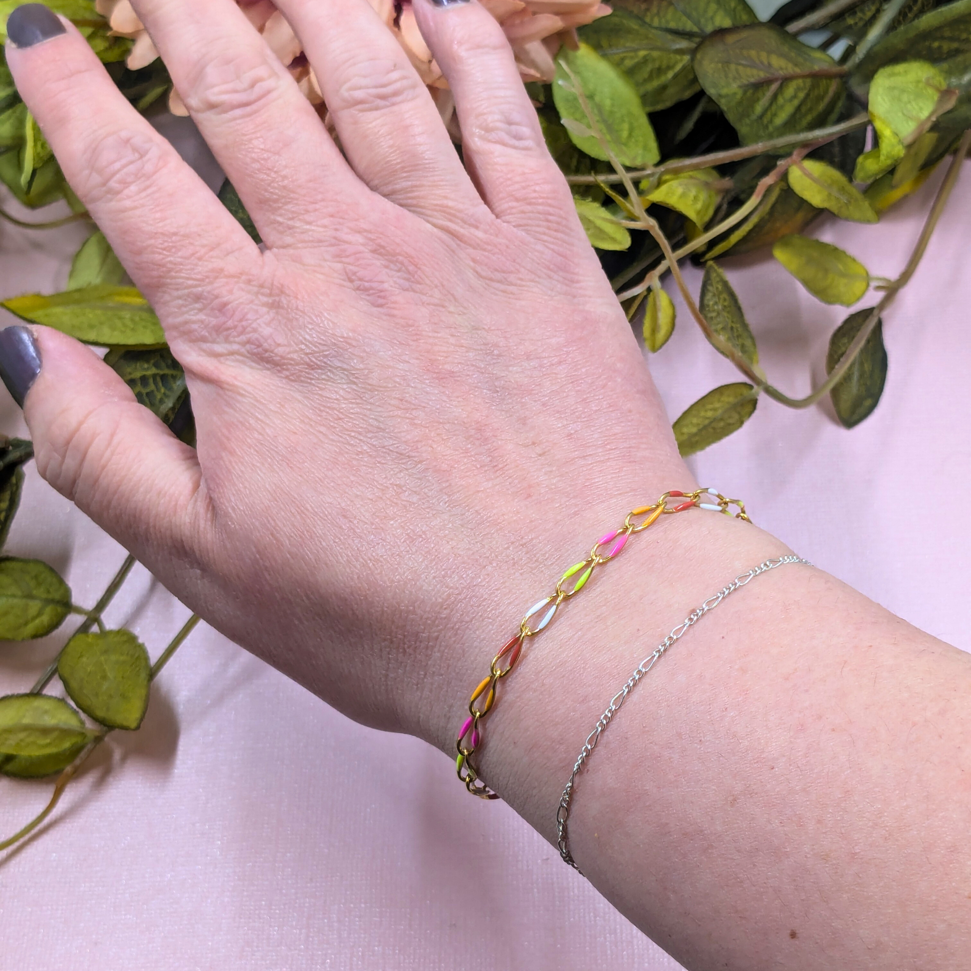 For those who adore the sleek, modern feel of permanent jewellery but crave the flexibility of a clasp, the "Kingston" Multi Colour is your perfect match. This bracelet features a chic chain adorned with eye-catching multi-colour enamel detailing, creating a truly unique and high-fashion statement piece. It’s designed to make you stand out and express your vibrant personality.