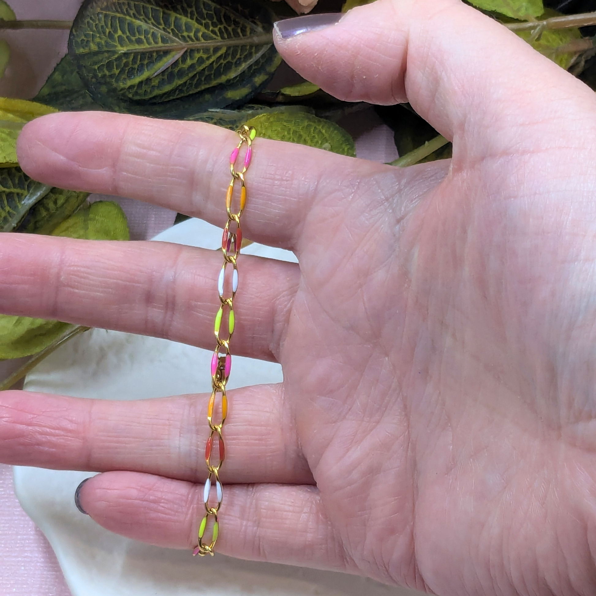 Inject a burst of joy and vibrant style into your look with the "Kingston" Stainless Steel Multi Colour Enamel Chain Bracelet, a bold new addition to our Welded Bonds Ready-to-Wear Collection. Every single one is lovingly hand-welded in my Shipley, Yorkshire studio, bringing you that unmistakable Created By Lau craftsmanship and playful fashion edge.