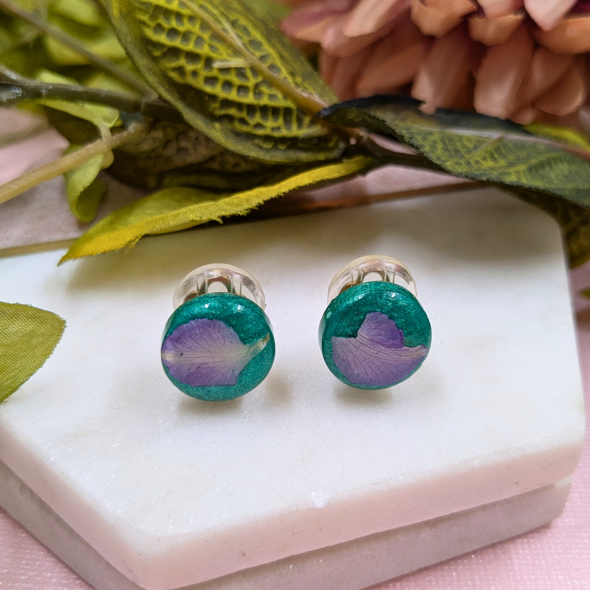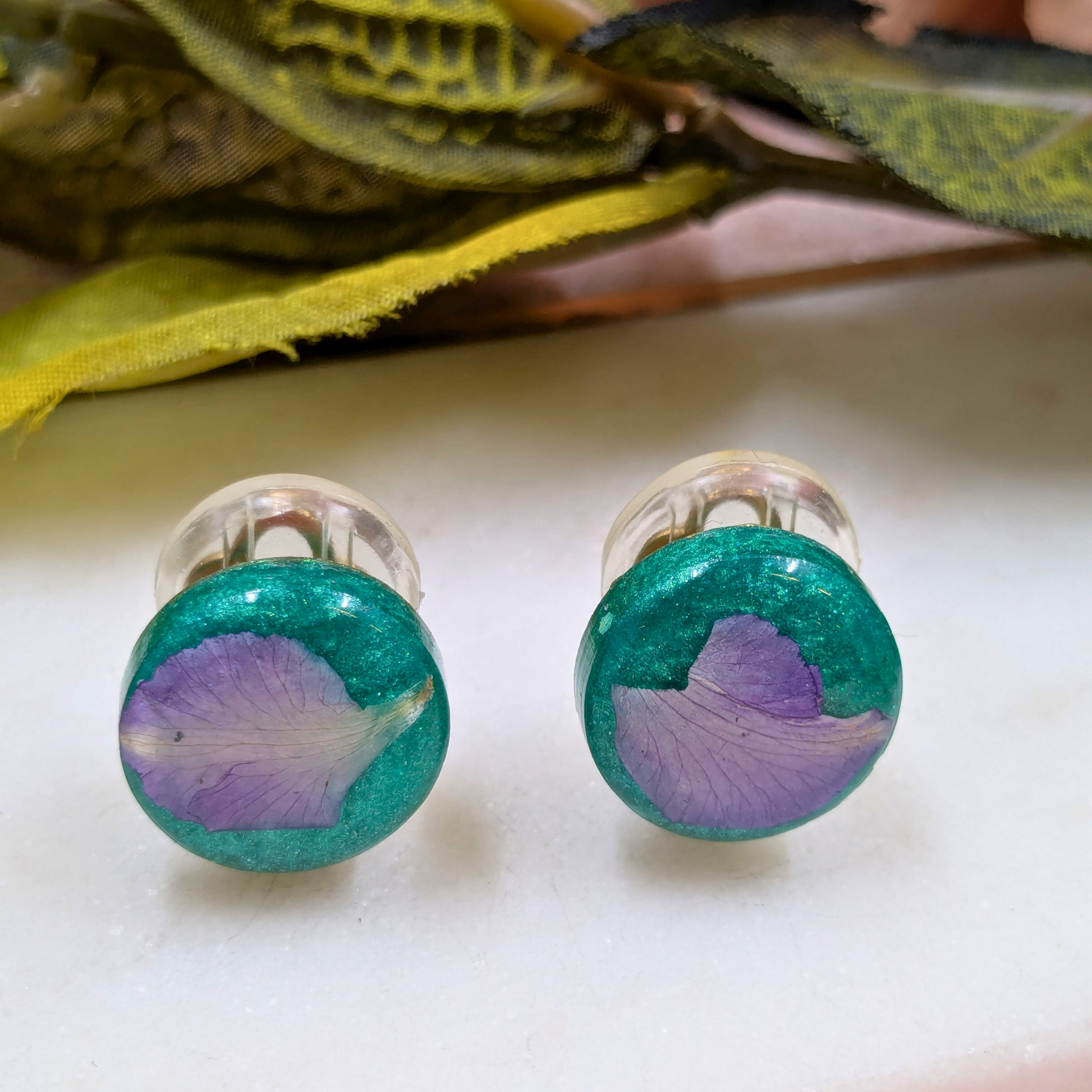 Each captivating 1.2cm piece is meticulously made from premium resin, featuring a genuine purple petal from a real flower, forever captured and preserved against a serene aqua-coloured background. This creates a stunning miniature artwork, ensuring your earrings are as individual as you are.
