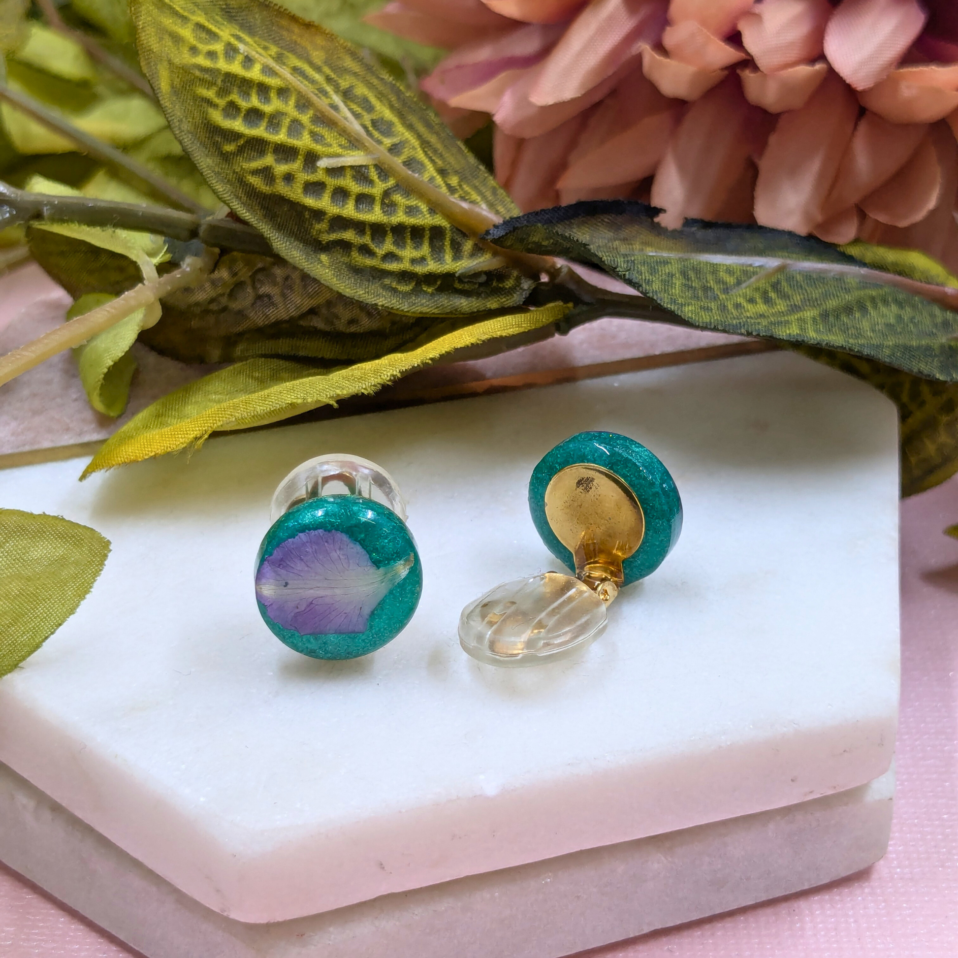Kristen Real Flowers Purple Petal on Aqua Clip On Earrings | Unique Resin Jewellery by Created By Lau