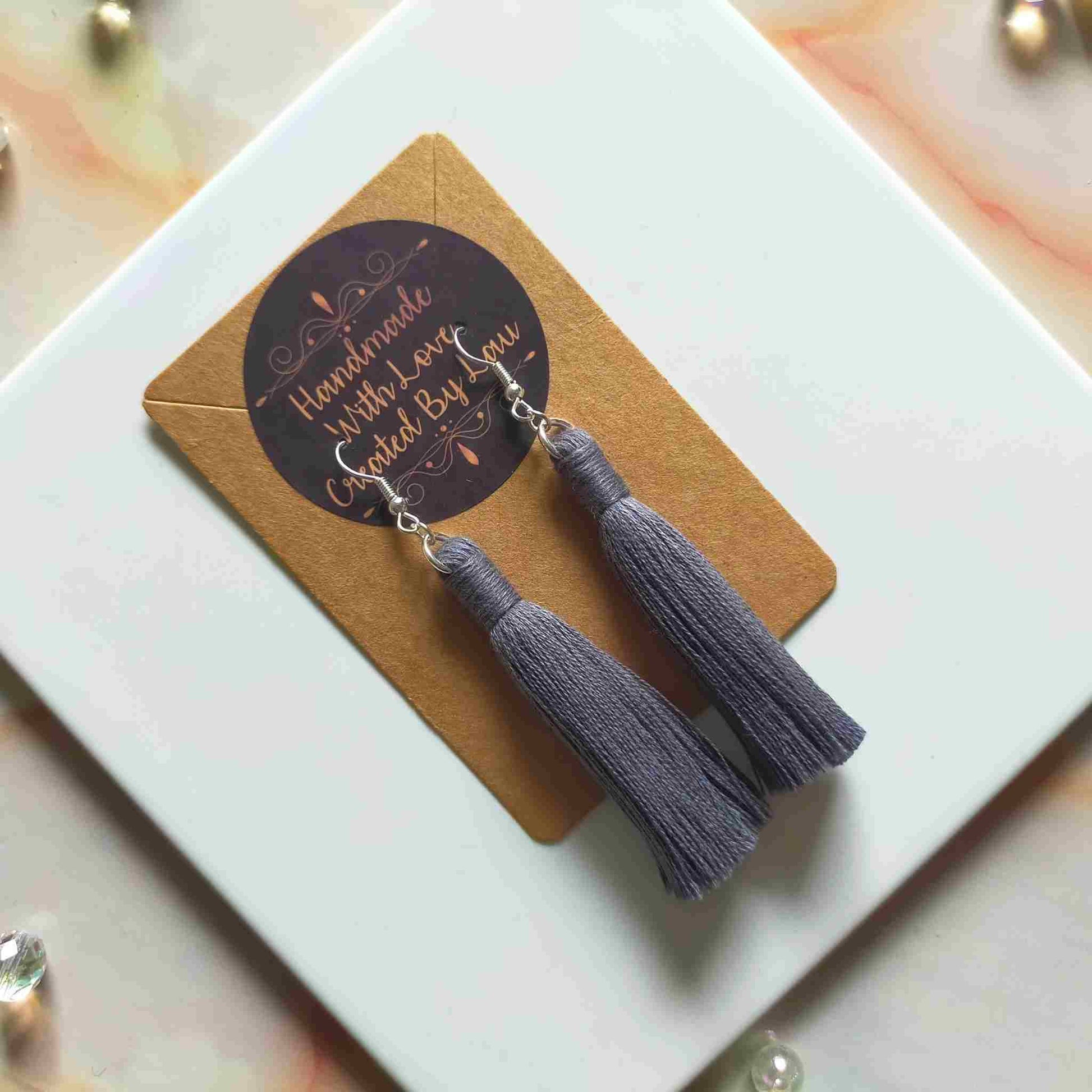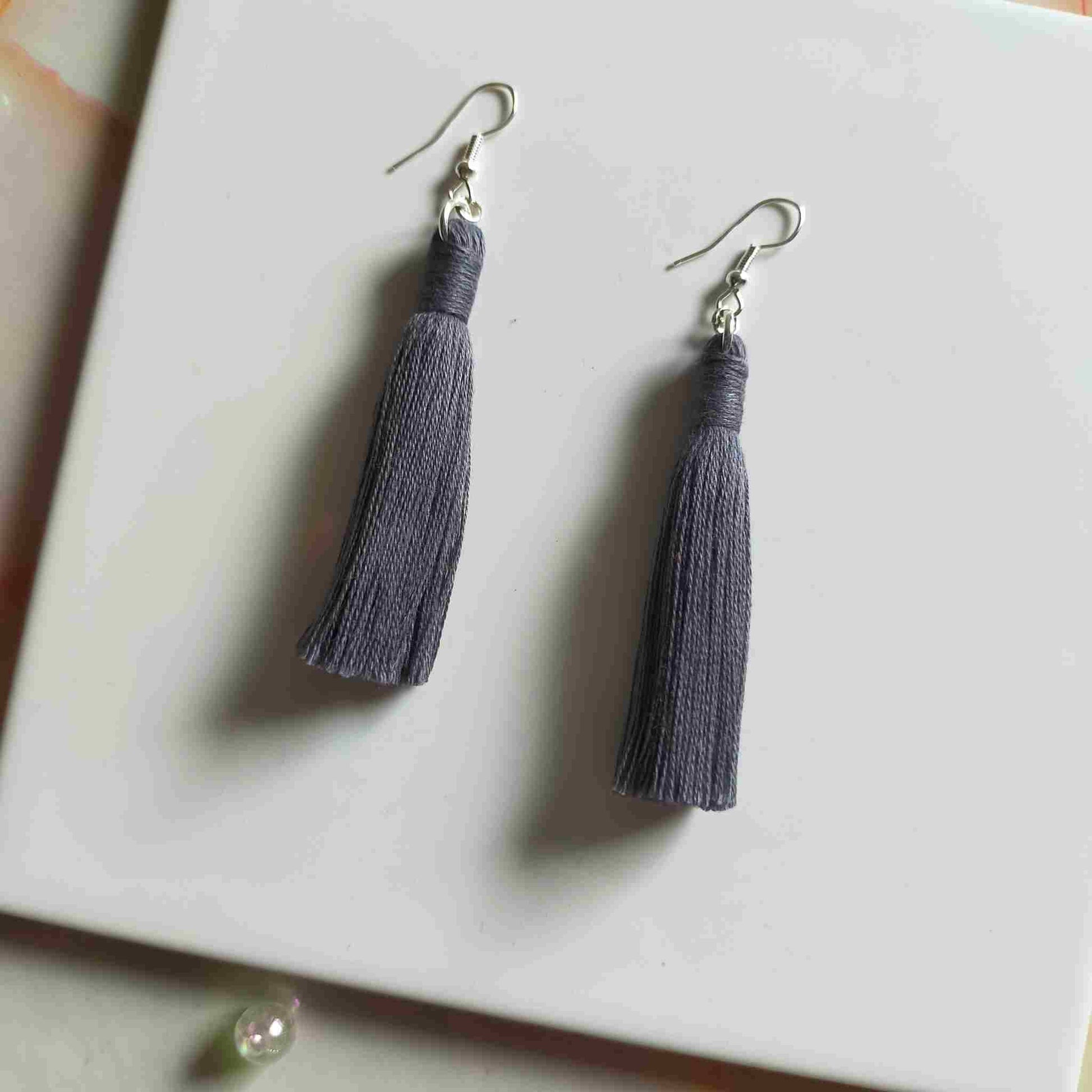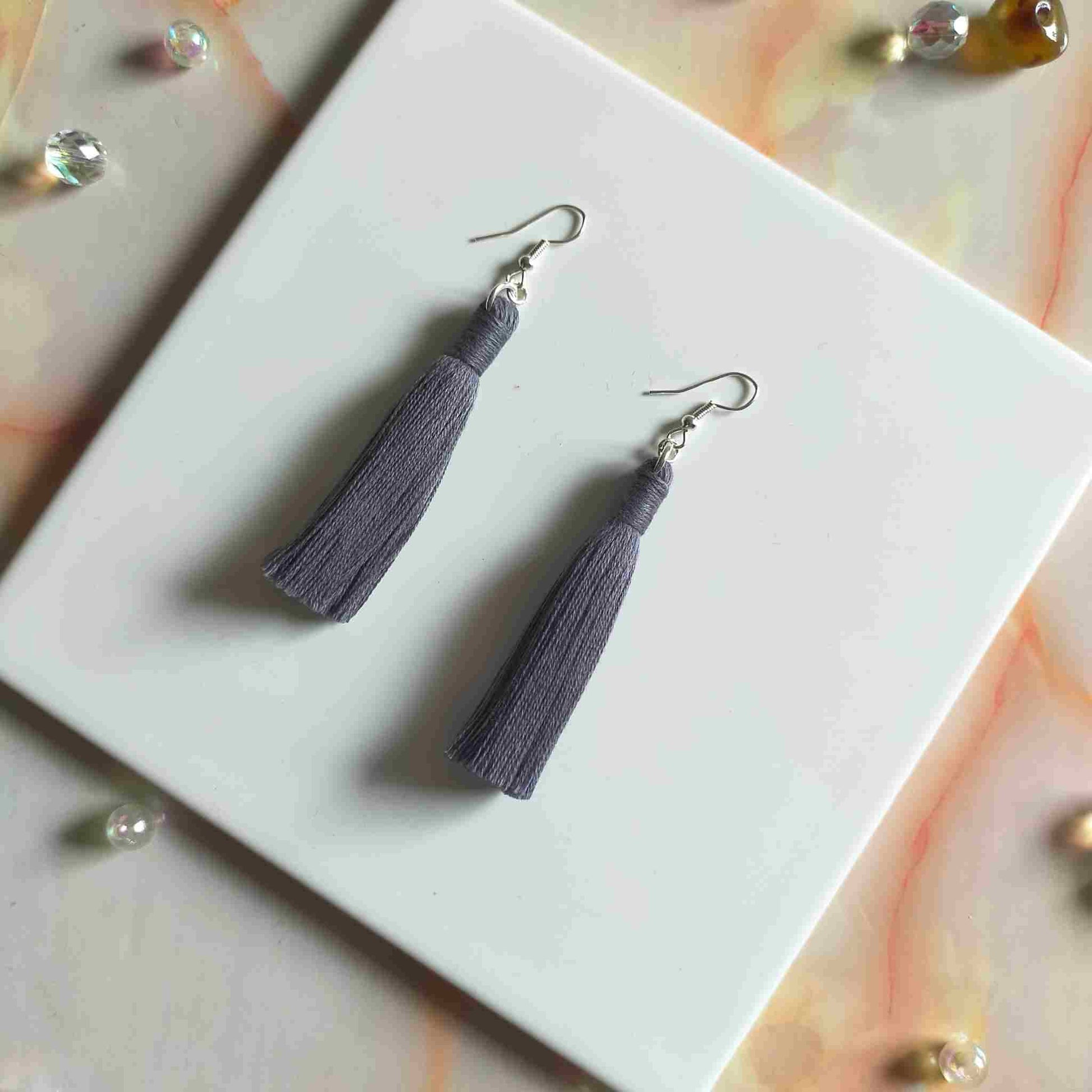 "Lia" Grey Silver Plated Cotton Macramé Tassel Earrings