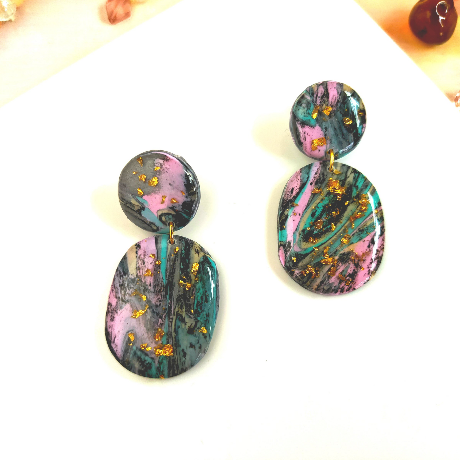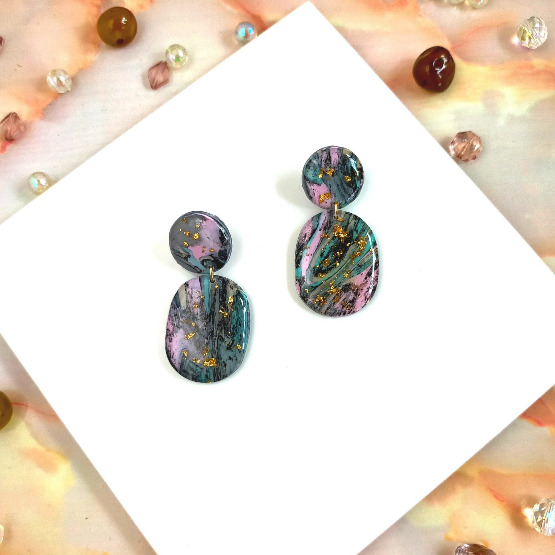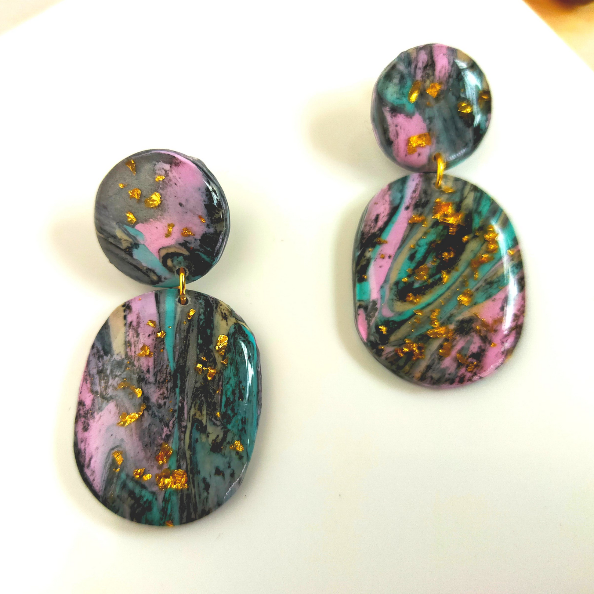 The "Edna" uses a circle and oval made from faux marbled polymer clay uses blue, pink, grey and beige colours with gold leaf to create a unique style. Due to this each piece being individual, each style has been matched as best as possible to make a pair.