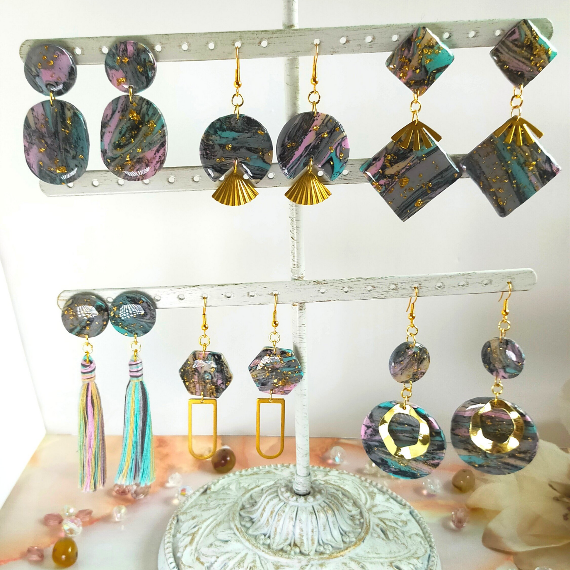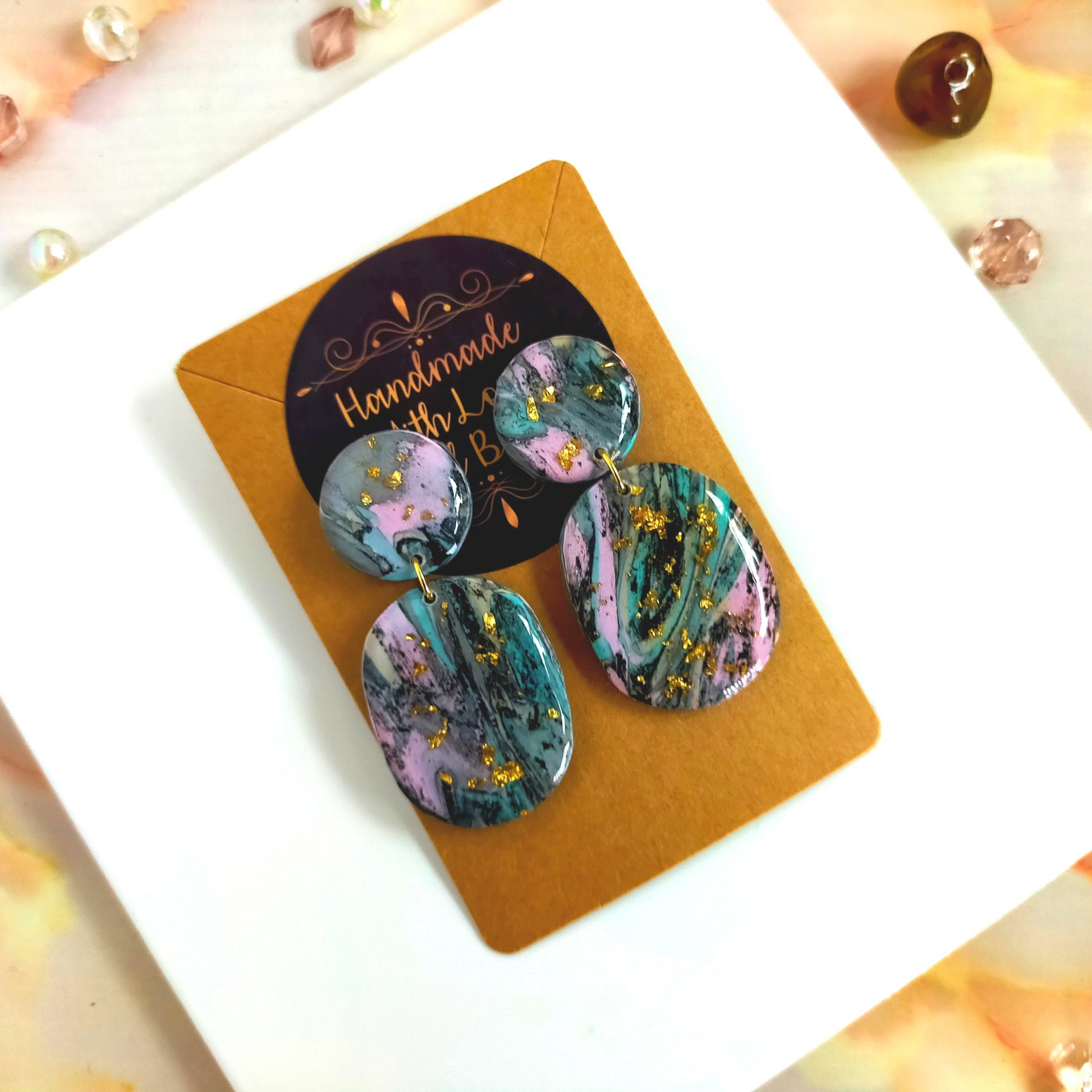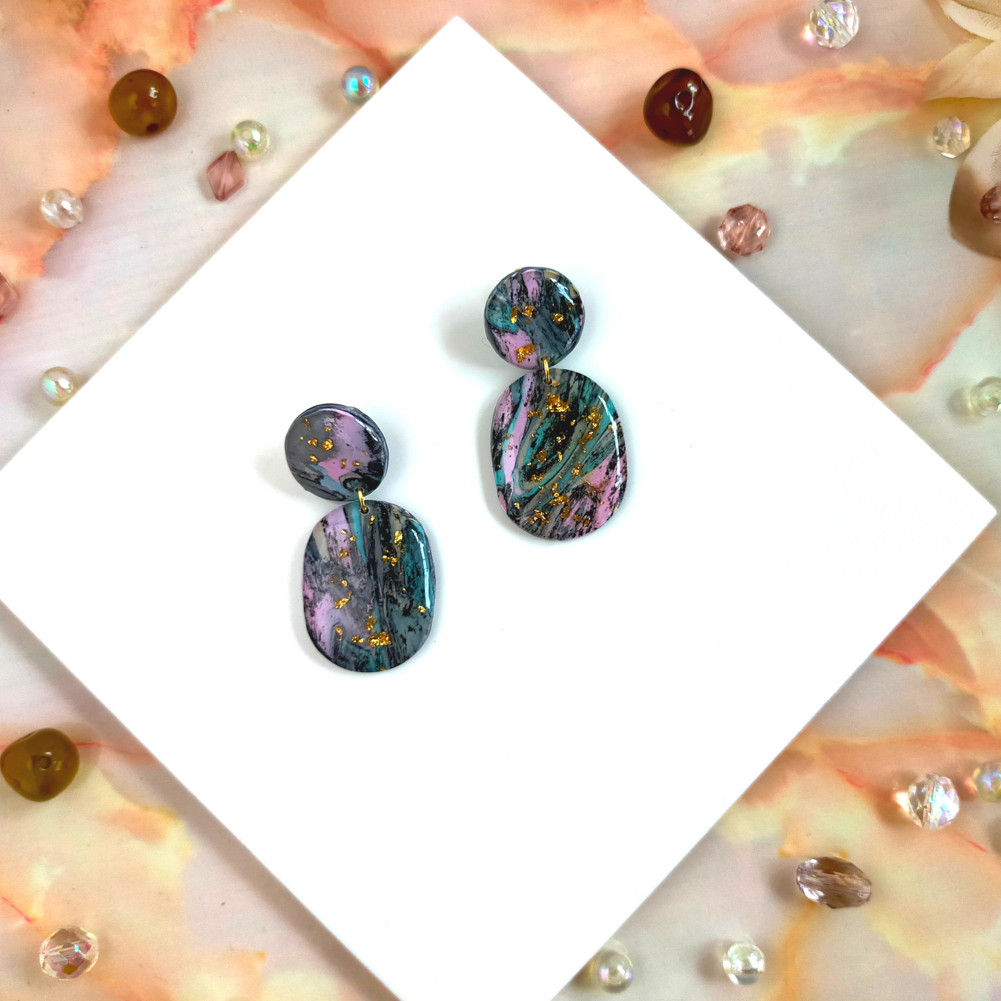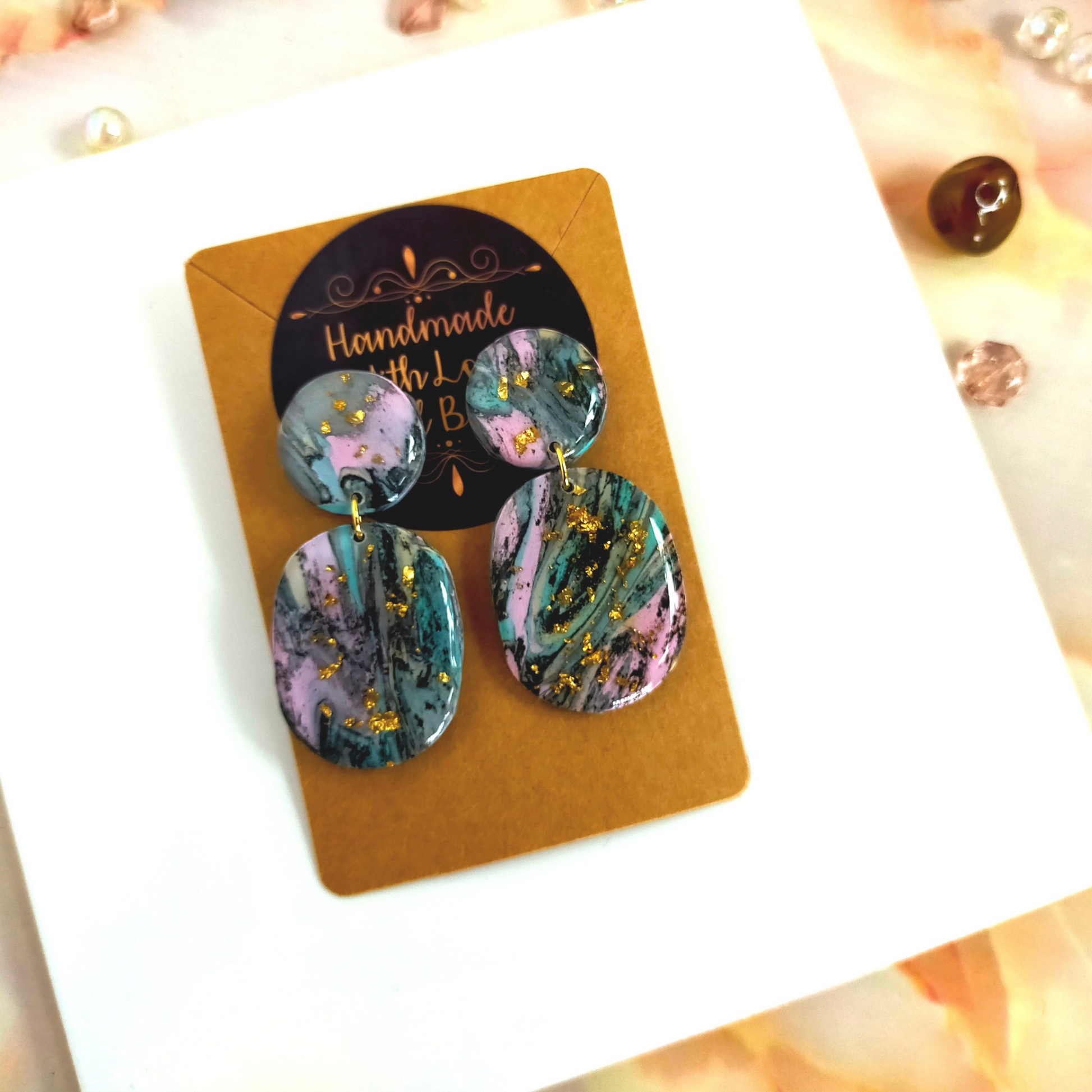 The "Edna" uses a circle and oval made from faux marbled polymer clay uses blue, pink, grey and beige colours with gold leaf to create a unique style. Due to this each piece being individual, each style has been matched as best as possible to make a pair.
