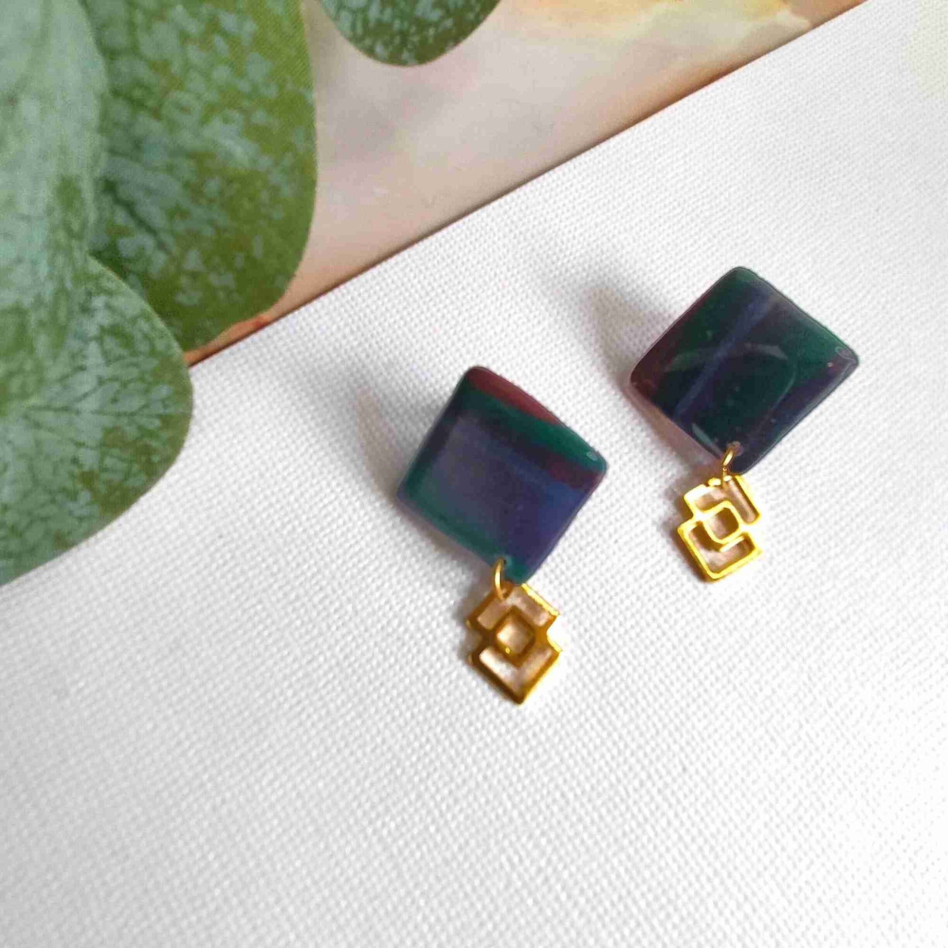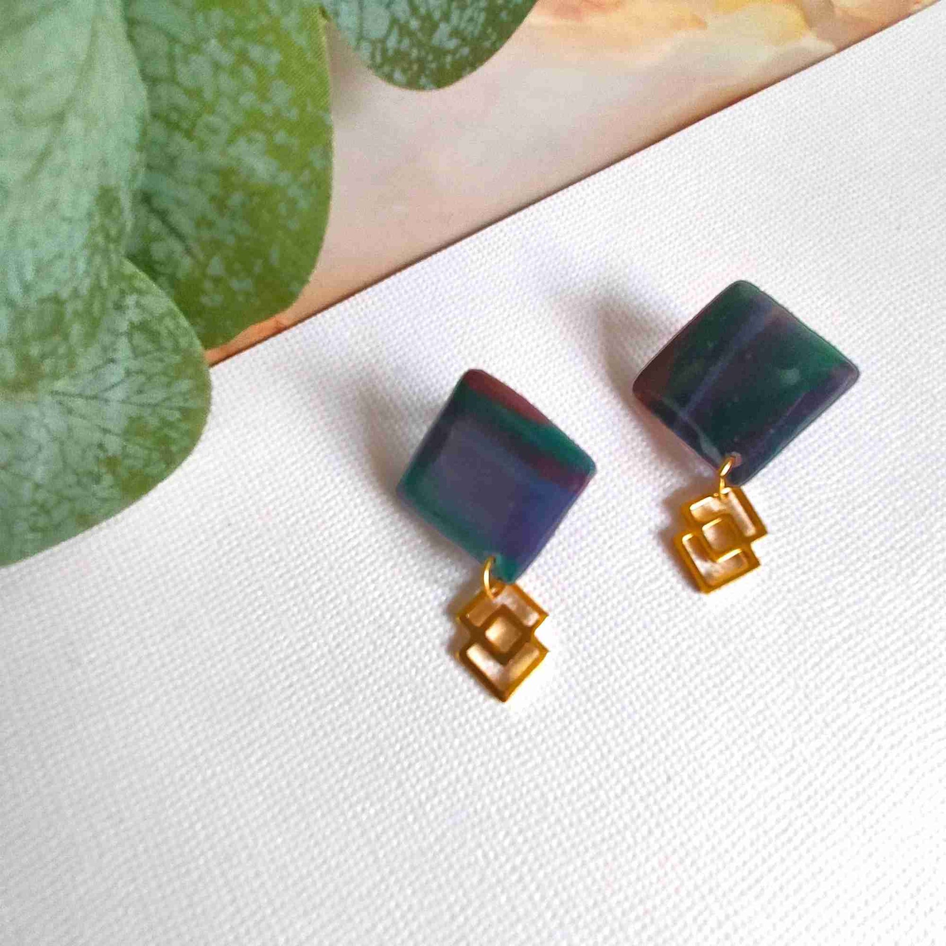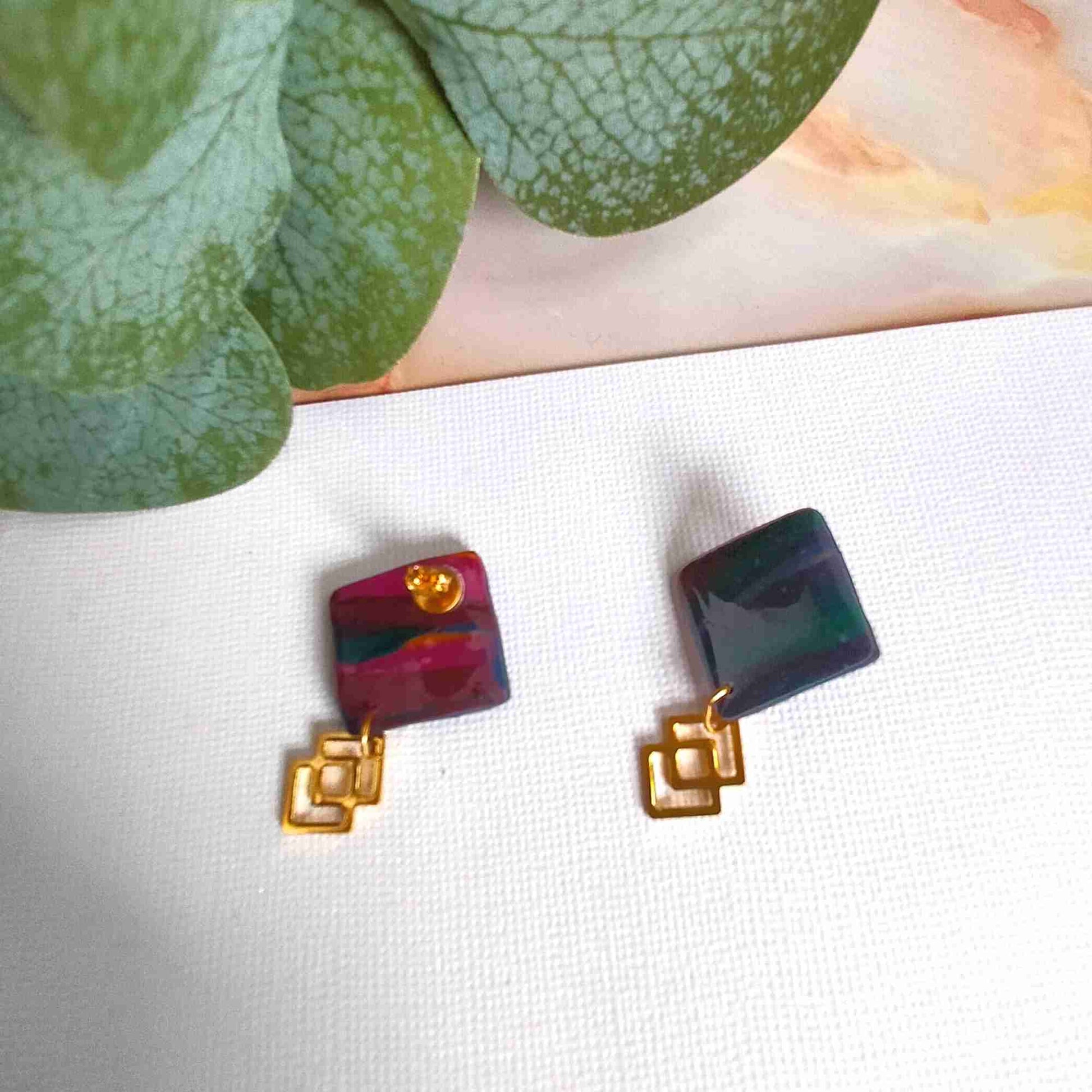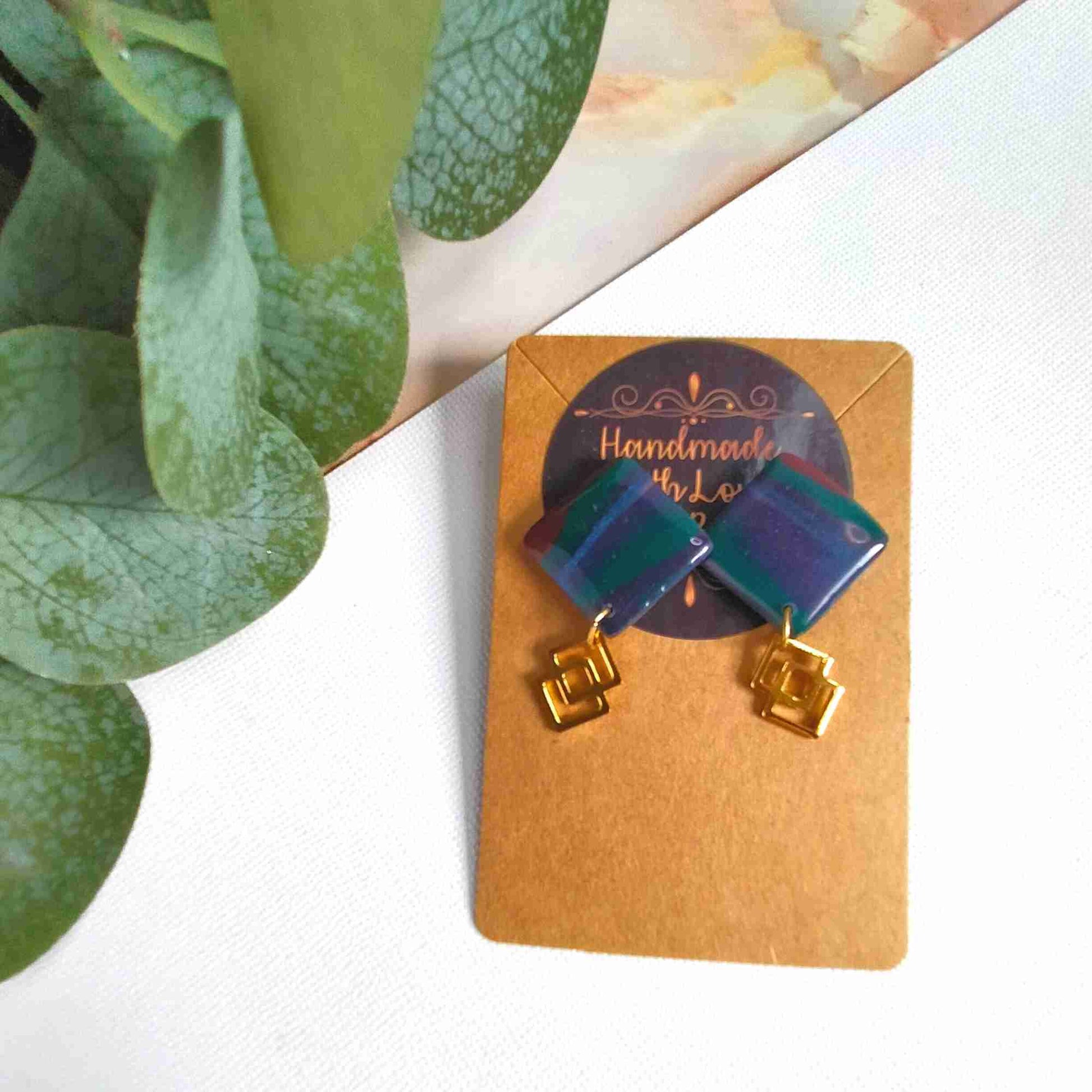 These lovely earrings are handmade from polymer clay. They have a square shape that has been mounded in a diamond shape and completed with a gold stainless steel square interlinked charm which sits in the bottom of the earrings making them perfect for everyday wear, that little bit special for evening wear or an evening on the town.