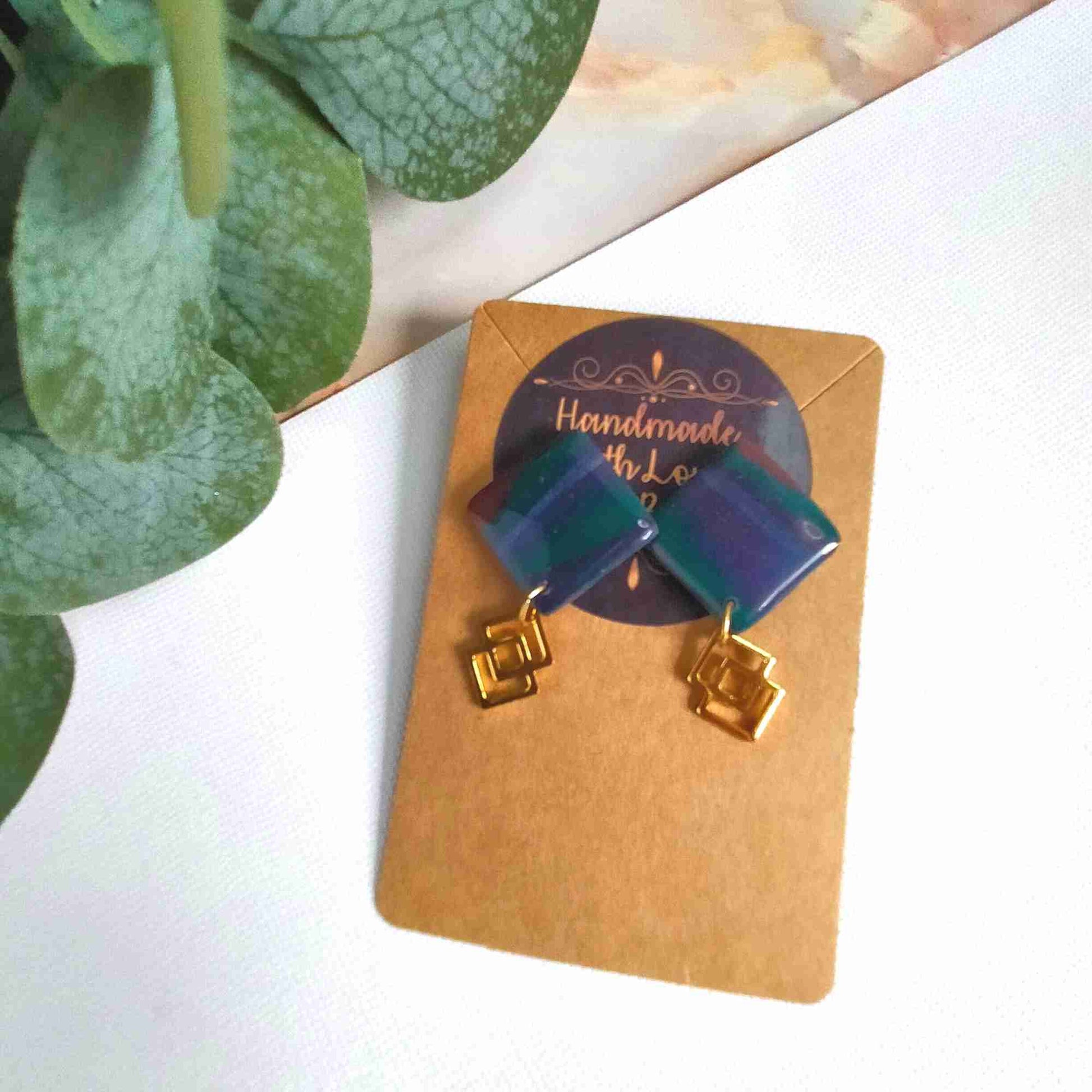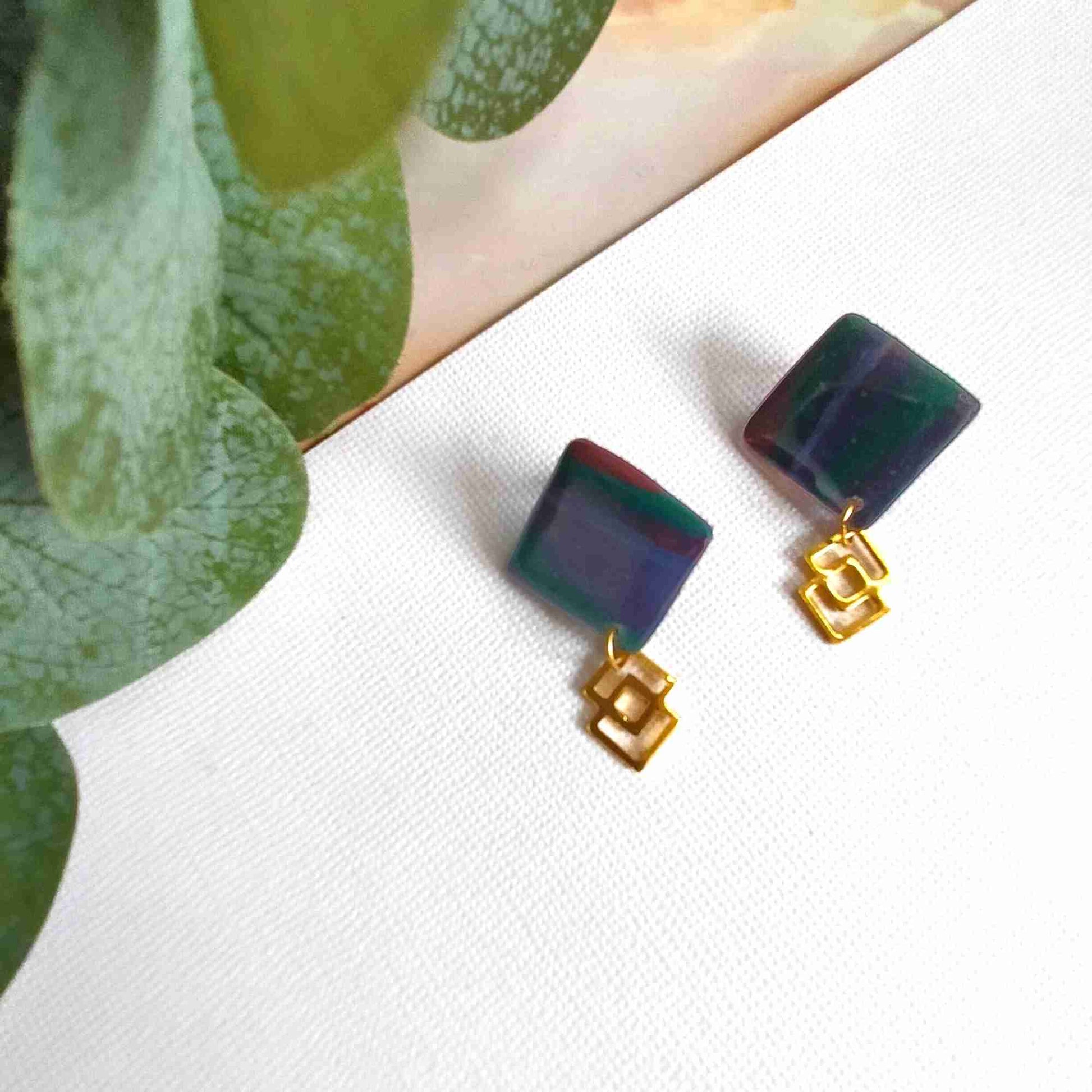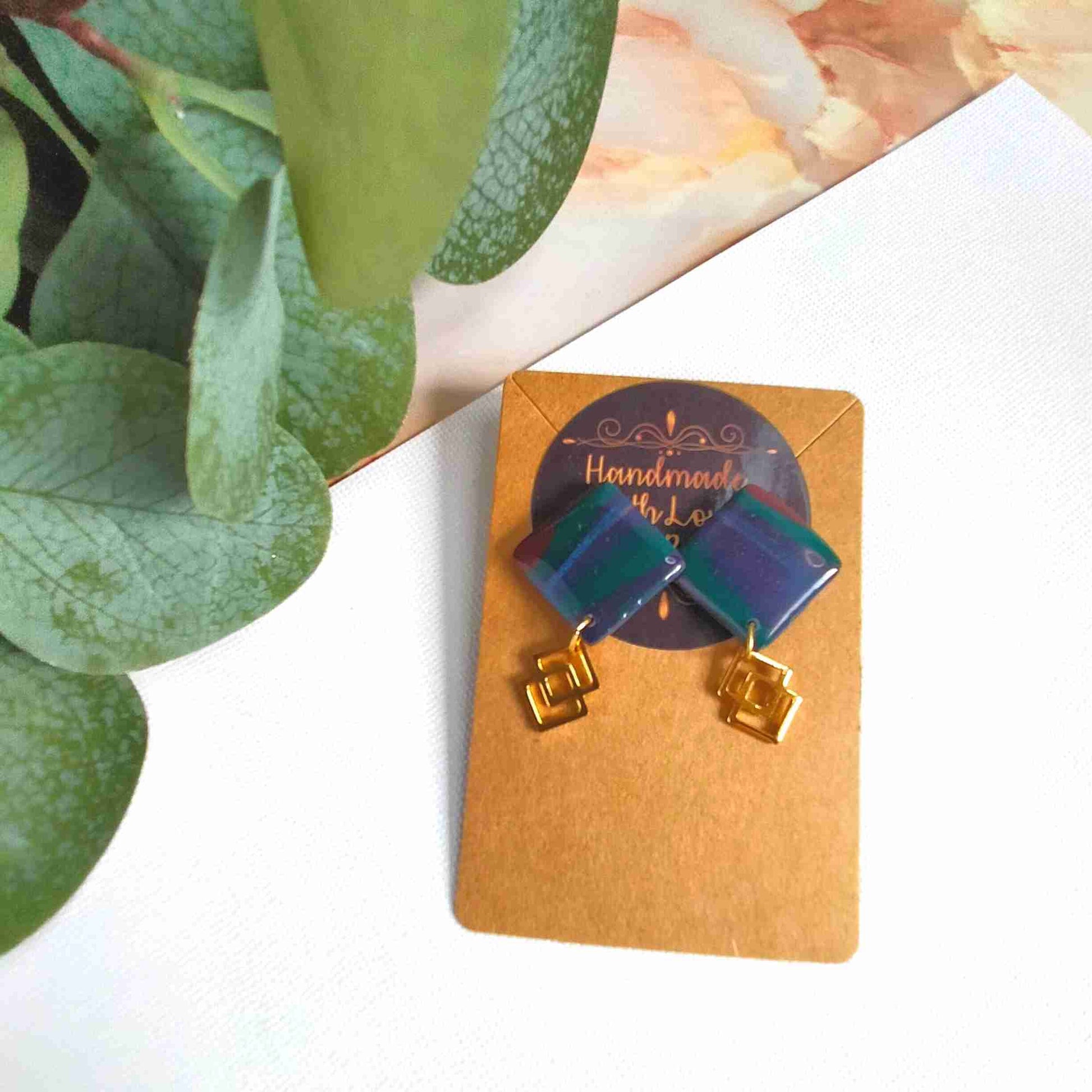 These lovely earrings are handmade from polymer clay. They have a square shape that has been mounded in a diamond shape and completed with a gold stainless steel square interlinked charm which sits in the bottom of the earrings making them perfect for everyday wear, that little bit special for evening wear or an evening on the town.